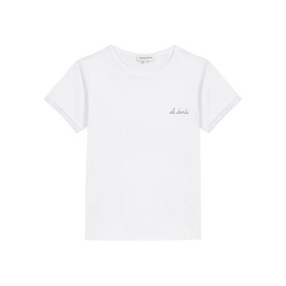 Our timeless Poitou men's T-shirt has a slim fit, cuffs at the bottom of the sleeves and a neckline finished with edge-to-edge gluing. Its embroidery is for those who love it just right.