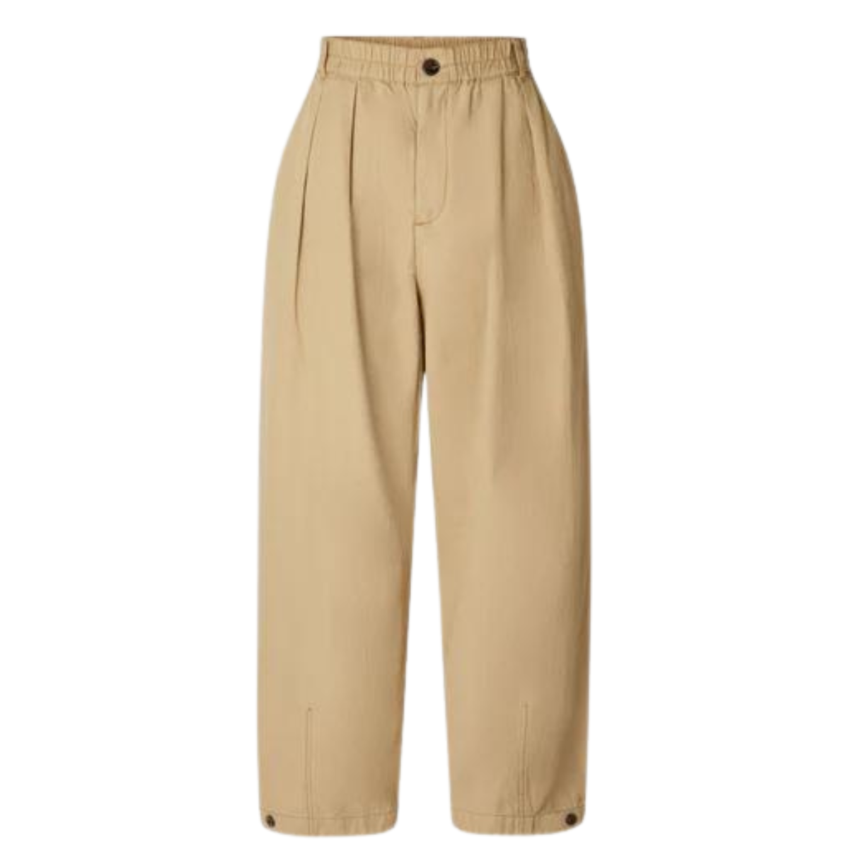 - Loose fit, rounded and slightly tapered at the leg bottom.