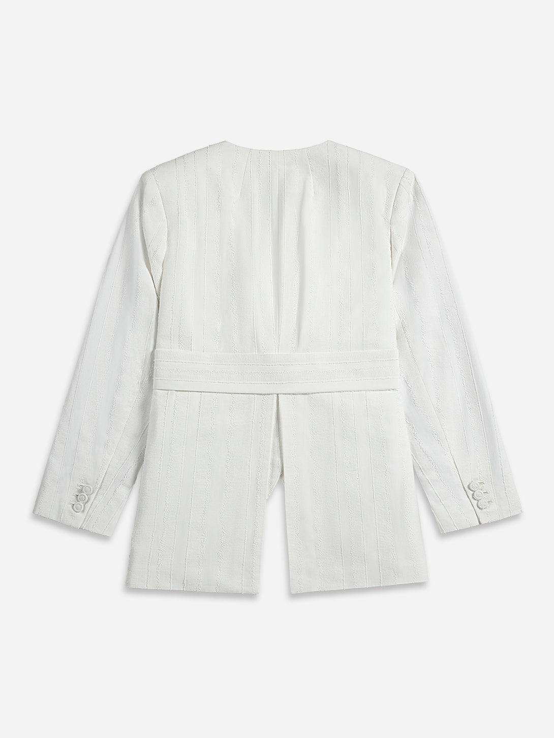 Experience contemporary tailoring in our Textured Striped Blazer, with darted waist and belted back. Made from soft textured fabric, it is lightweight and breathable. Cut in a collarless design with tonal dobby stripe, this piece exudes a sense of subtle sophistication. Suit up with matching Textured Striped Pants for a coastal vibe.