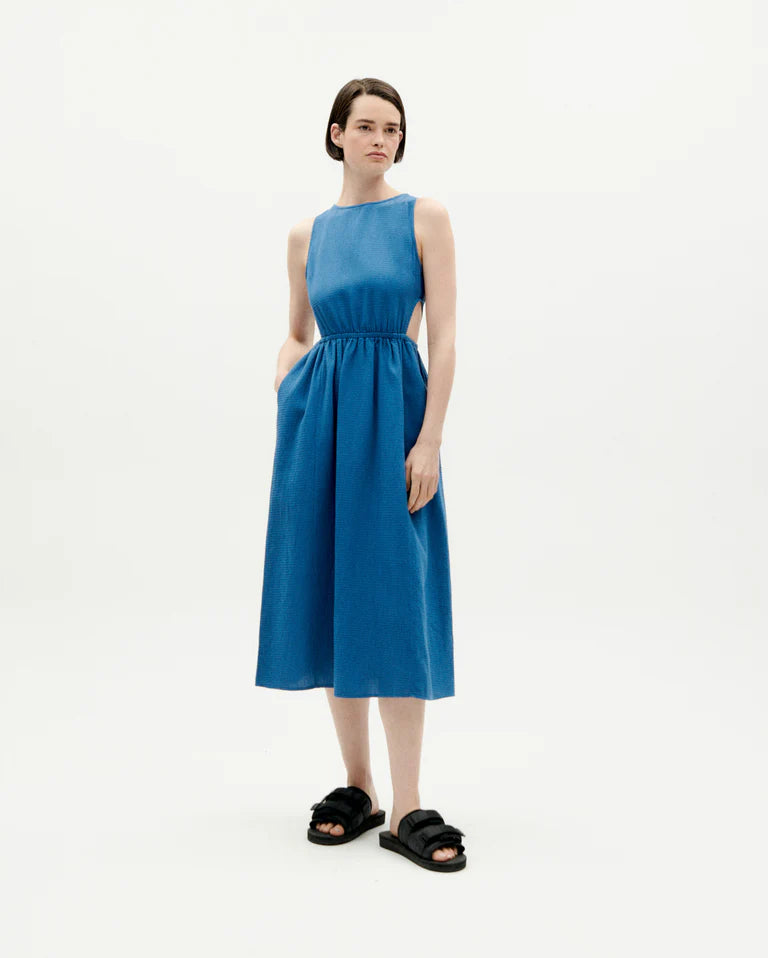 This blue dress offers a comfortable and stylish silhouette with a unique design.