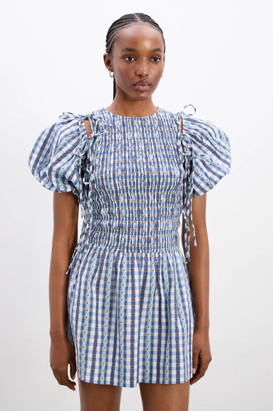 BLUE MARGOT GINGHAM BECCA BUBBLE MINI DRESS