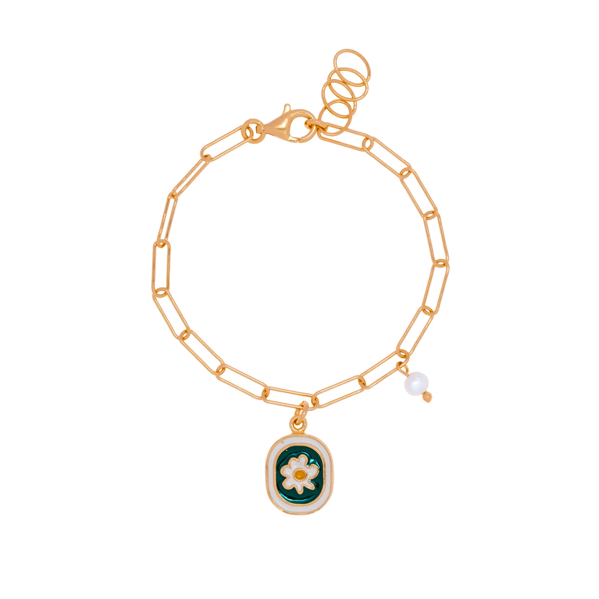 Camomile bracelet with enameled medalion. Silver goldplated chain. Fresh water pearl attached.