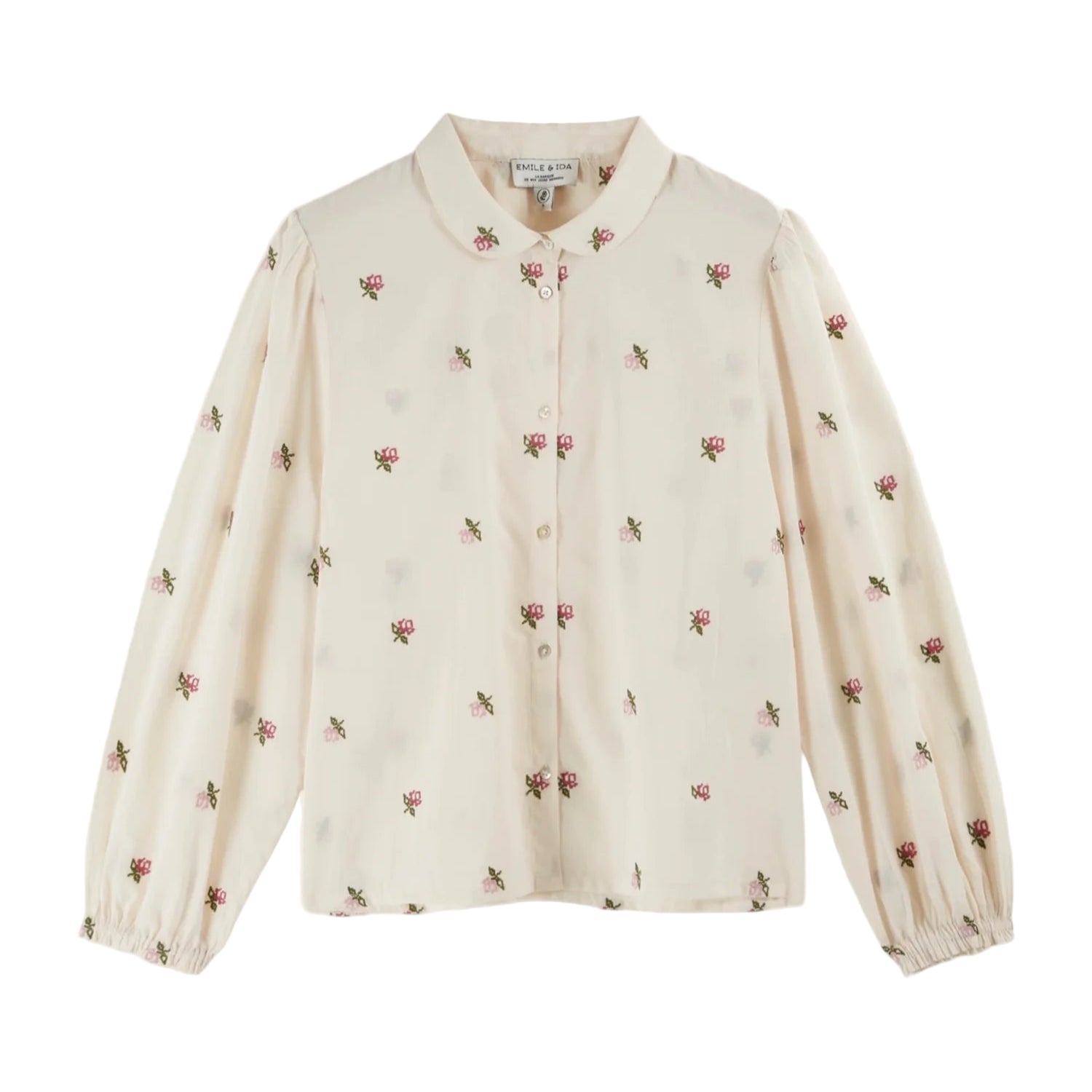 Ecru cotton blouse embroidered with roses in all-over.