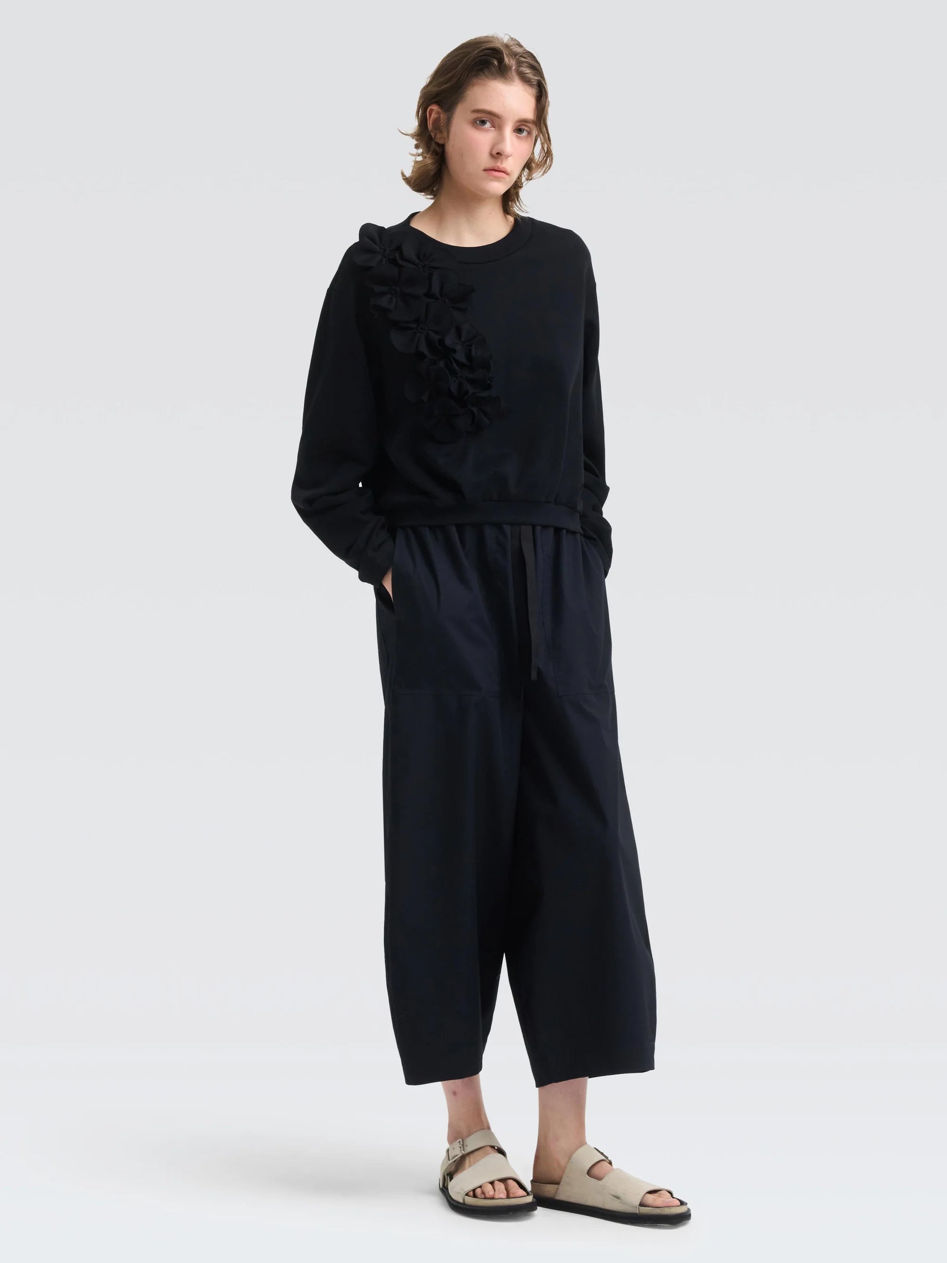 Considered details make this pullover a covetable staple. Made in plush cotton jersey with floral applique, it is cut for an oversized fit with dropped shoulders and scrunched long sleeves. Pair it with your favourite denim or shorts.