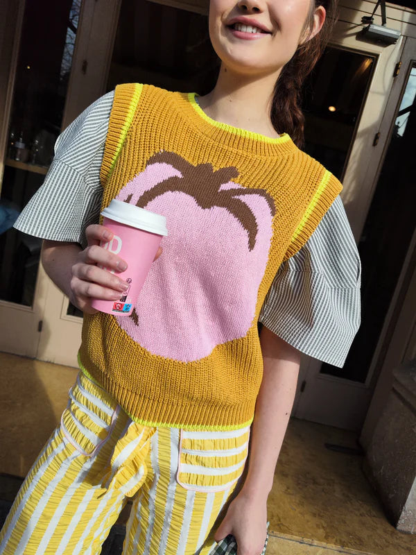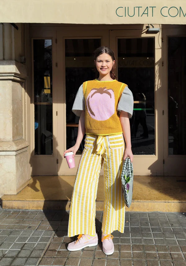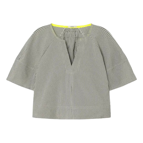A blouse designed to bring balance and freshness to summer looks. Its thin stripe design in khaki and white creates a timeless effect, while the v-neckline with ruching adds a relaxed and unique touch. It has a fluorescent yellow interior detail. With a wide and comfortable silhouette, and short straight-cut sleeves, it is a lightweight and easy garment to wear on a daily basis.