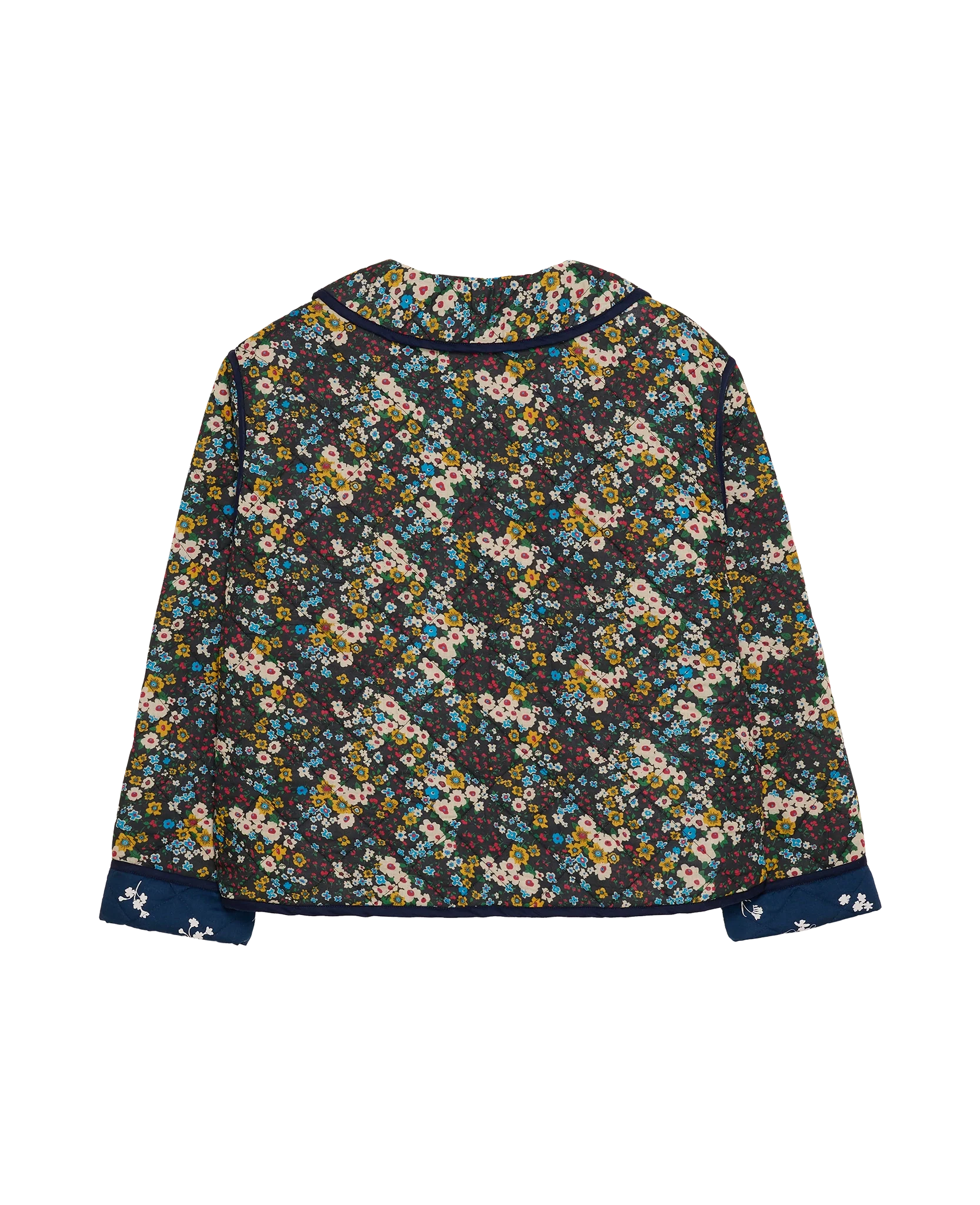 Daniella Jacket is a feminine casually shaped piece made in leftover cotton. It is lightly padded and quilt-stitched in a classic checked pattern together with the printed lining. The jacket features an O-neckline with a cute wide collar, closes with three set of tie-strings on the front placket, and has stitched pockets on the front. Edges and seams are decorated with contrasting cotton bindings to emphasize the jacket's silhouette.