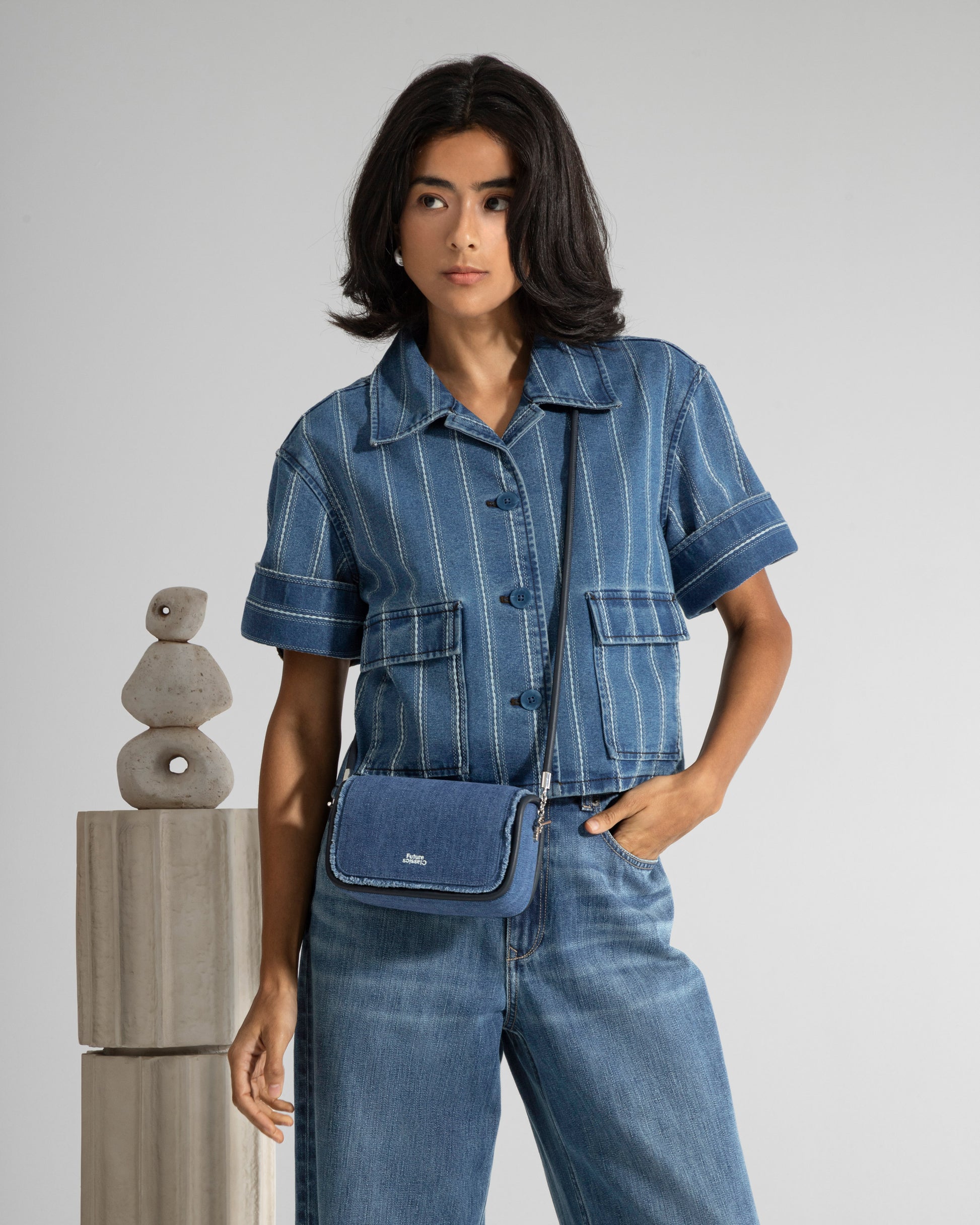 Boxy cropped denim jacket in dobby pinstripe indigo, cut with dropped shoulders and wide sleeves for a relaxed, square outline. Pointed collar, patch pockets with flaps, and contrast stitching keep it sharp yet casual, while the short length balances high-waist bottoms. Pair with matching shorts or trousers for an easy coordinated look in high summer.