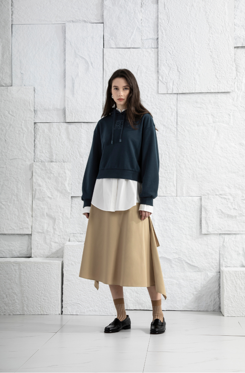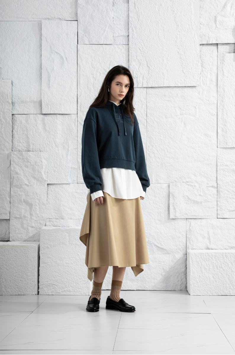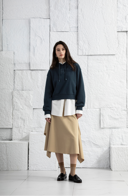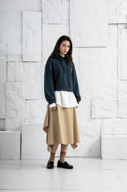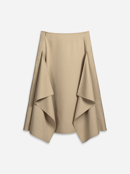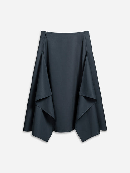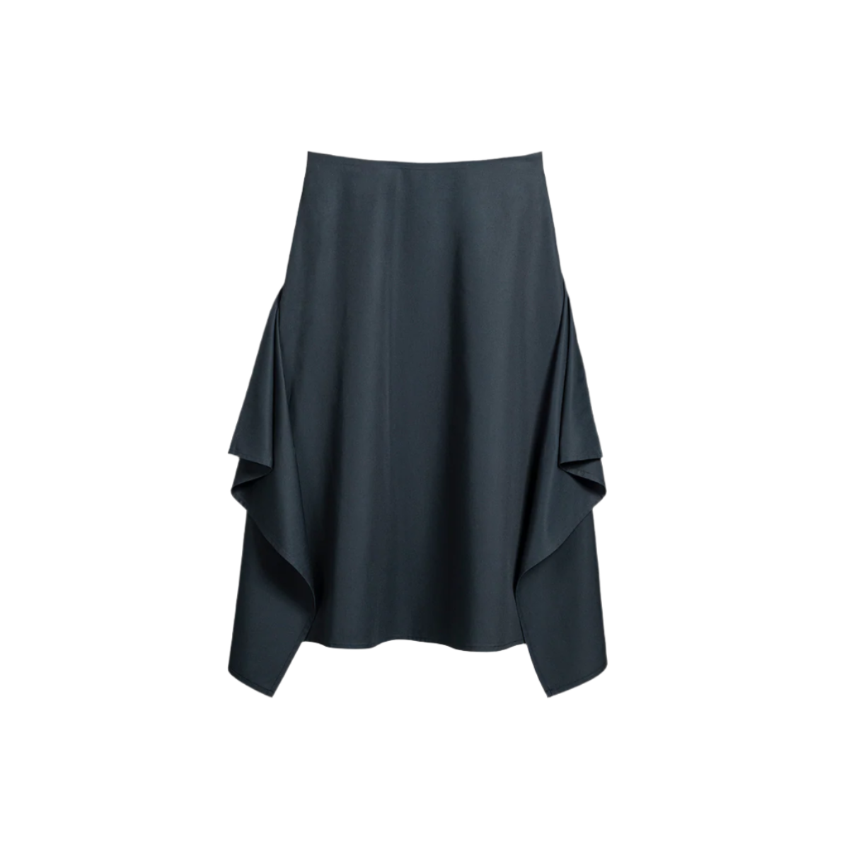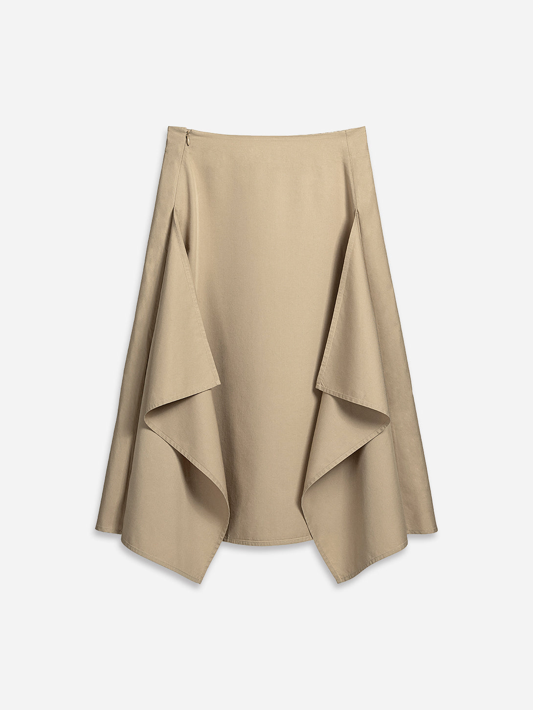 Our Draped Skirt perfectly balances modern femininity and effortless style. Asymmetric side construction drapes gently into a flared silhouette, adding rhythmic movement to every step you take. Crafted from Cotton Cupro blend for an exceptional soft touch, ensuring full day comfort and elegance.