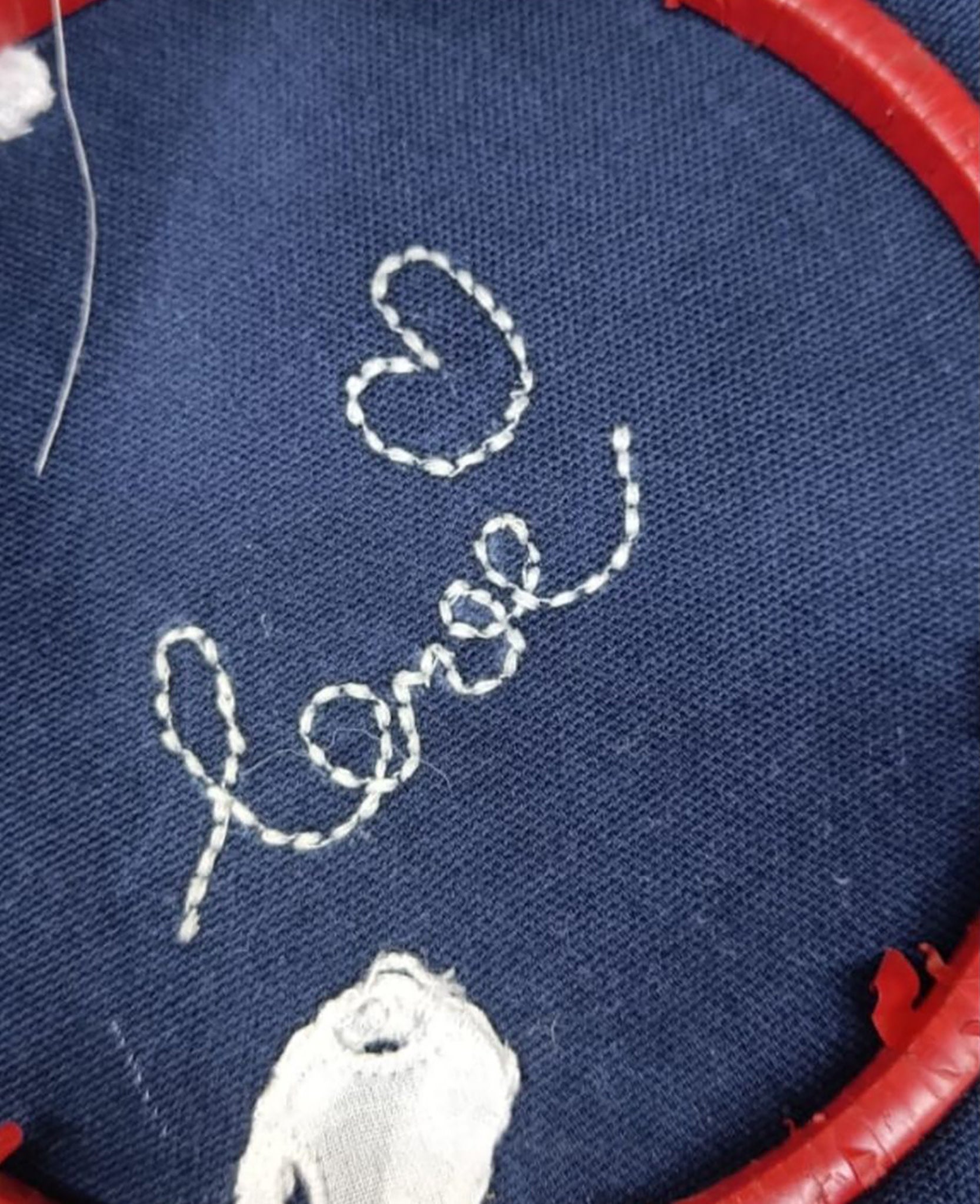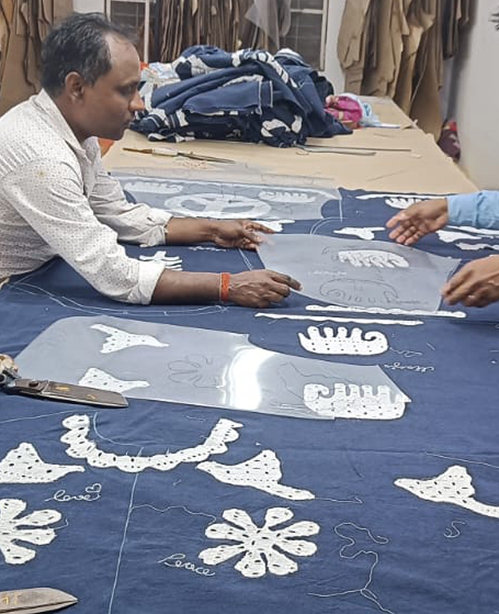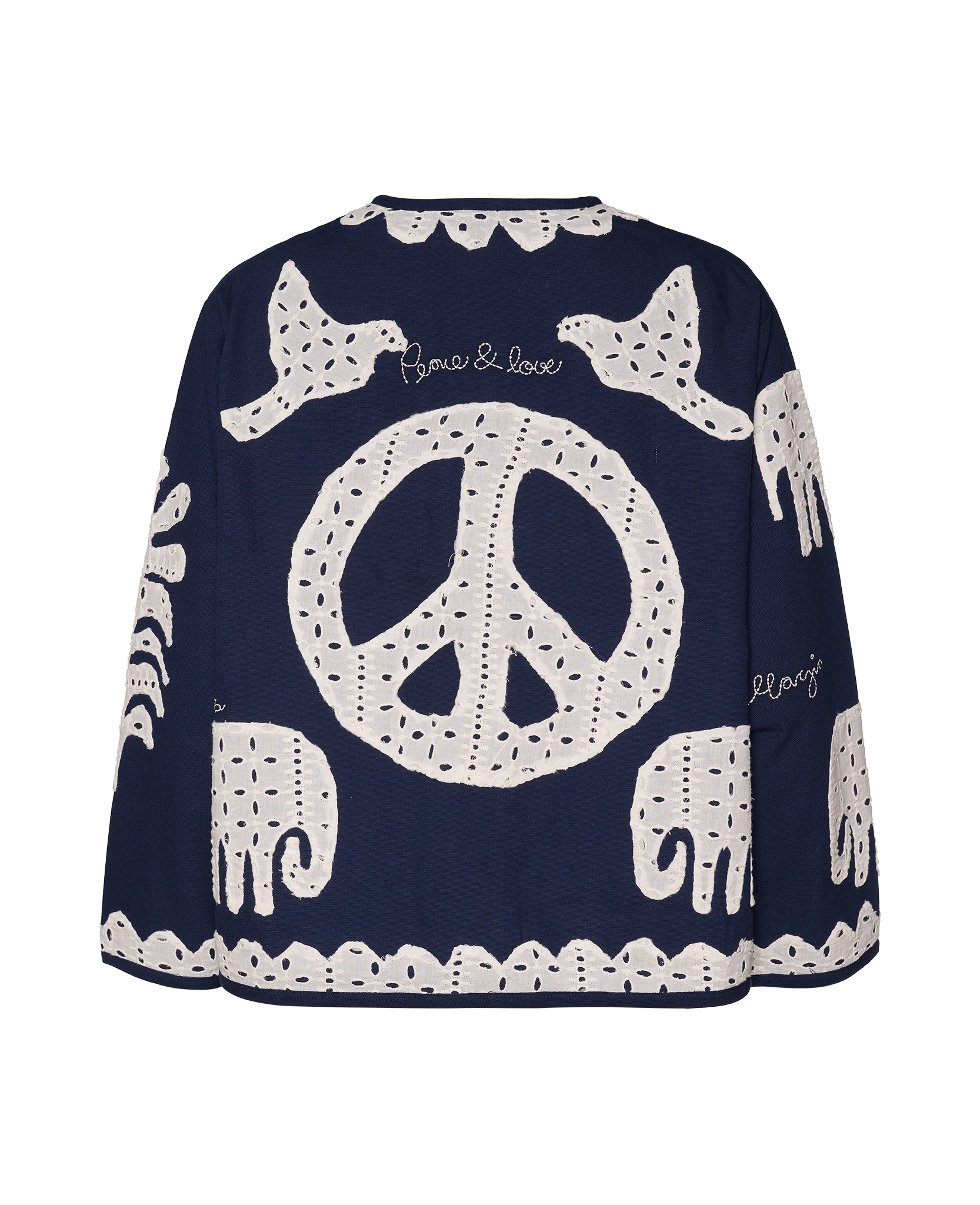 It has an O-neckline and a front placket with wood buttons. The jacket includes pockets sewn on the front and is richly decorated with delicate embroidery and charming handmade appliqué motifs, such as elephants, birds, and flowers, crafted from broderie anglaise.