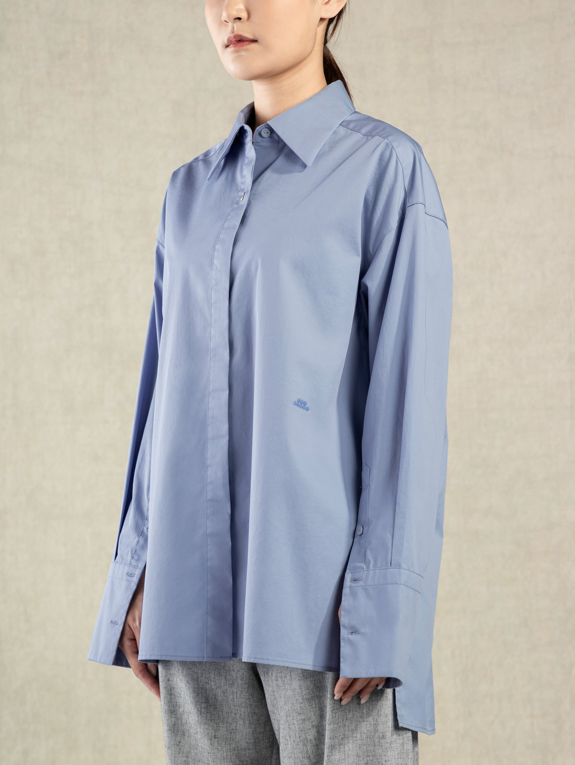 Our Oversized Shirt is stylish garment with a relaxed fit, this shirt provides a laid-back look, perfect for both business and daily casual wear. The sleeves feature plackets that exudes a polished look. An elegant golden button adorns the neckline, adding an eye-catching accent.