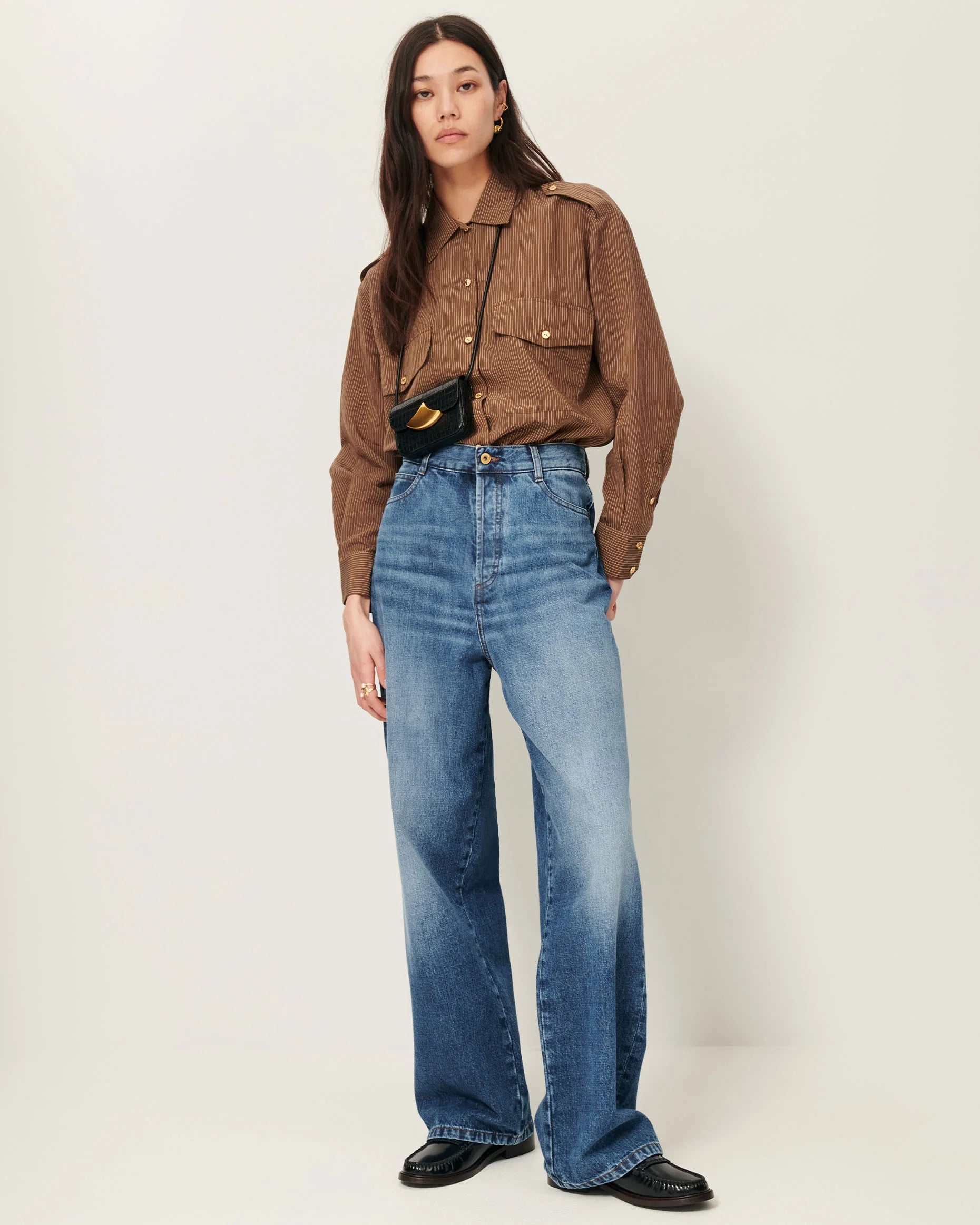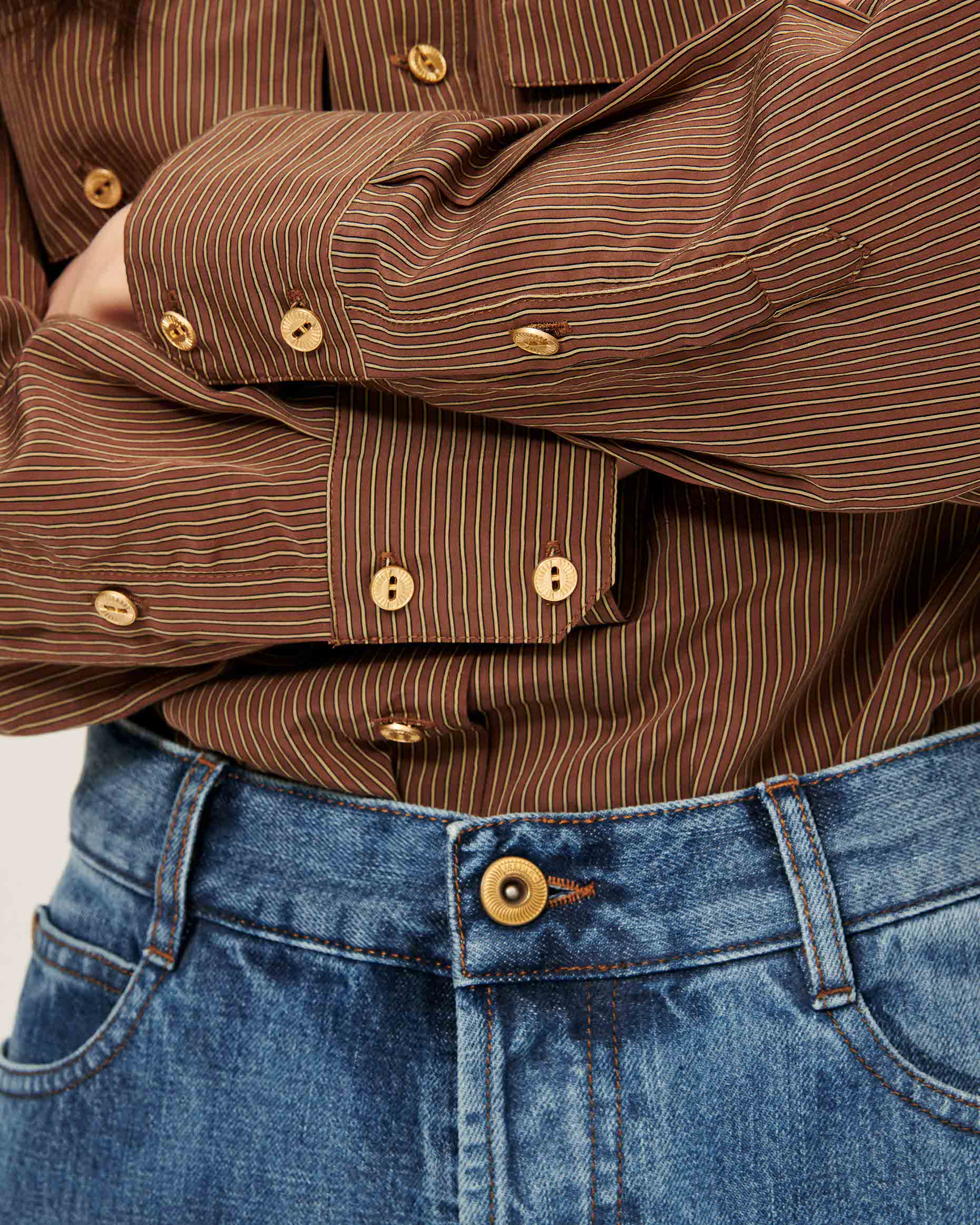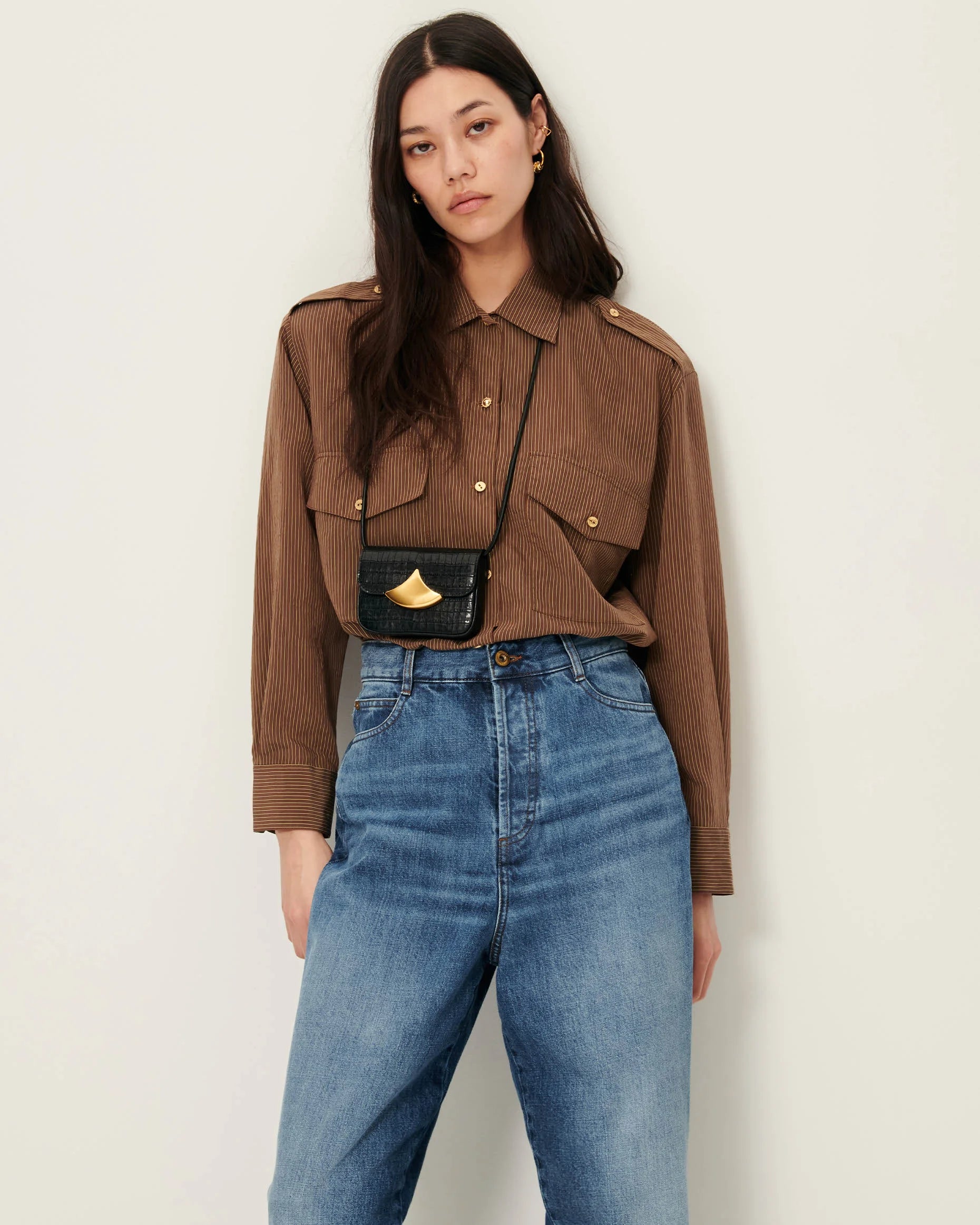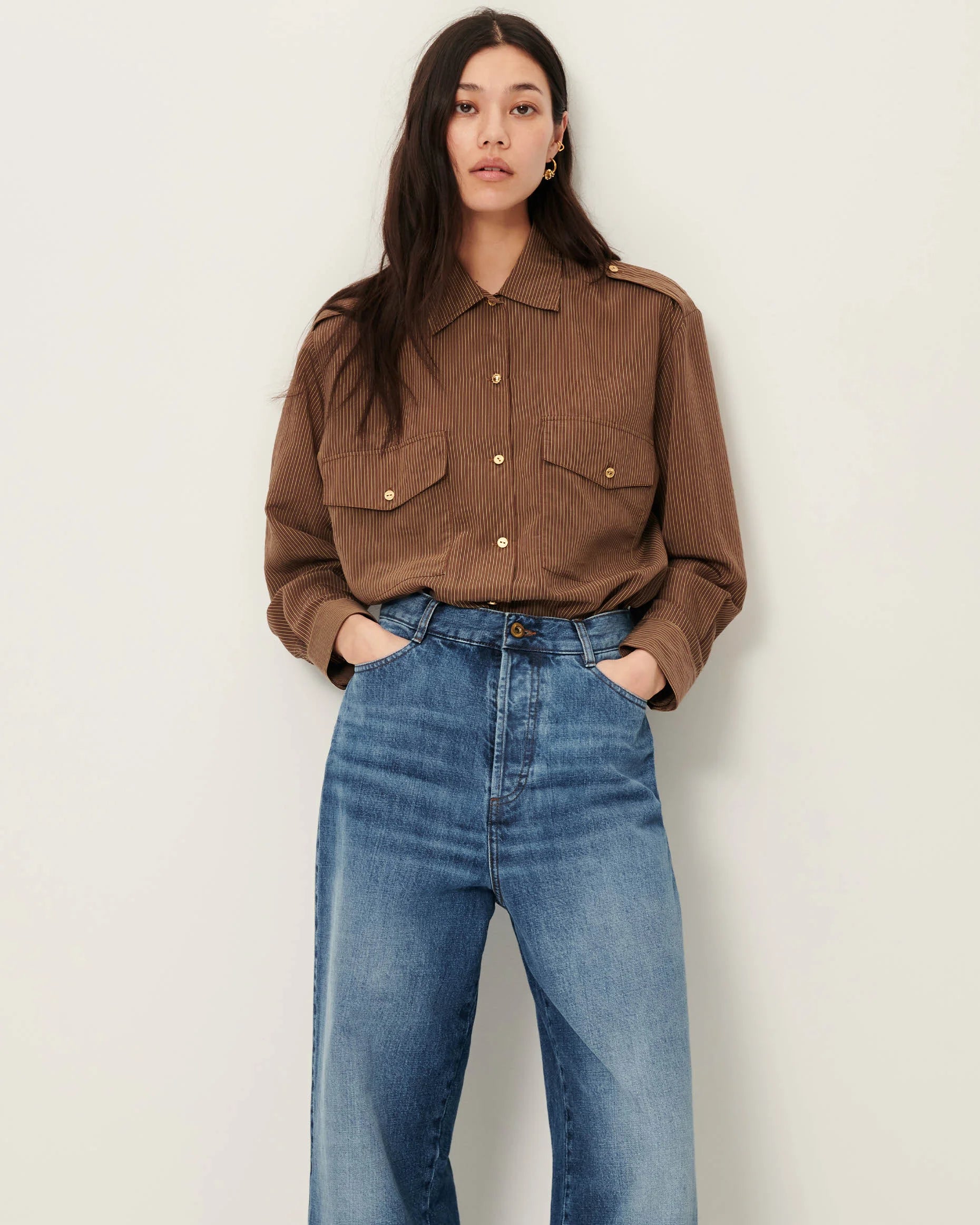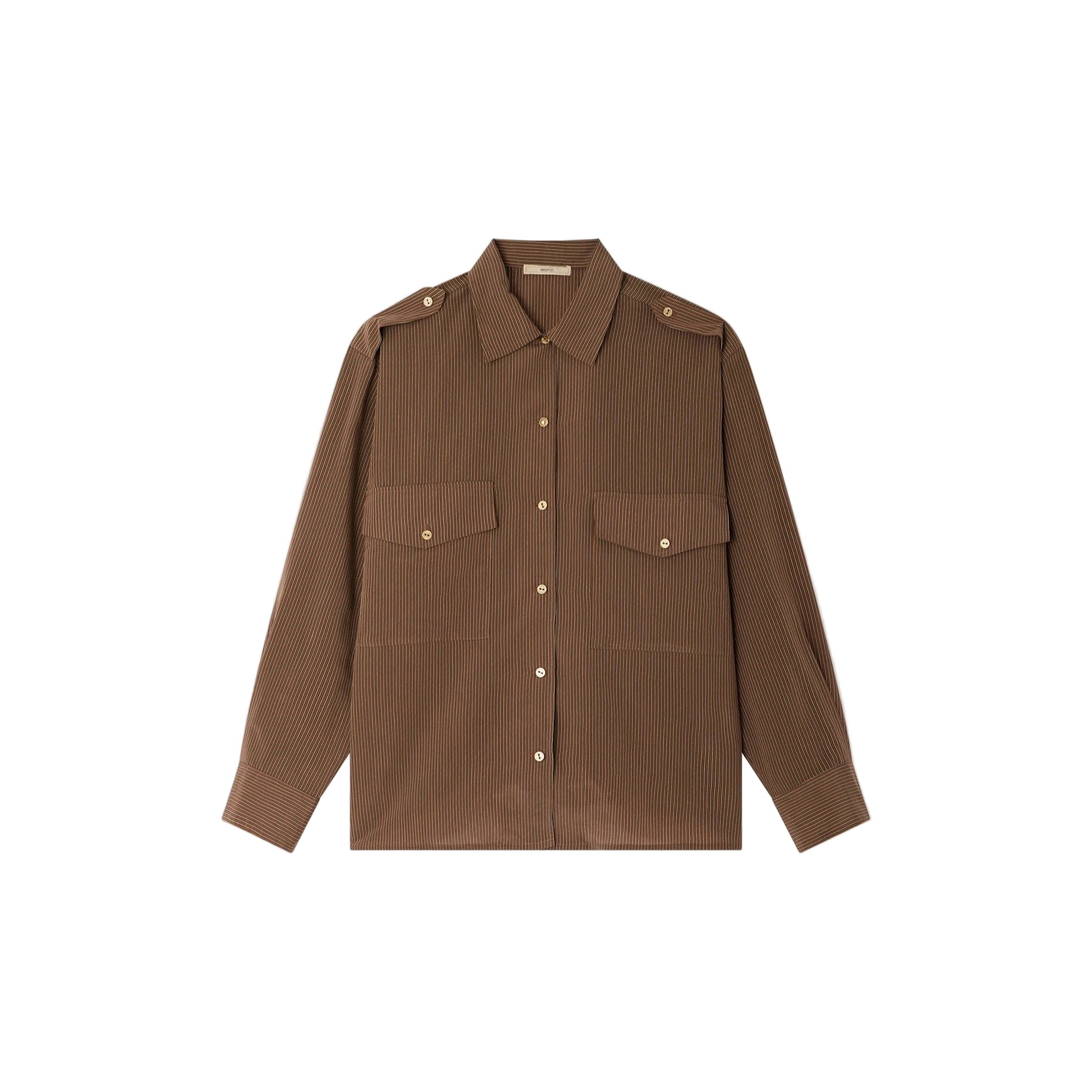 Officer-style shirt with shoulder tabs and patch pockets in soft striped Lyocell poplin, woven in Italy.