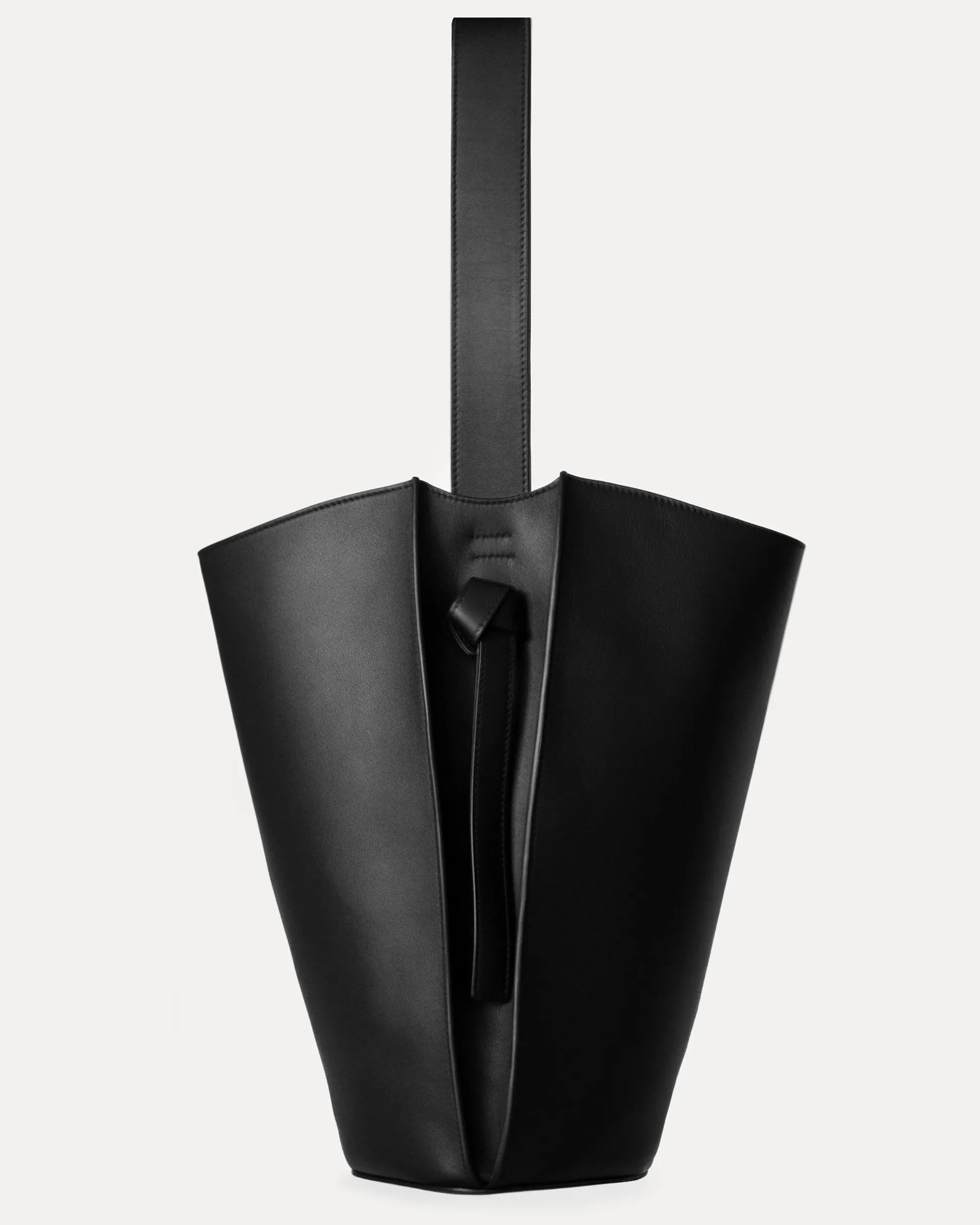 Kota continues MIUUR’s exploration of concave-convex forms. Its iconic shape, achieved by twisting the flat bottom, increases the bag’s capacity while emphasizing its playful design, perfectly matched by the casual knot on the side.
