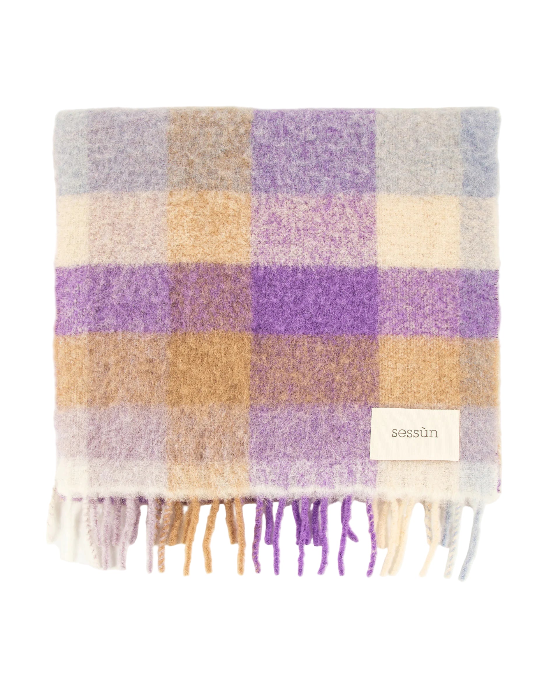 Check-pattern scarf with fringed edges. Embroidered label with Sessùn logo.
