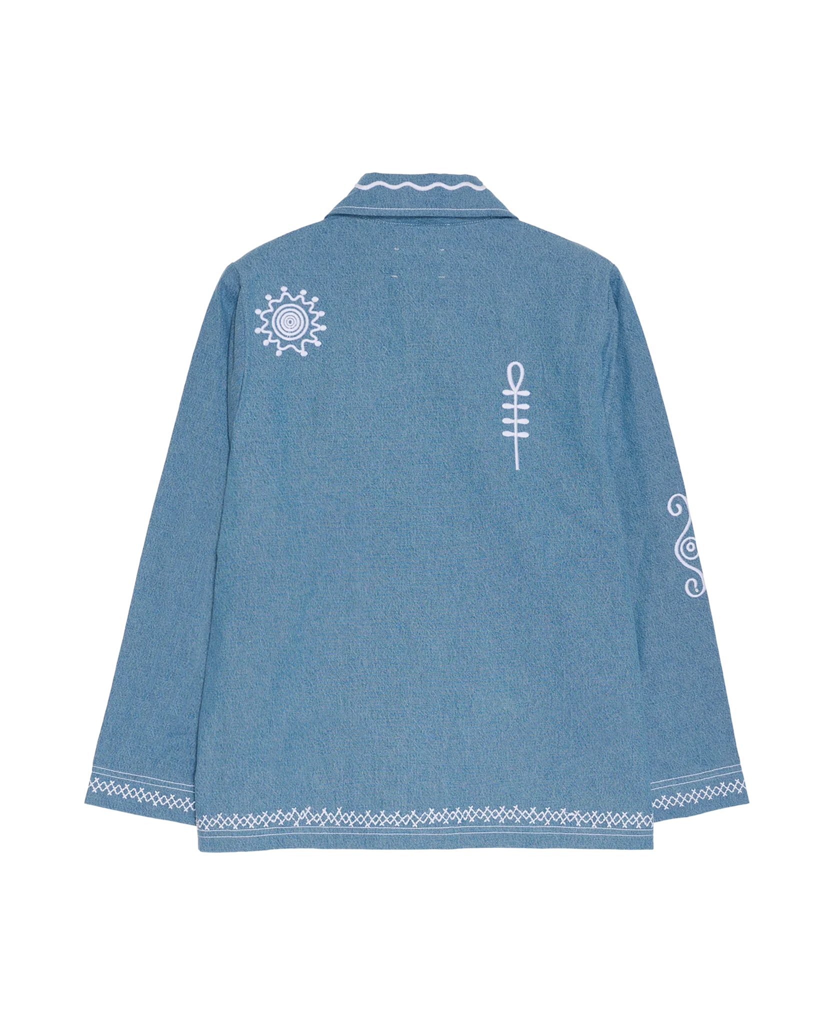 My Jacket is made of leftover denim and has a casual fit. It features a small shirt collar, long sleeves, two pockets, and a front placket with bone-look buttons. The jacket is decorated with charming motifs created using delicate white embroidery.