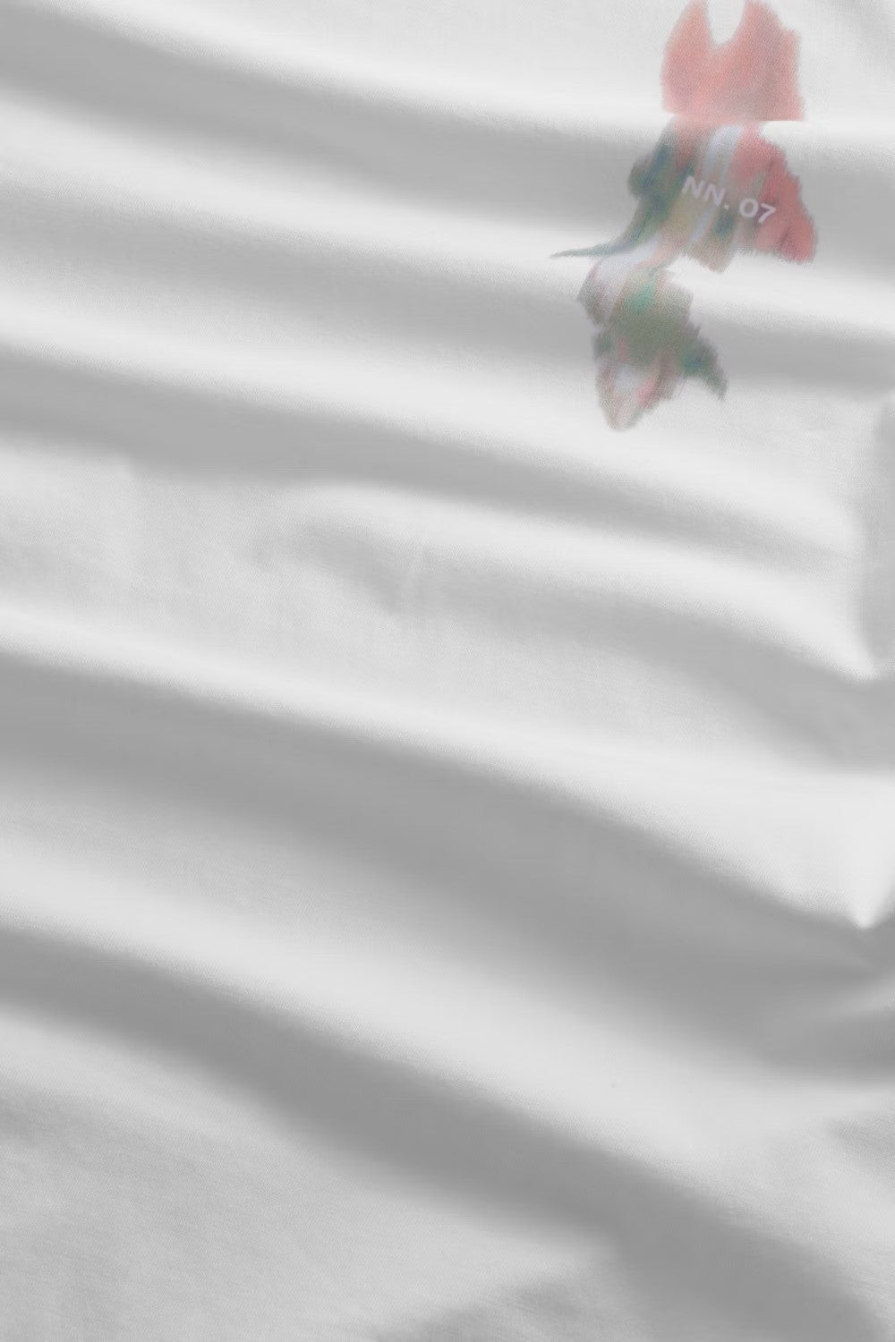 Casual tee made in a fine Pima cotton jersey. Complete with twin needle stitching throughout, an abstract flower motive, and a rib detail along the neckline.