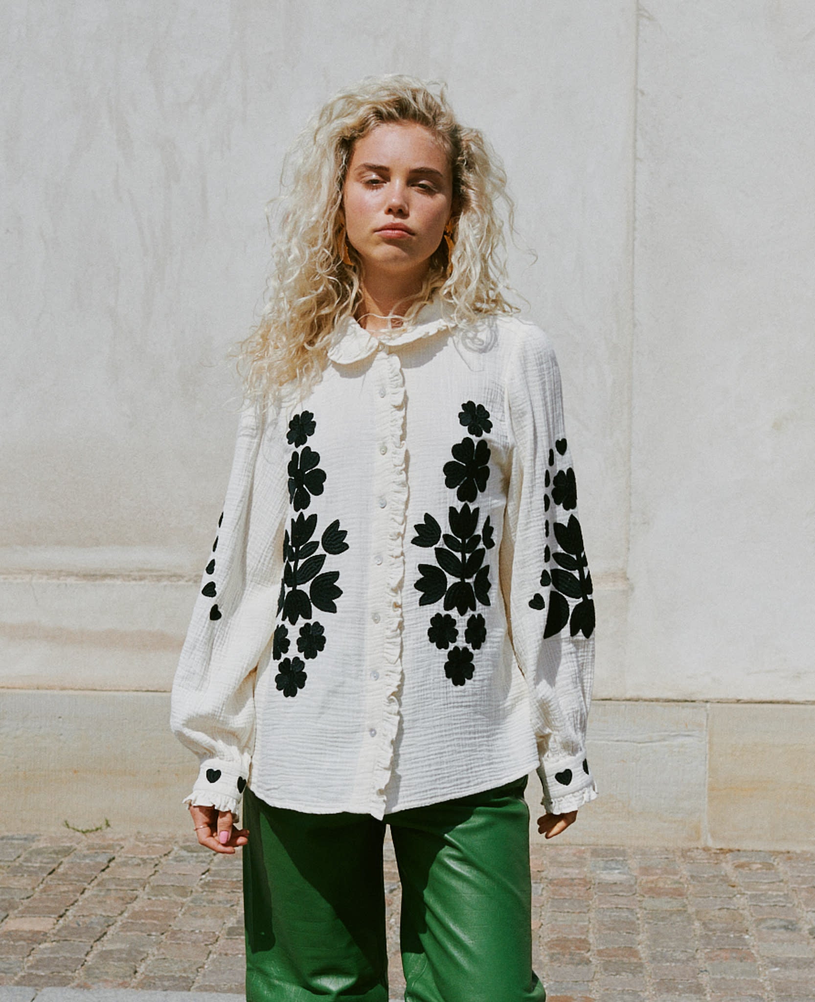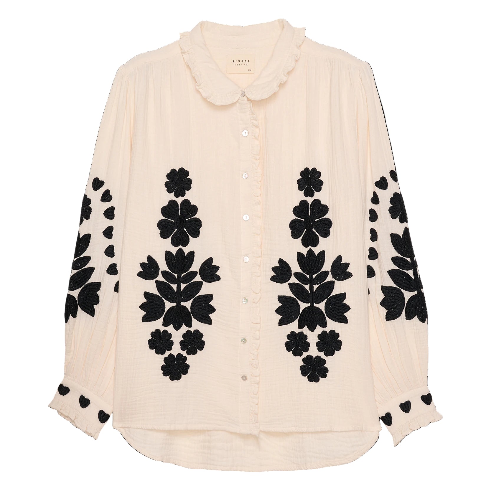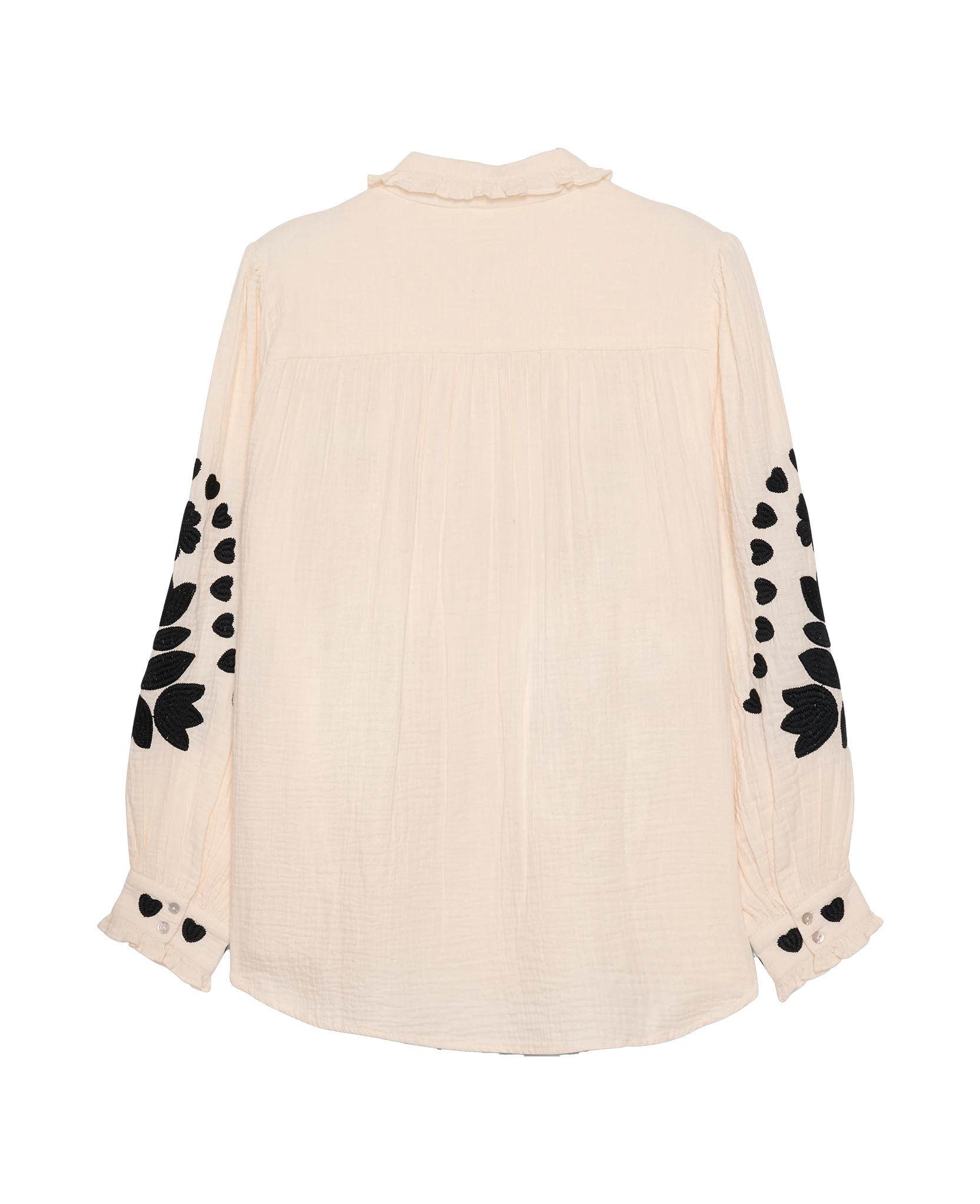 Rae Shirt is made from soft, waffle-structured, double-gauze 100% organic cotton. It features a light ruffled collar and a placket with light mother-of-pearl buttons. It is adorned with contrasting embroidery, featuring a graphic floral and heart design in solid black.