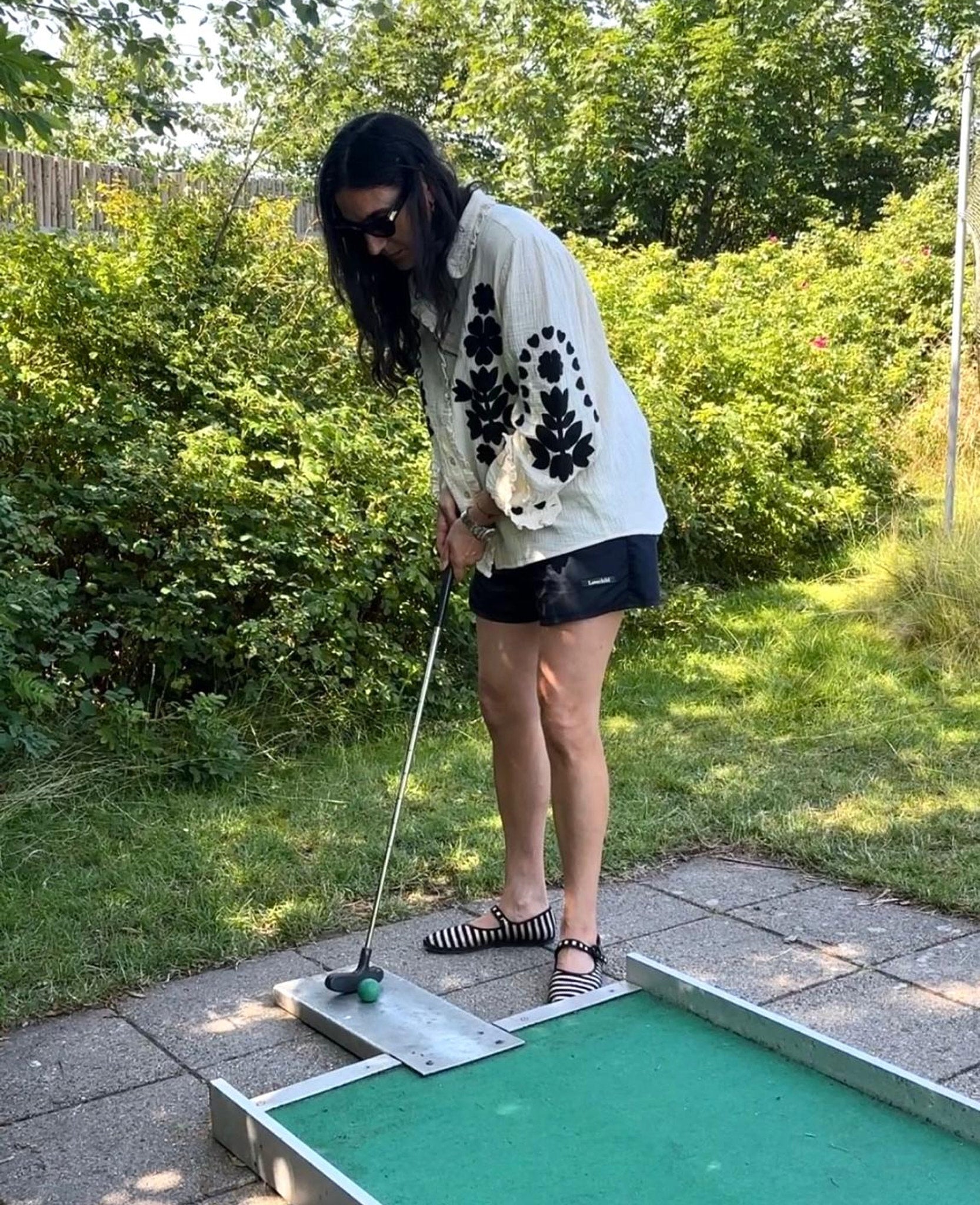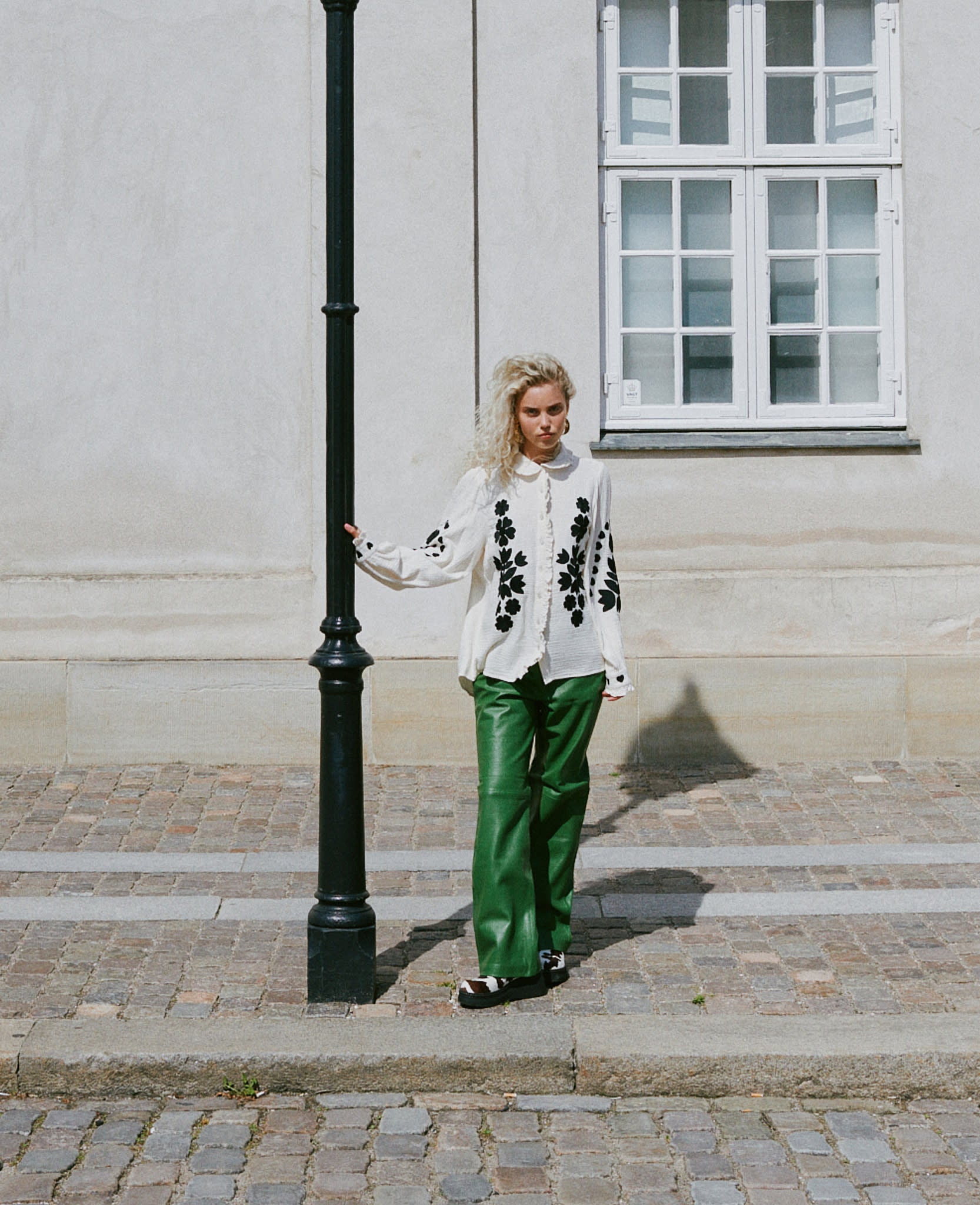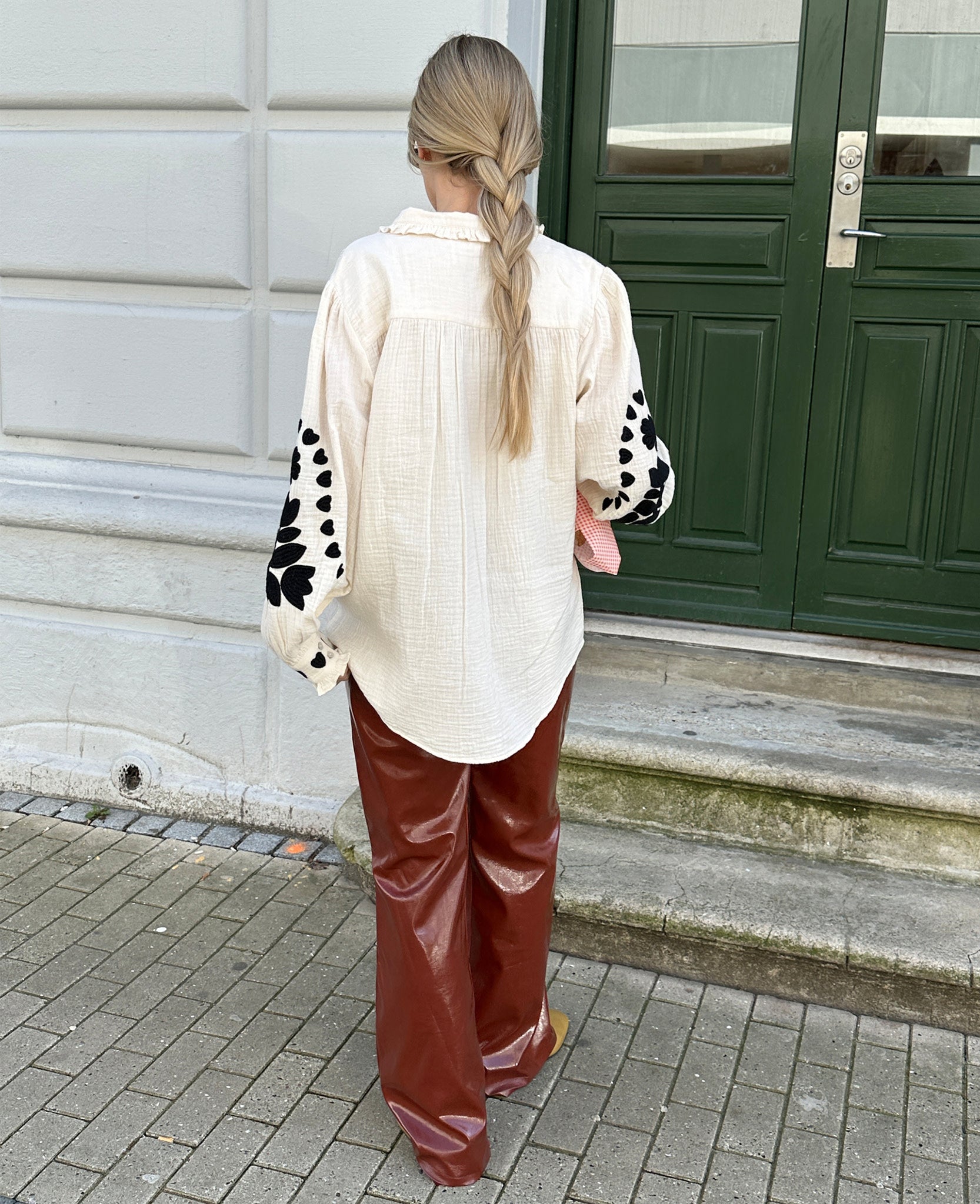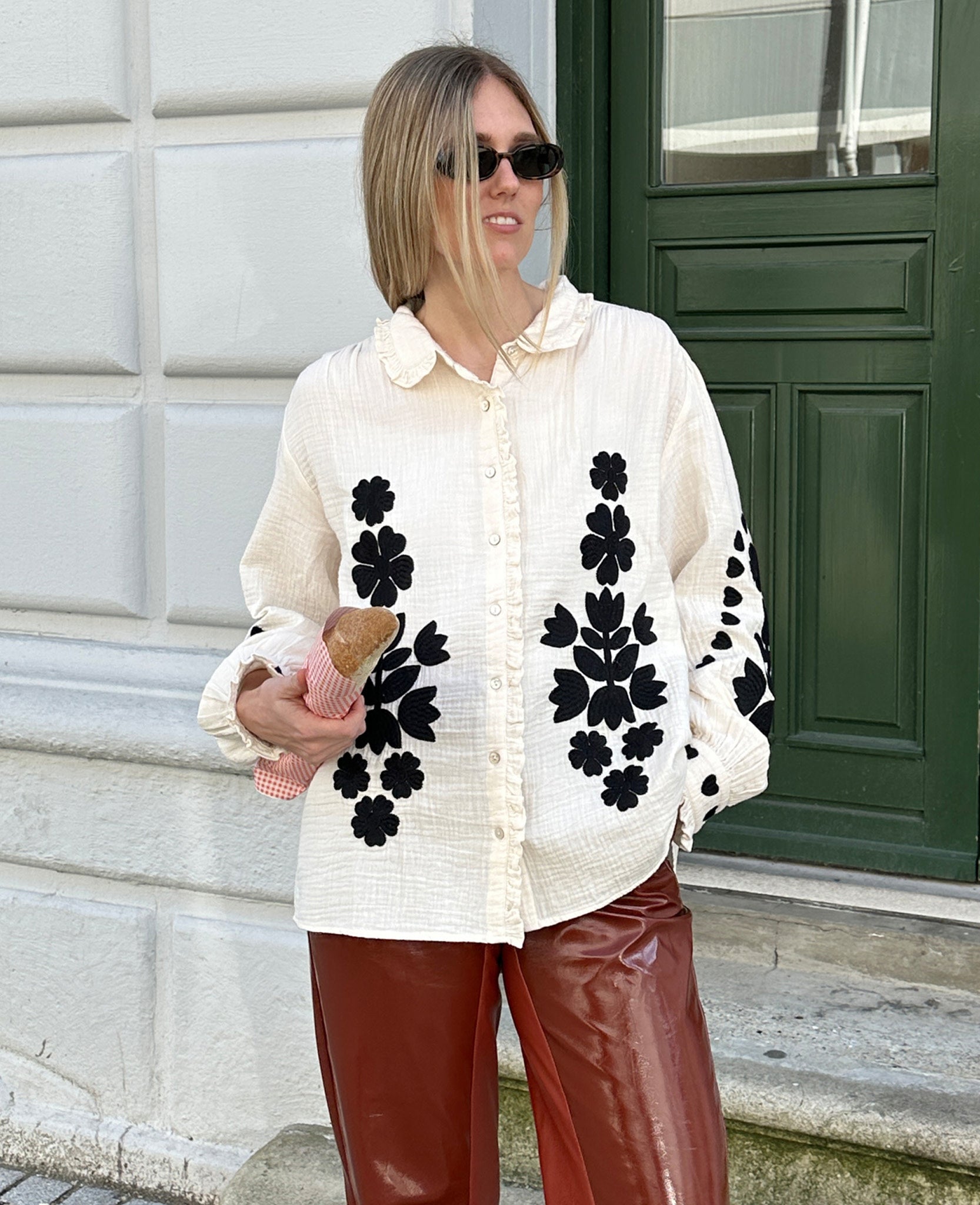 Rae Shirt is made from soft, waffle-structured, double-gauze 100% organic cotton. It features a light ruffled collar and a placket with light mother-of-pearl buttons. It is adorned with contrasting embroidery, featuring a graphic floral and heart design in solid black.