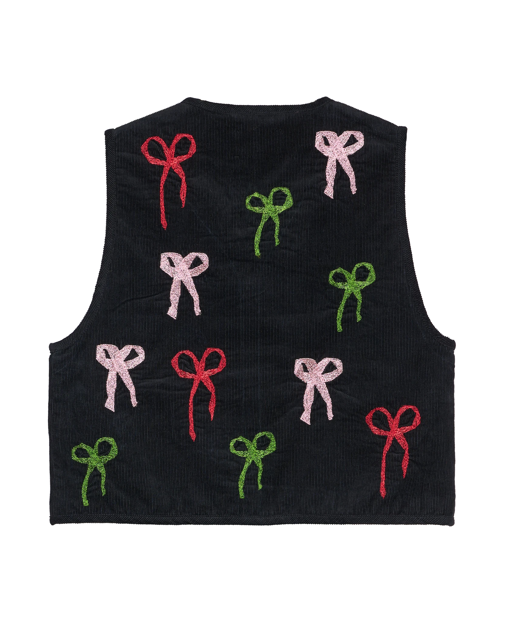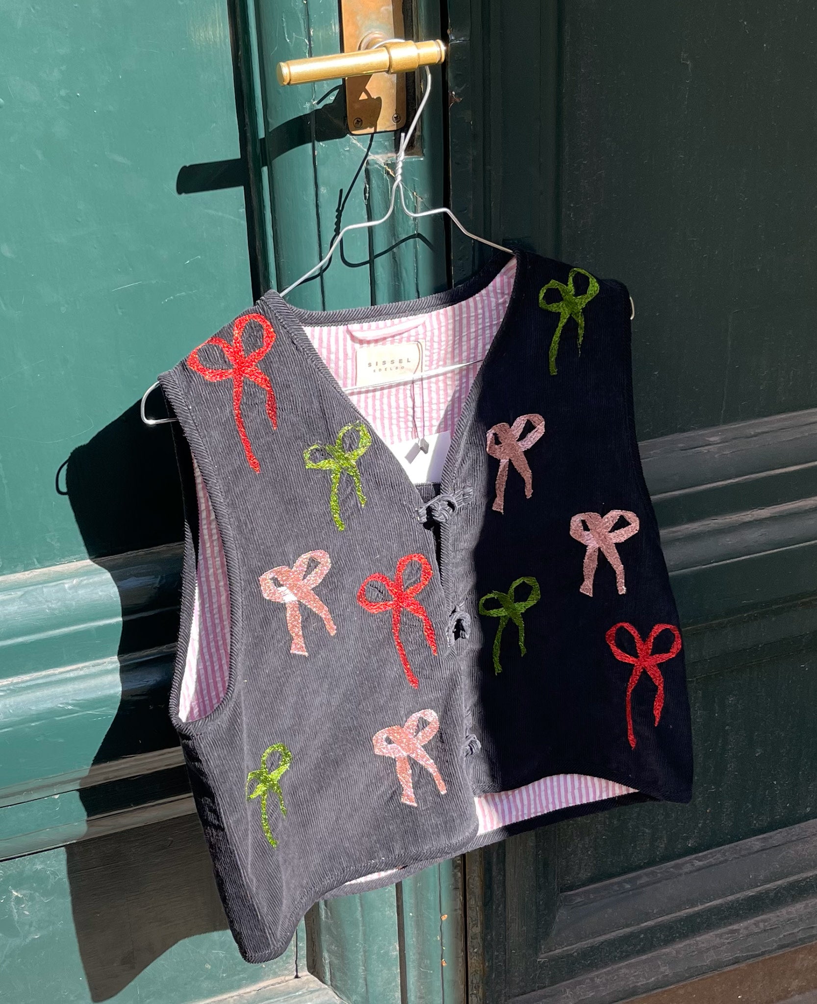 Rita Vest is a short vest made from leftover cotton baby corduroy. It has a V-neckline and can be closed with three sets of frog buttons at the front placket. The vest is lined with striped leftover cotton and finished with bindings along the edges. It is decorated with cute bows made of metallic thread embroidery.