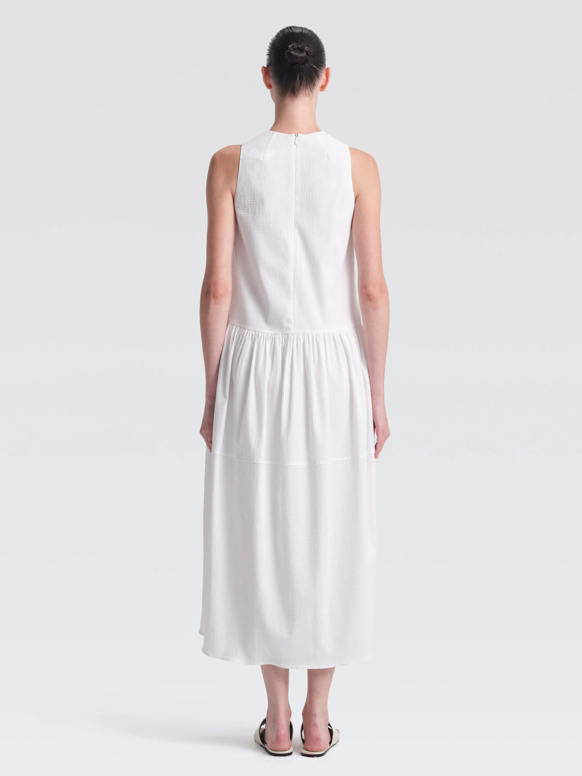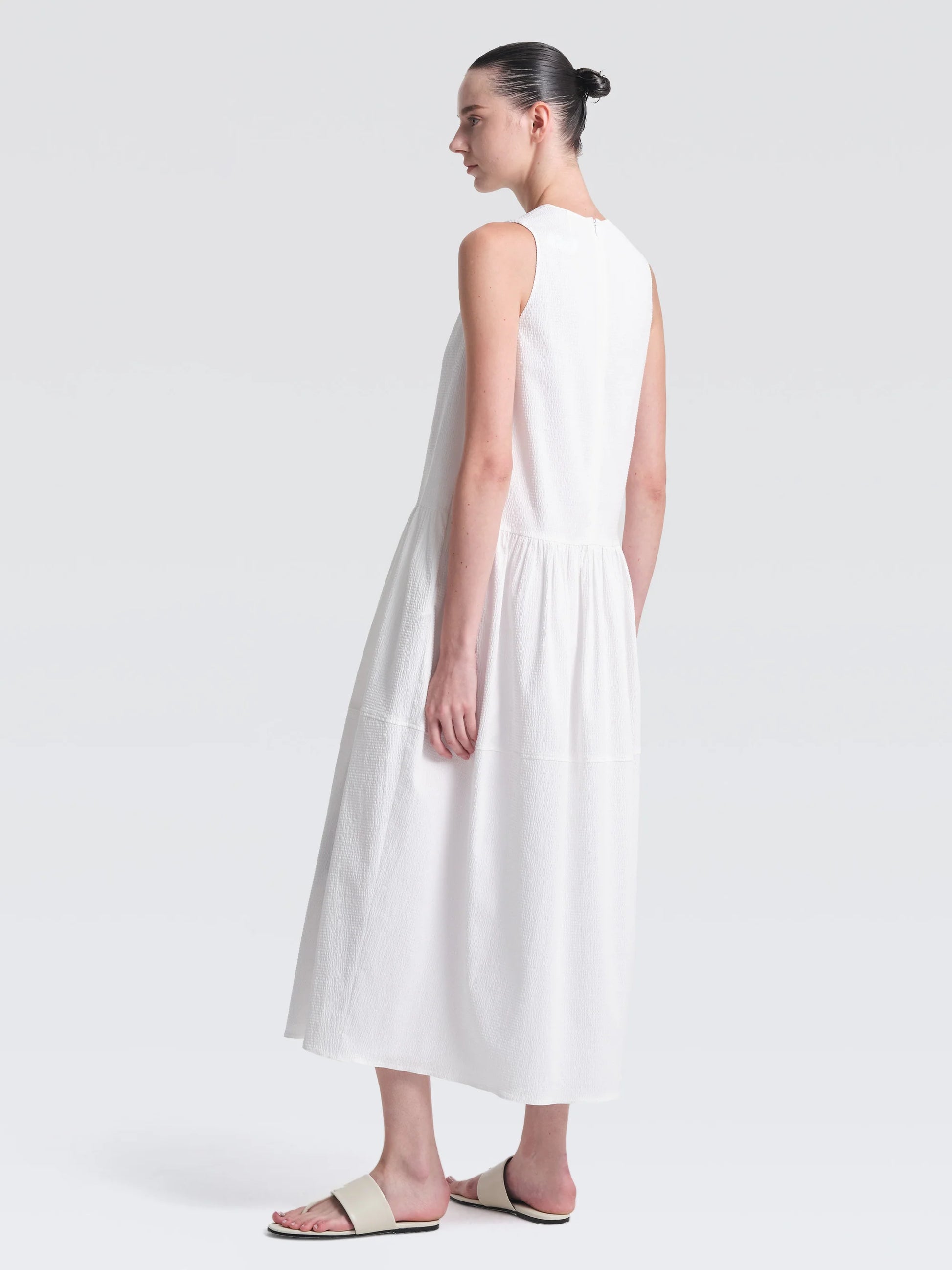 The EMMA dress in cotton seersucker, featuring a drop waist and falling to a midi hem in a modern barrel-shaped silhouette. Style with simple sandals or minimal sneakers for a contemporary, effortless look.