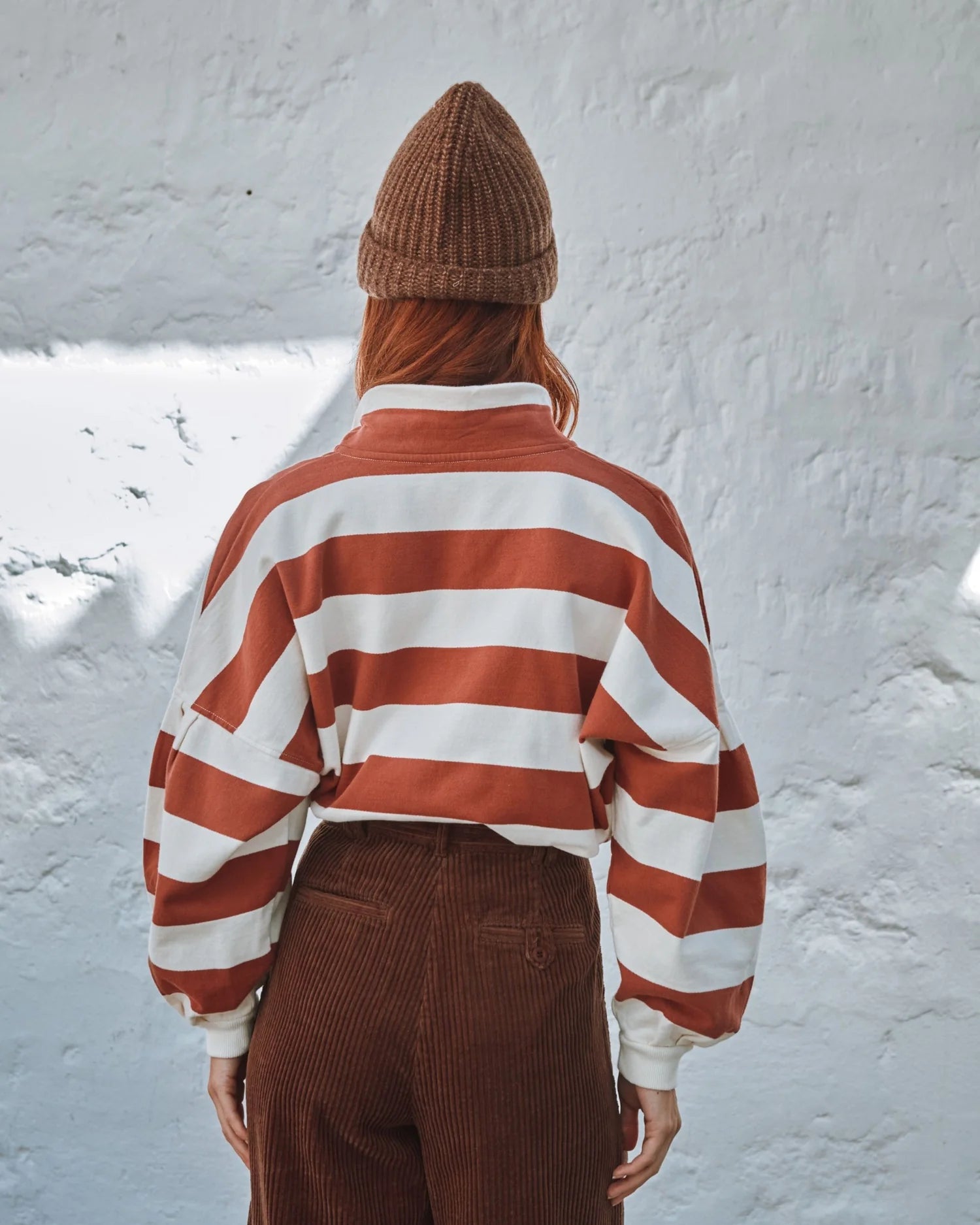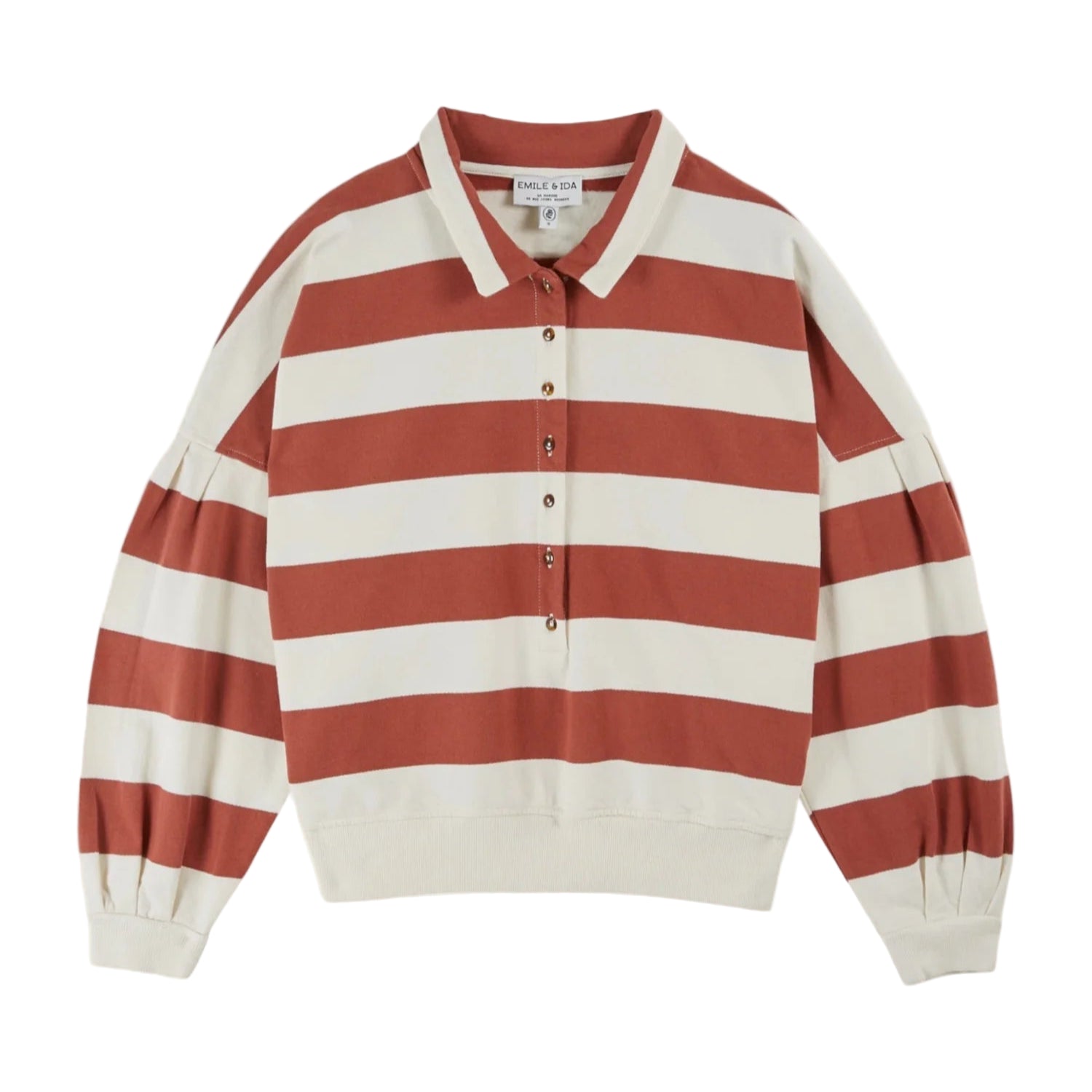 Sweatshirt in fleece organic cotton jersey with ecru and brick stripes.