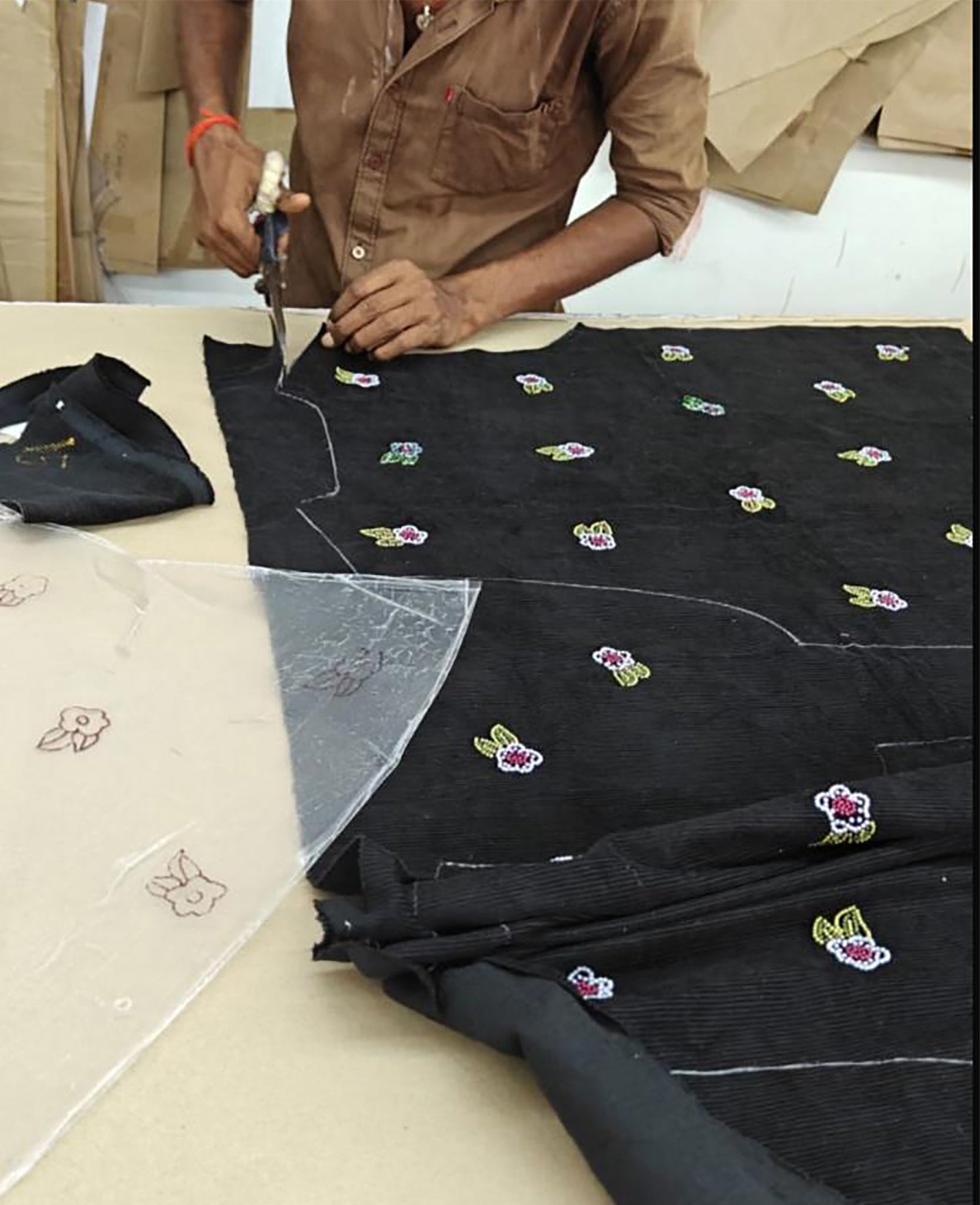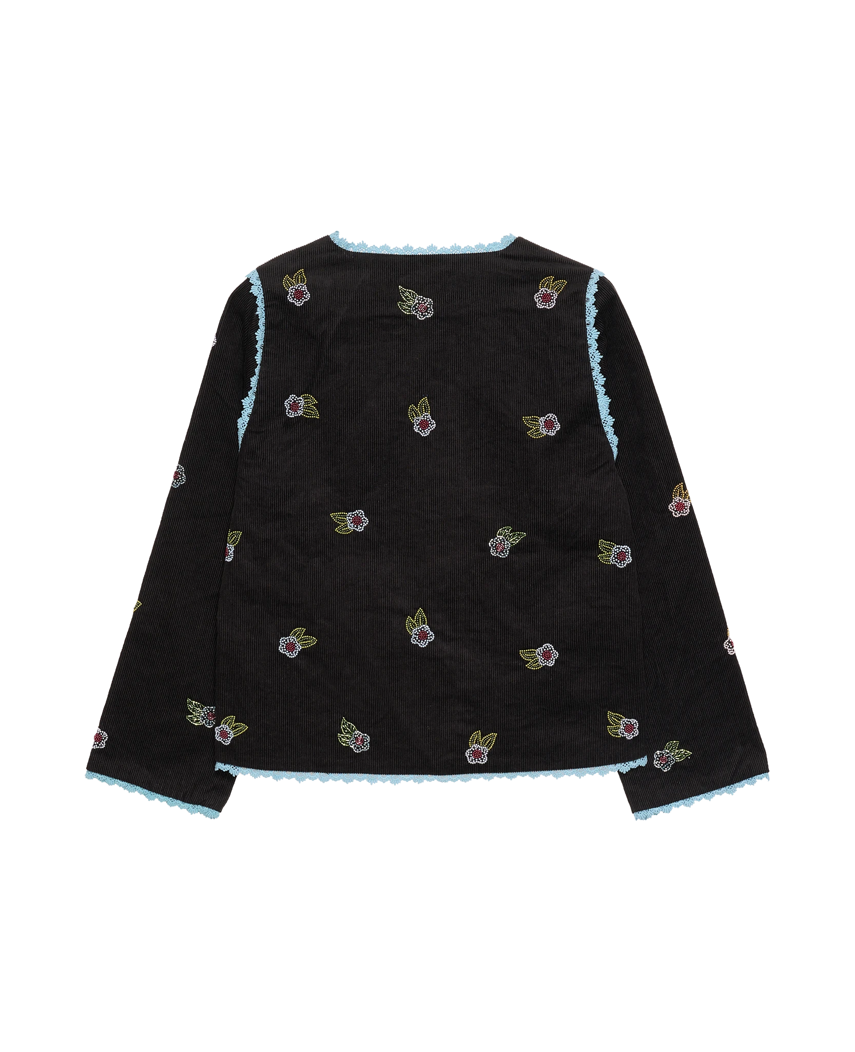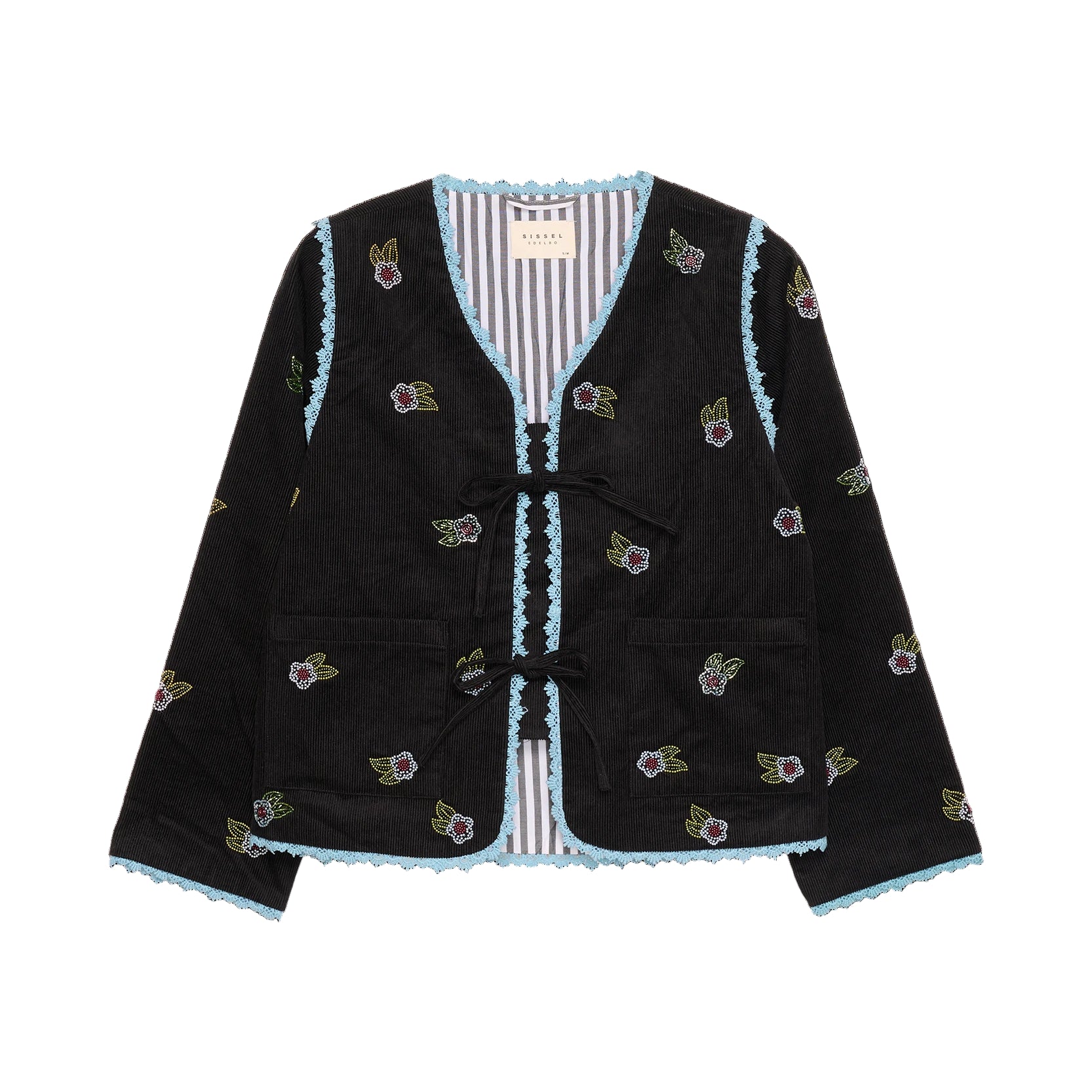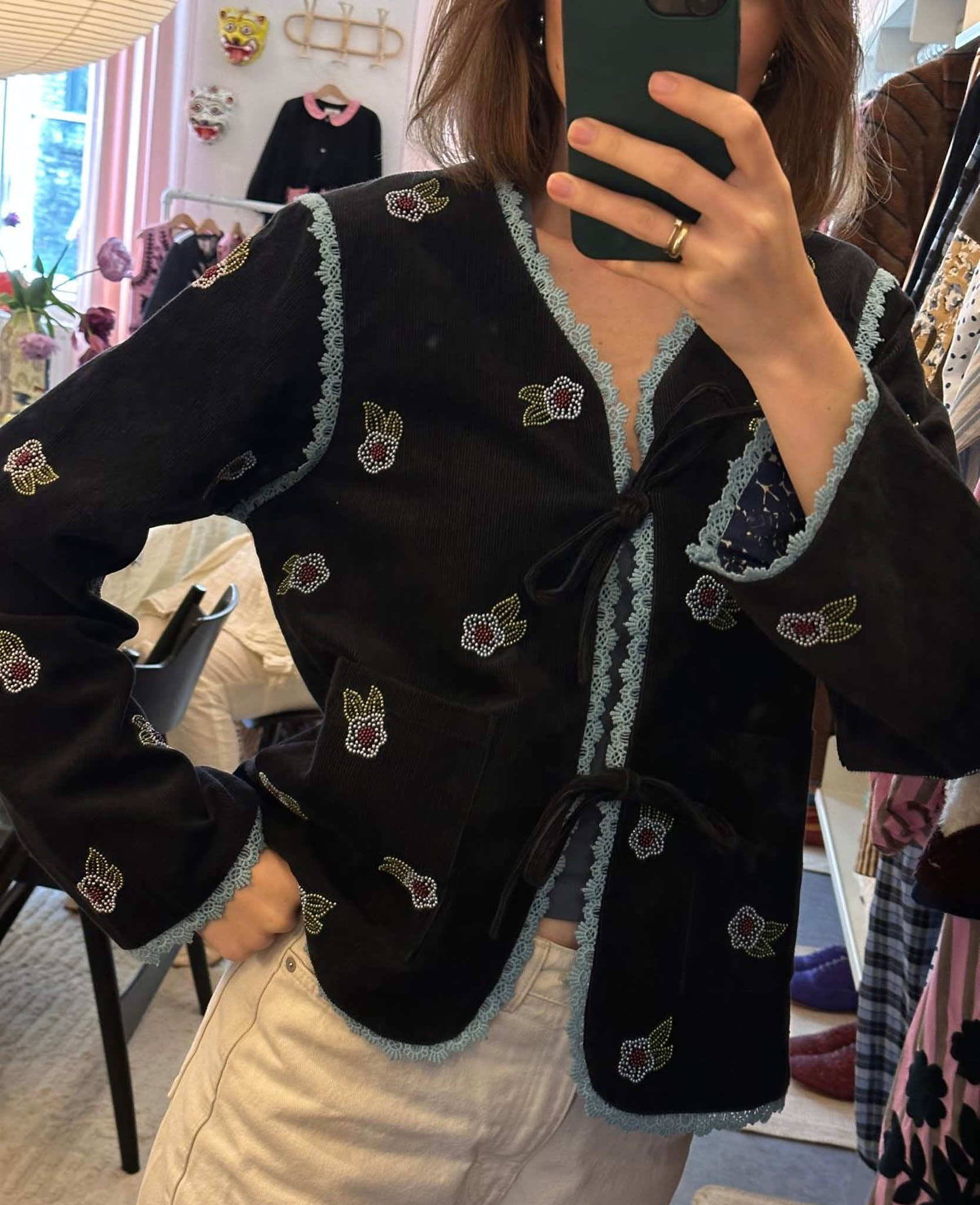 Tahlia Jacket is a short, feminine jacket made in a leftover cotton baby corduroy. It features straight sleeves and a shaped V-neckline with two sets of tie strings at the front. The jacket is lined with striped leftover cotton and is decorated with lace tape along the edges and a cute flower motif created with beads.