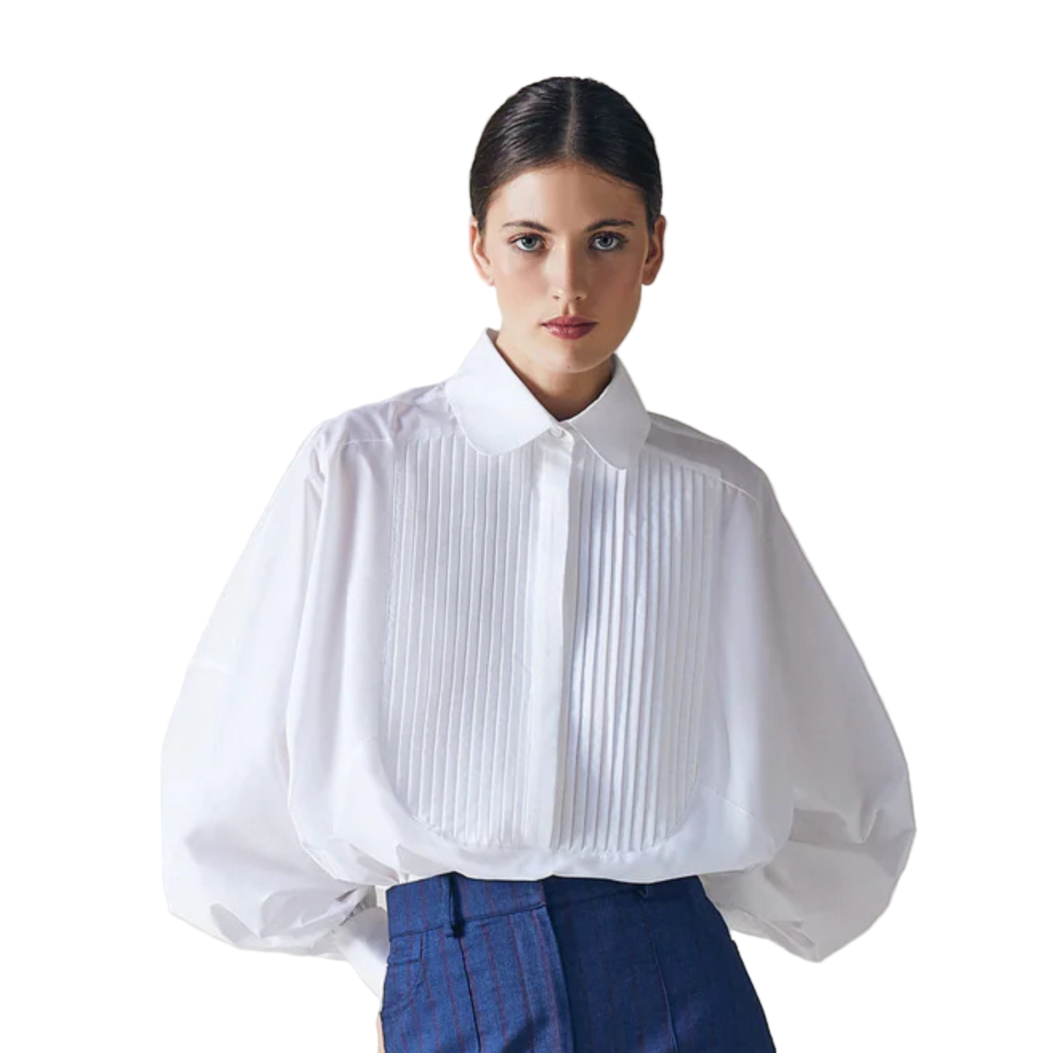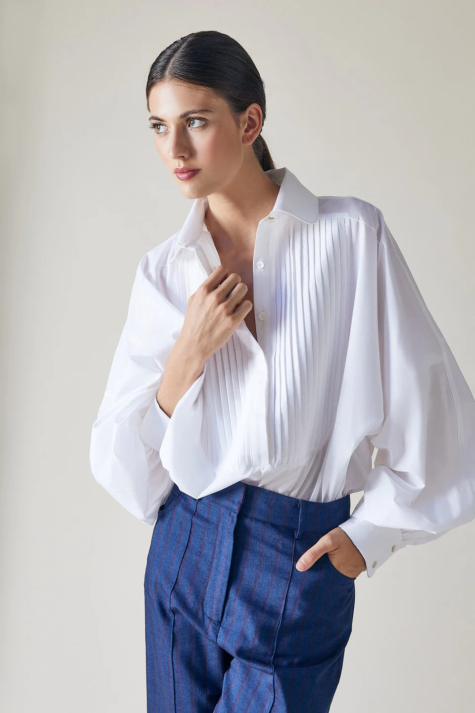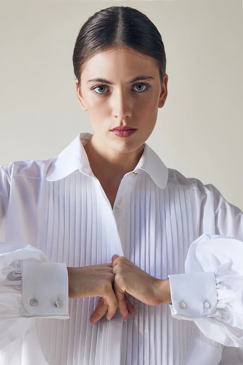The Gatsby Shirt is a wardrobe essential. A versatile white shirt featuring puffed sleeves, pleated front and mother-of-pearl buttons.