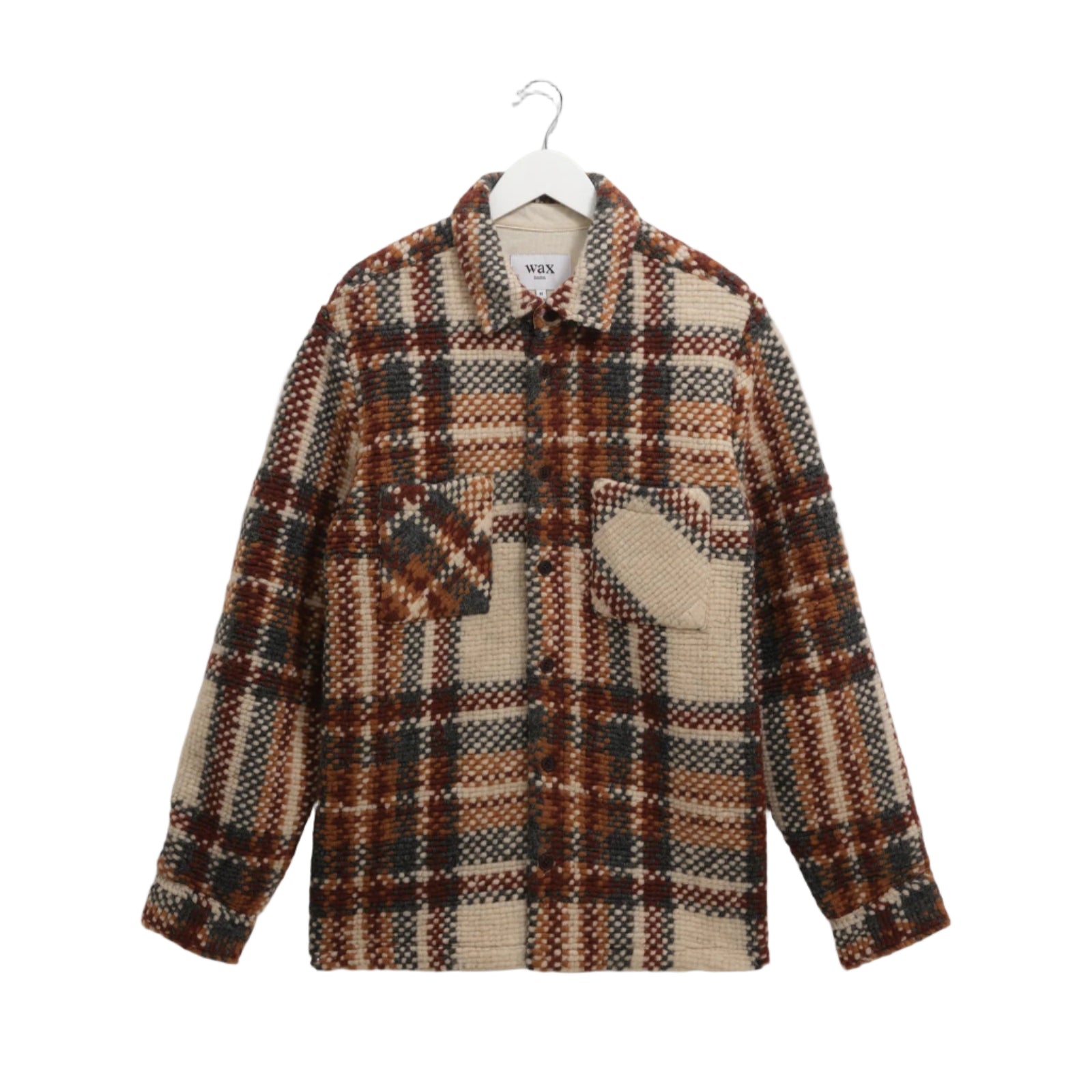 The Wax signature piece. The Whiting, our year-round staple, returns in a new large scale ecru knitted textured bobble wool check design with hues of orange, rust, and grey. It features environmentally-friendly Corozo nut buttons and front patch pockets. Is it a shirt? Is it a mid-layer? Is it a jacket? It's all of those things and much, much more.
