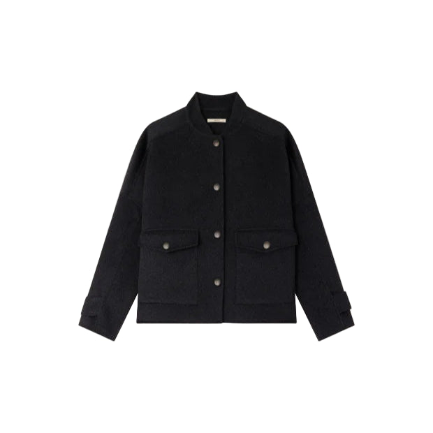 Unlined teddy-style wool jacket with patch pockets in a velvet-finish, double-weave fabric.