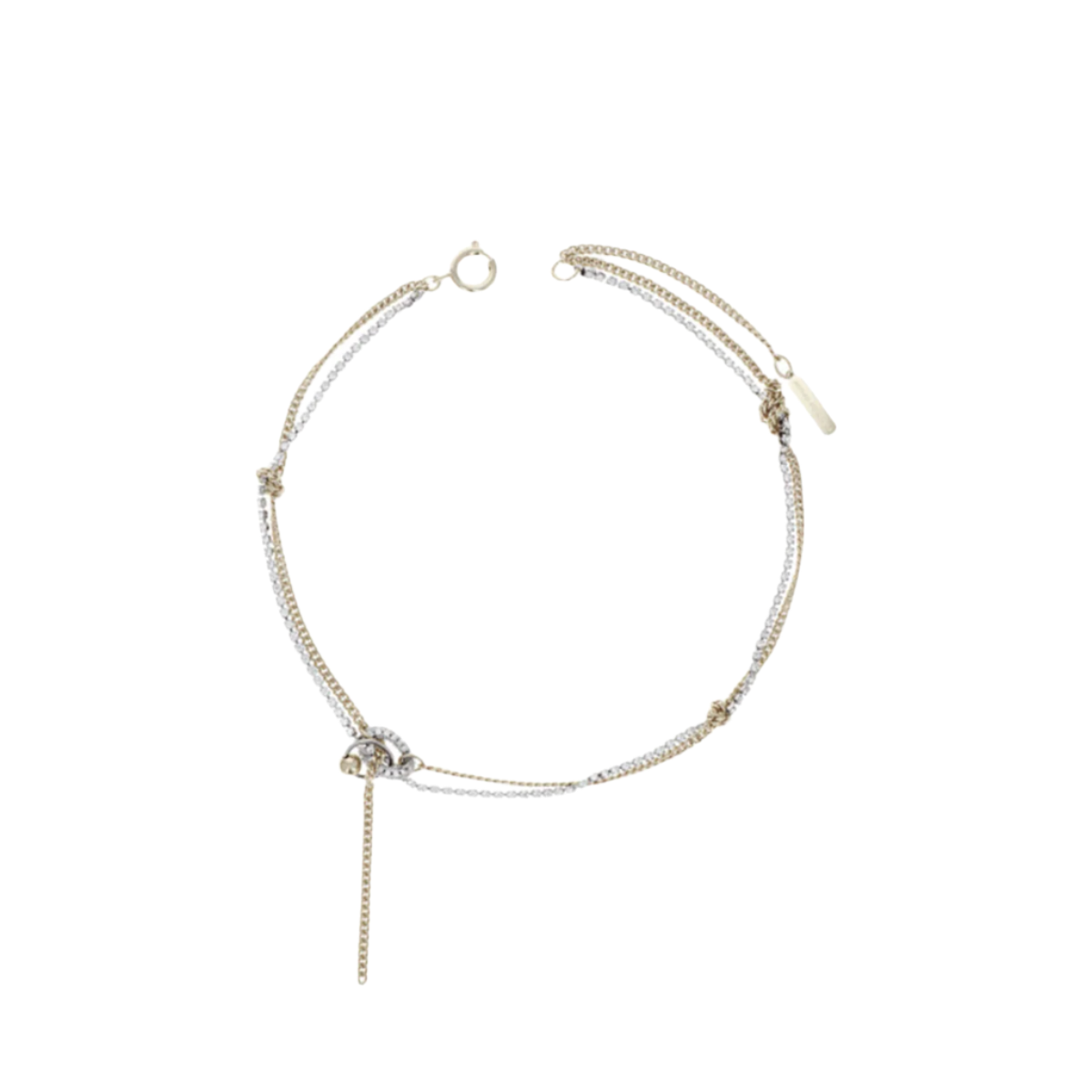 The Amber Necklace by Justine Clenquet features a layered gold and crystal chain design with a cubic zirconia chain knot detail. Adjustable from 39.5cm to 46cm. Designed and made in France.