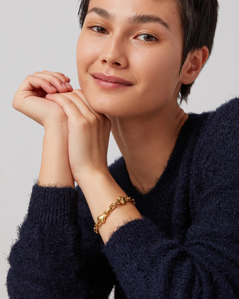 Crisp, faceted links are punctuated with small voluminous hearts. Finished in high-polish 14k gold.