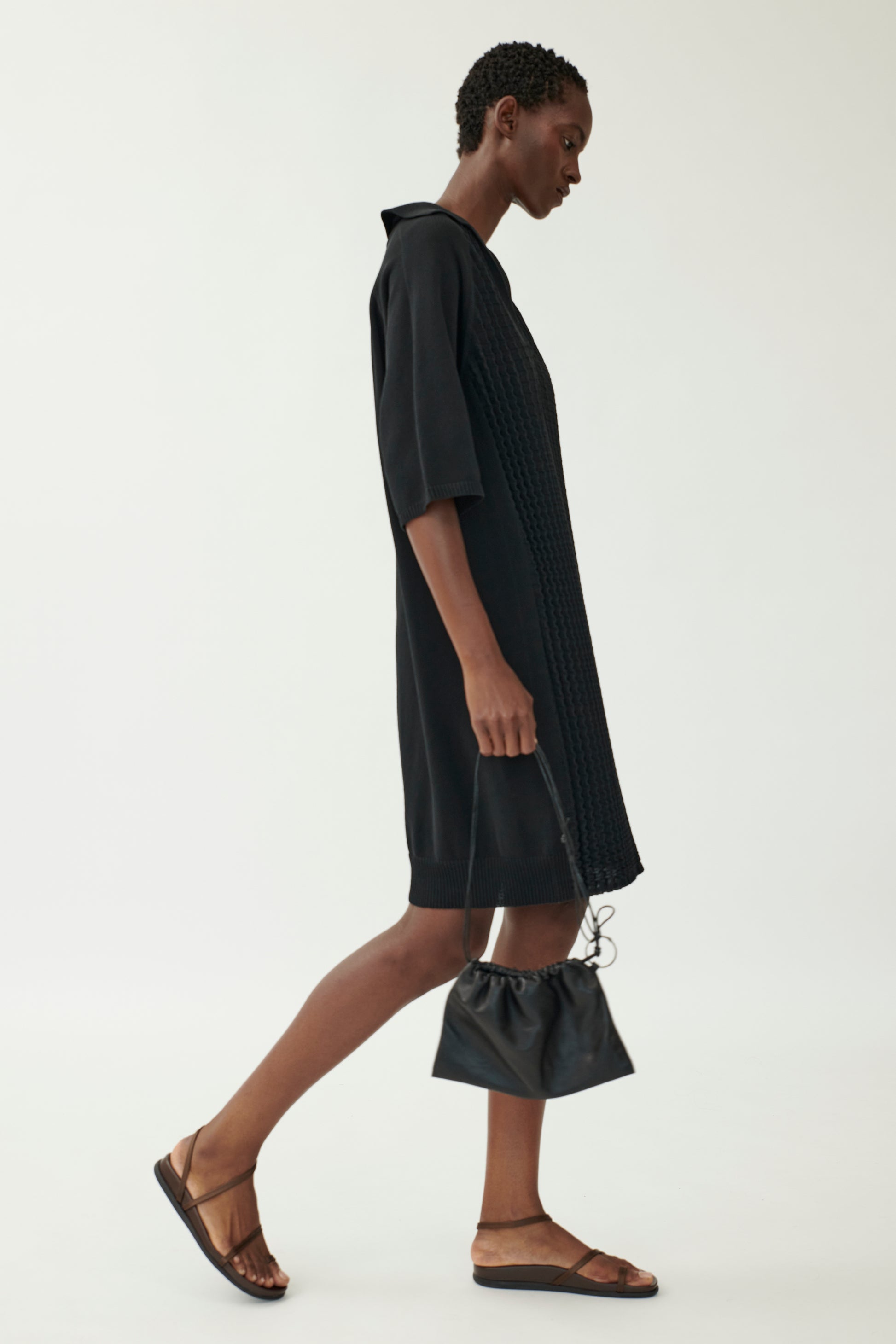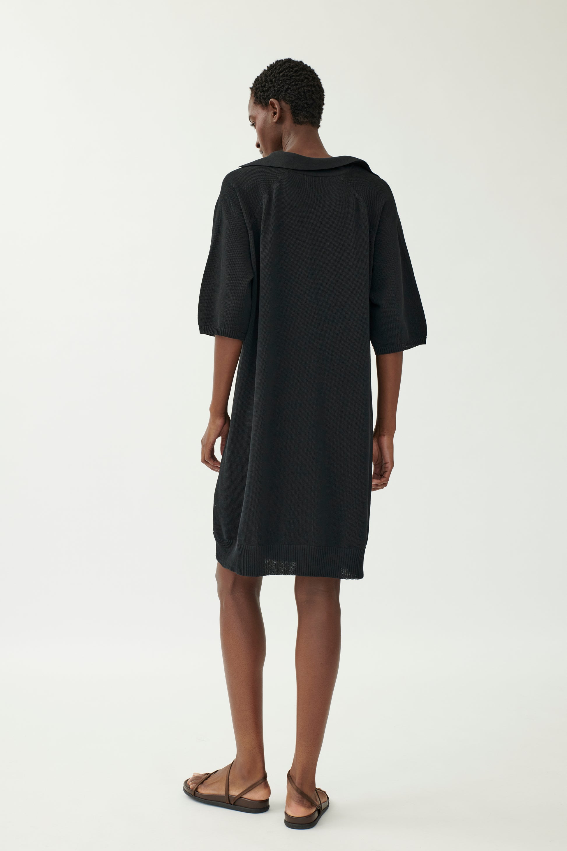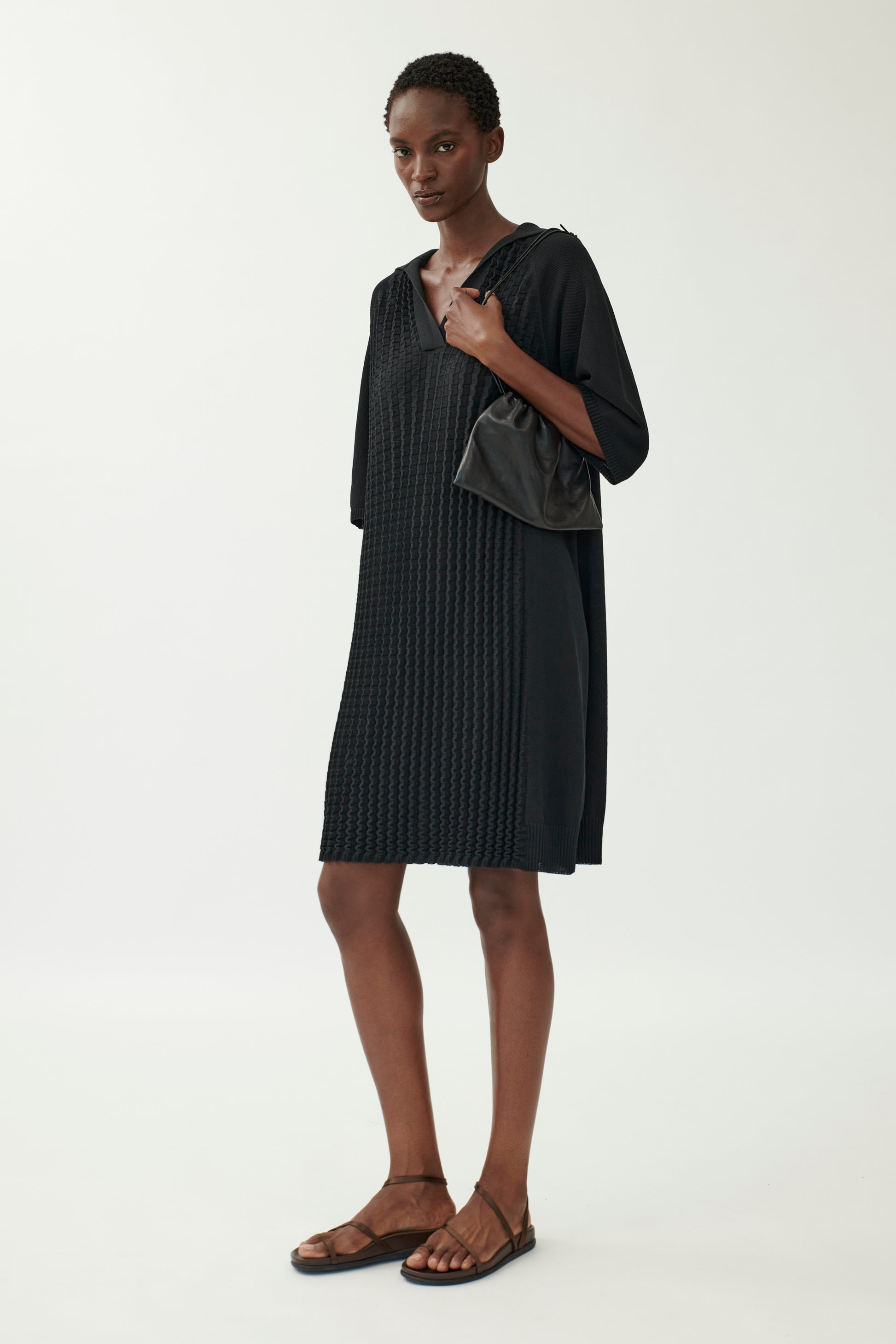 Compact knitted dress made from pure cotton with a structured front. The combination of 3D knit and sporty piqué texture adds visual interest. Features include half-length raglan sleeves and a classic polo collar. Seamless construction reduces fabric waste during production.