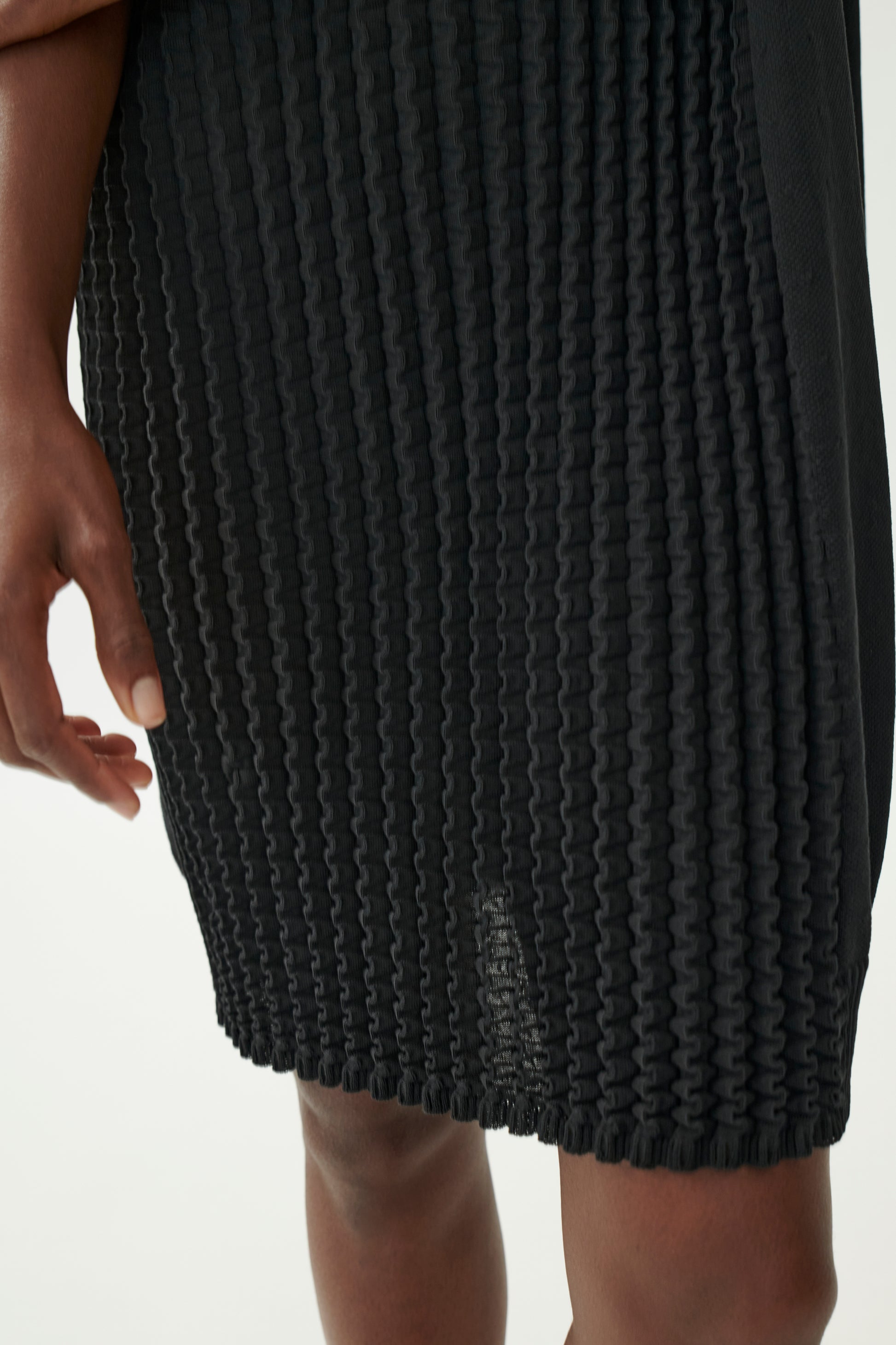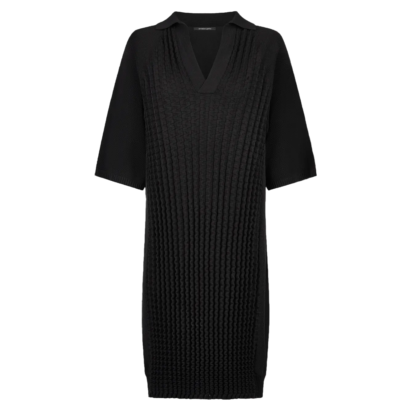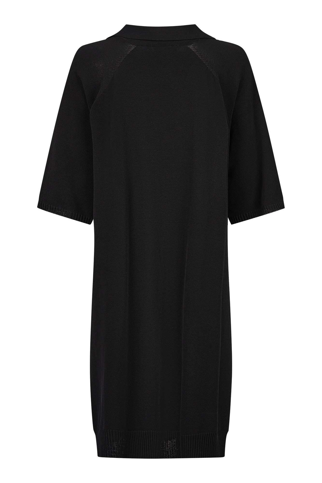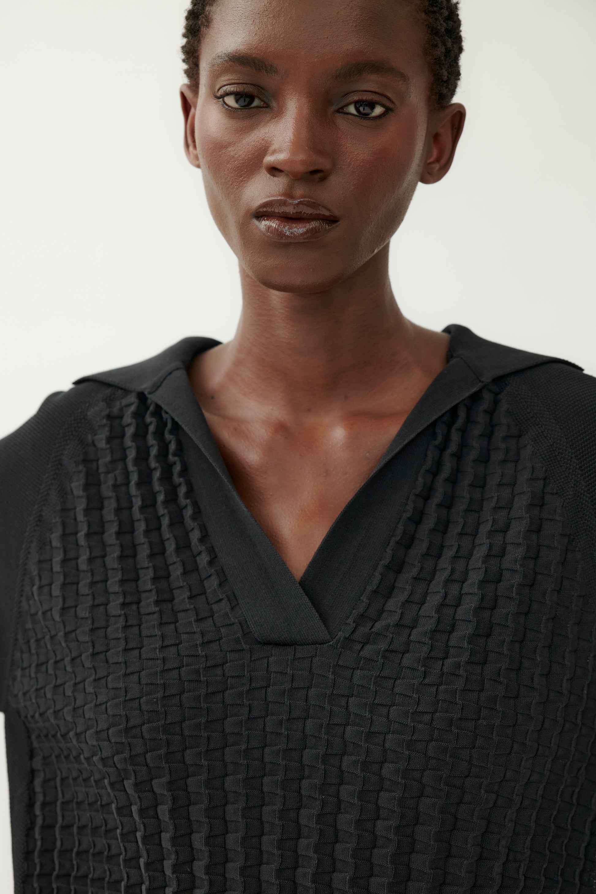 Compact knitted dress made from pure cotton with a structured front. The combination of 3D knit and sporty piqué texture adds visual interest. Features include half-length raglan sleeves and a classic polo collar. Seamless construction reduces fabric waste during production.
