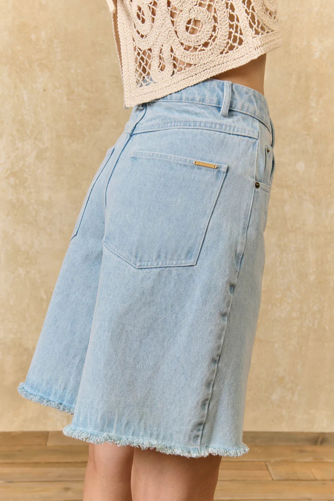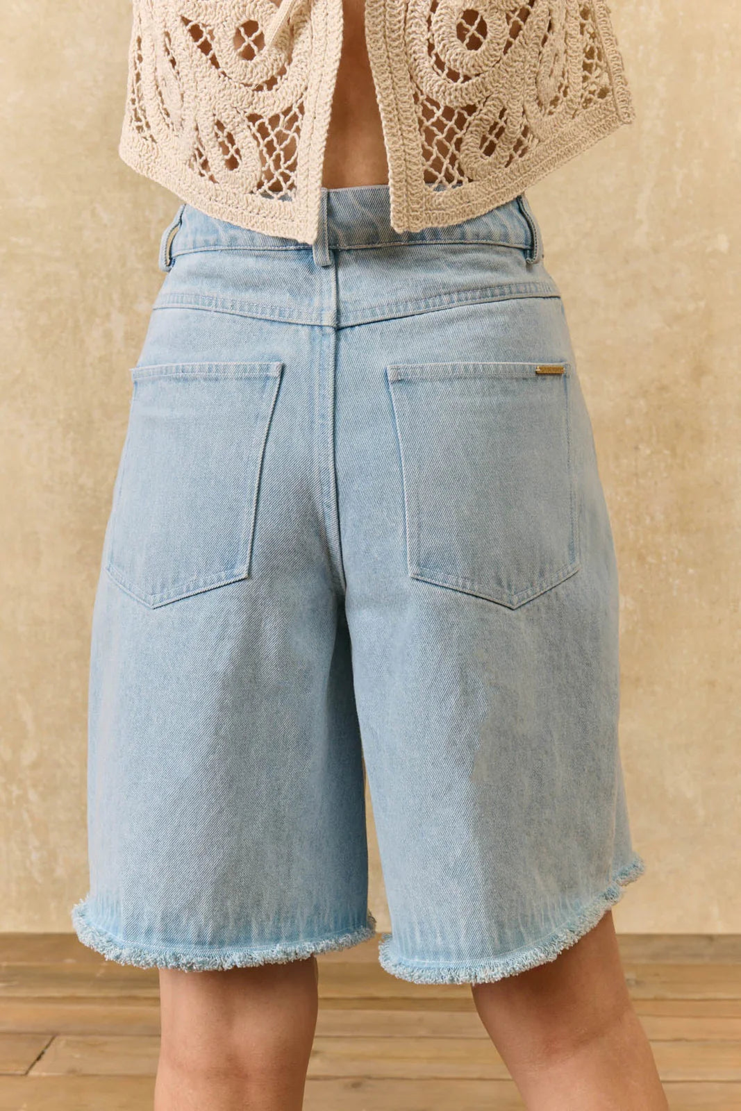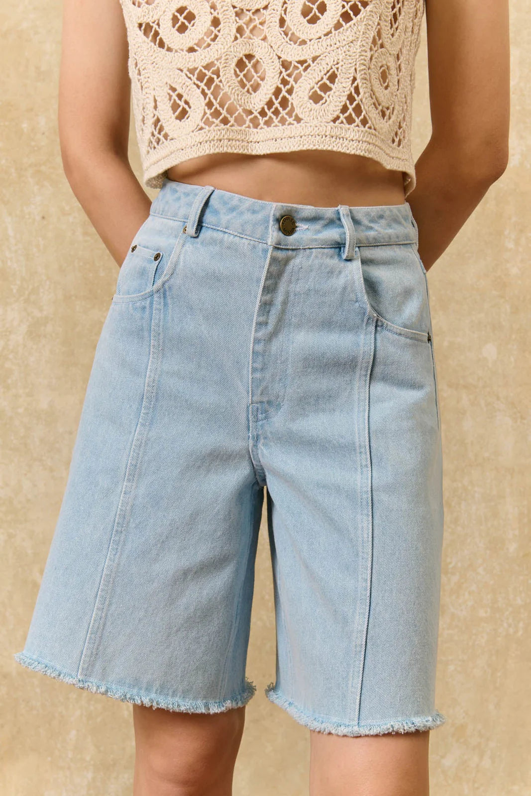 Cut from robust cotton denim, these Sidonie Bermuda shorts designed by Louise Misha captivate with their relaxed fit and contrasting topstitching that punctuates the silhouette. The supple fabric follows every movement naturally, whilst the refined length offers an elegant alternative to traditional jeans. Style with an embroidered blouse or a structured vest for a modern, effortless summer look.