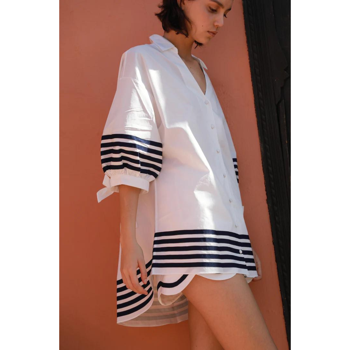 Refresh your classic white shirt with our one-of-a-kind cotton Beach Shirt. It's voluminous dropped sleeves and navy ribbon detailing set it up apart from other traditional styles. Our Beach Shirt offers unparalleled comfort and breathability, the fabric's luxurious softness against the skin makes it a delight to wear all day.
