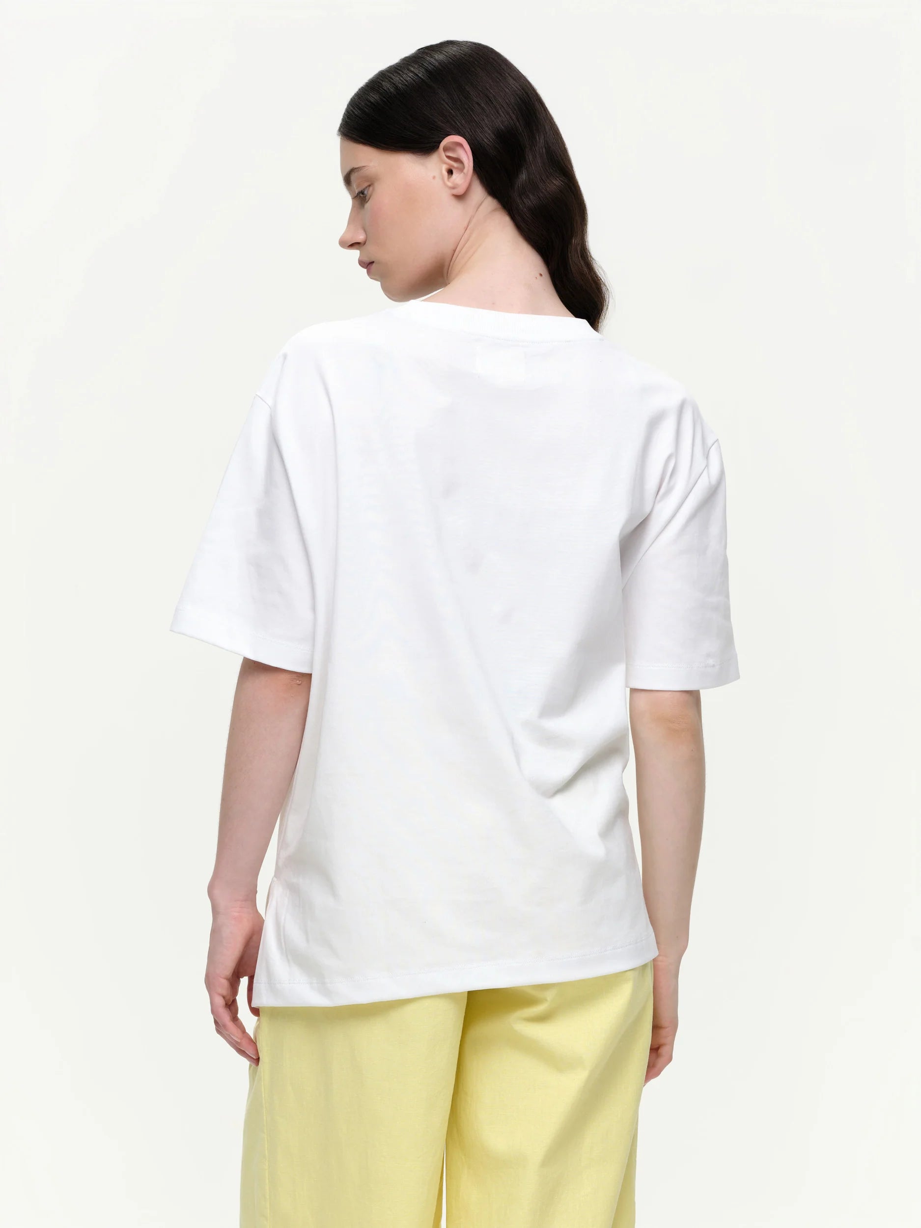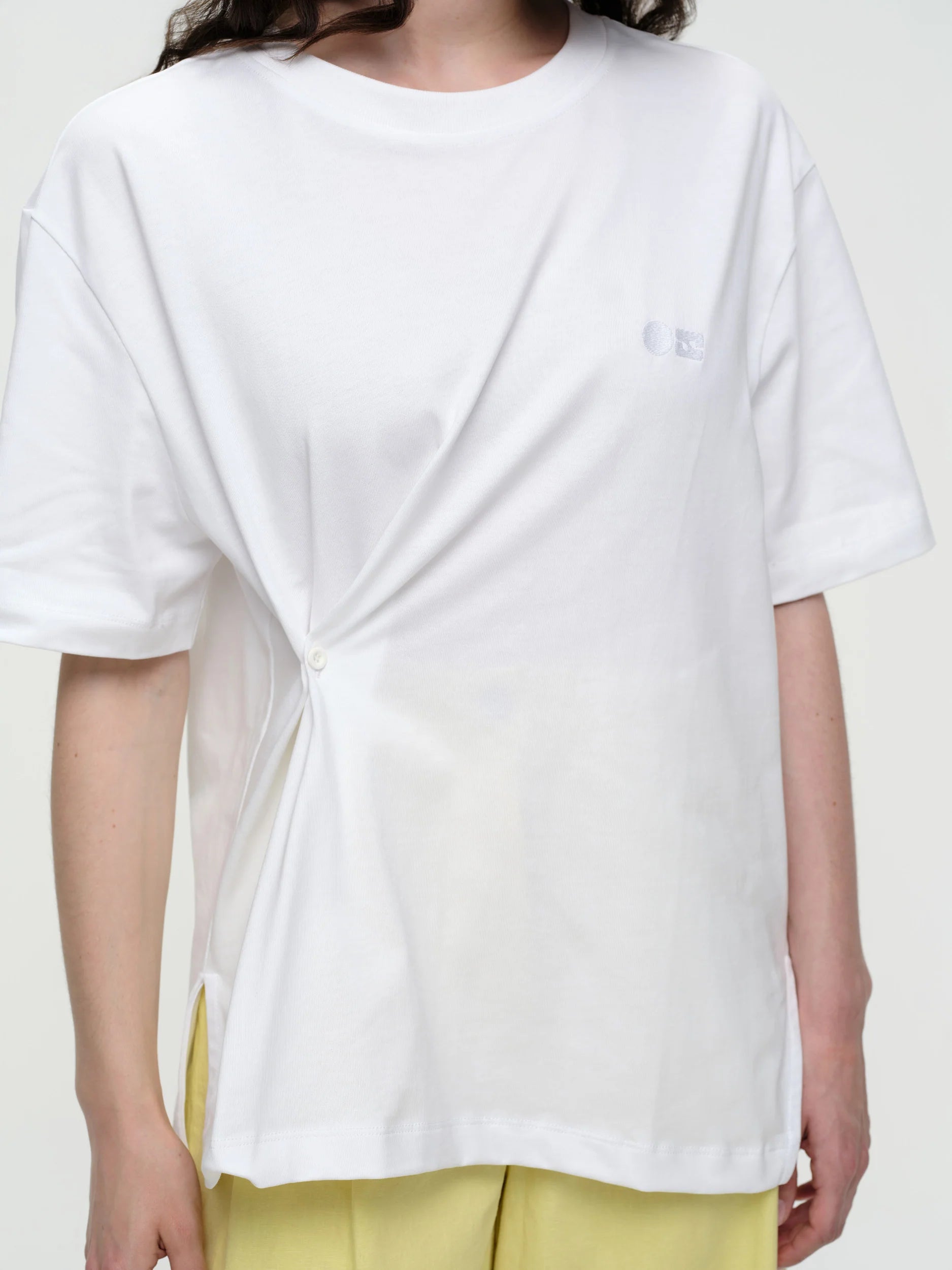 The Veer tee is a relaxed fitting style with a playful twist. Designed with a button detail at the front, it can be worn open for a loose silhouette or buttoned to create a softly draped, cinched waist. A slit opening at the side and an asymmetric hemline add movement and interest, while a tonal Our Sister logo embroidery at the chest completes the look. An effortless everyday tee with a contemporary edge.