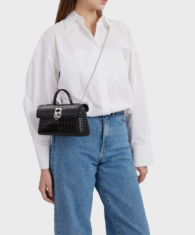 This limited edition Stance Wallet is made in a seasonal material - a croc-embossed leather in Black. The crossbody has a slight sheen, with silver-tone hardware, giving the bag a sleek look. Pair it with the add-on shoulder chain for another look.