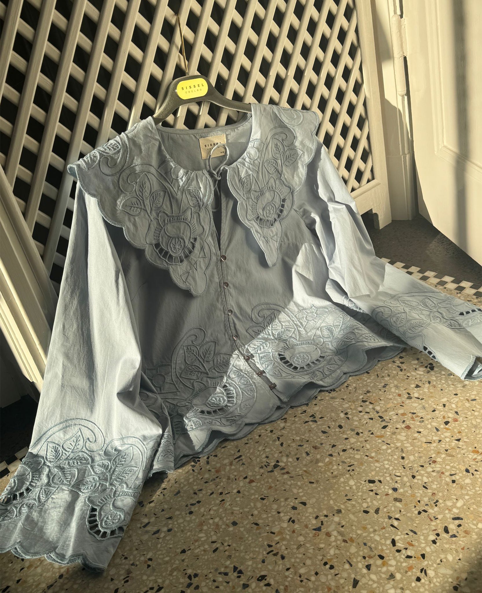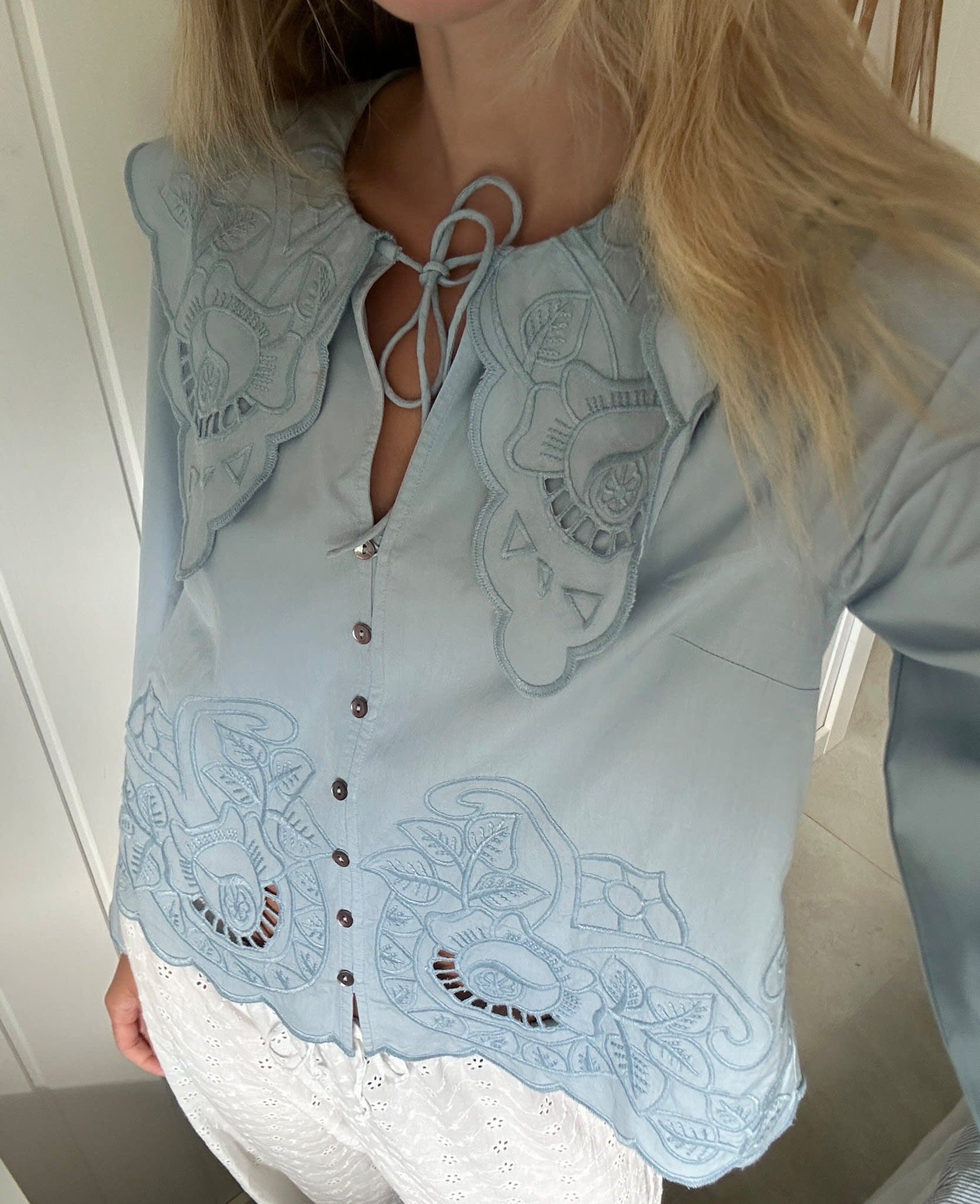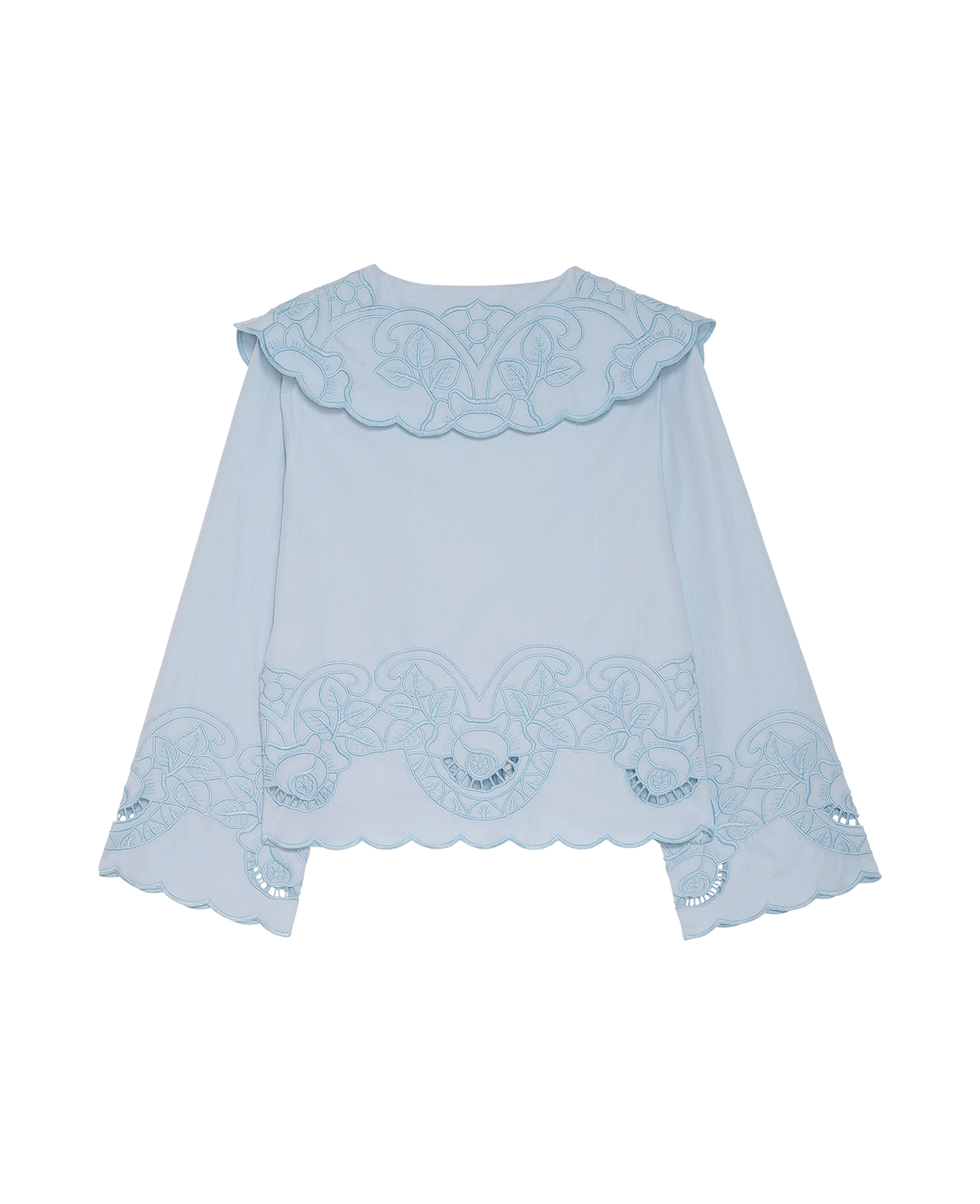 Cameron Top has a casual, feminine fit and is made from 100% organic cotton. It features long, slightly flared sleeves and an oversized collar that lies flat on the body at both the front and back. The top closes with a set of round tie-strings and buttons at the front placket. It is beautifully adorned with cutwork embroidery inspired by a vintage tablecloth, complemented by embroidered scalloped edges in a tone-on-tone shade matching the main fabric.