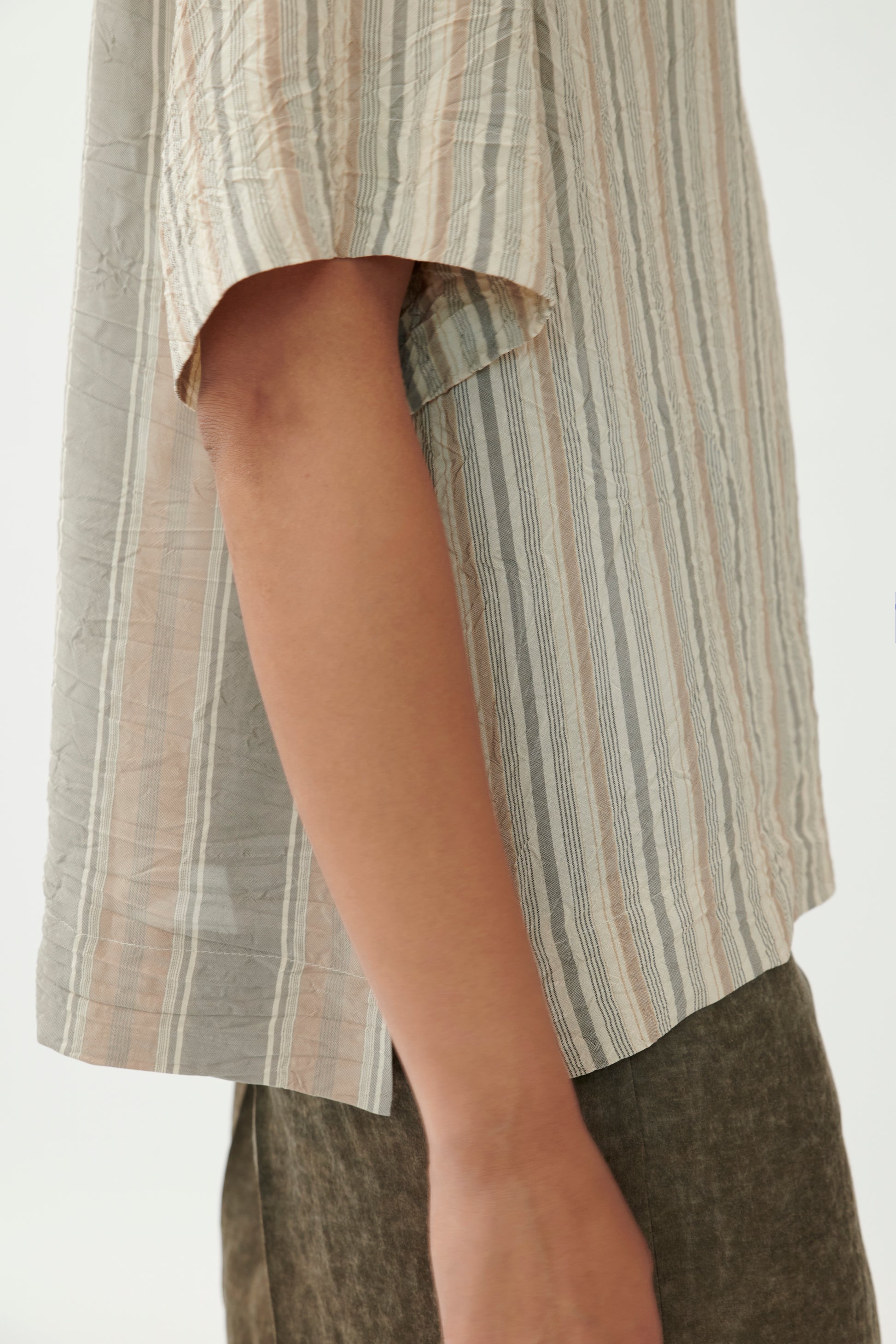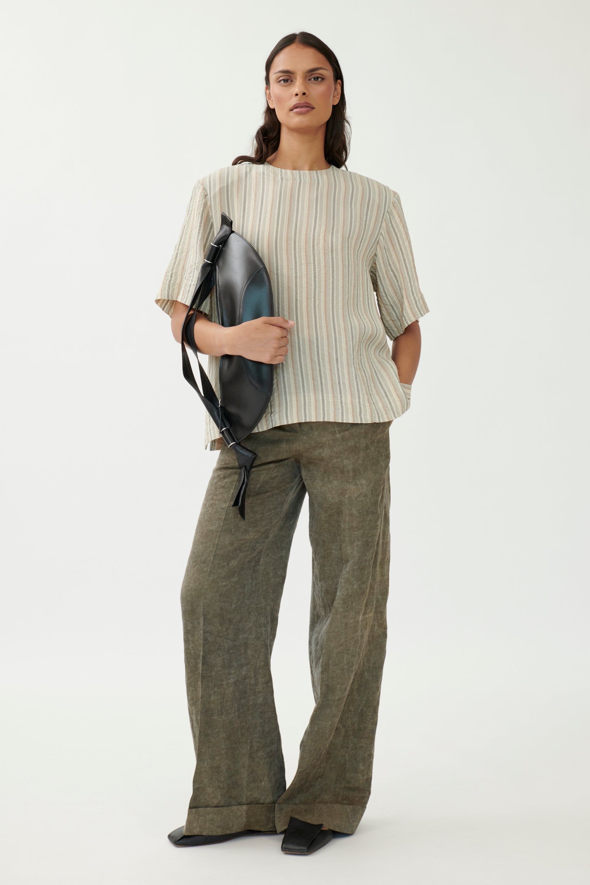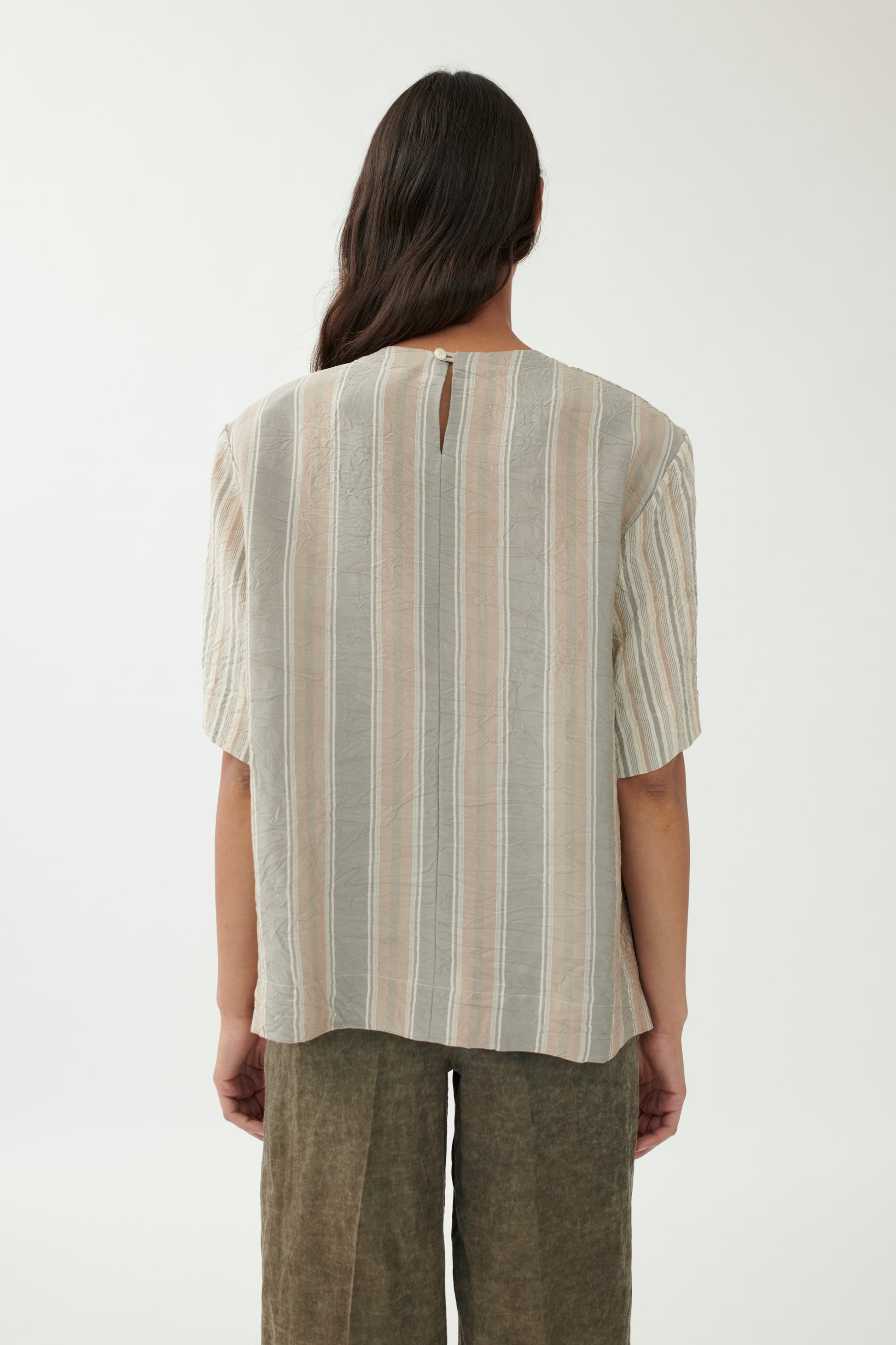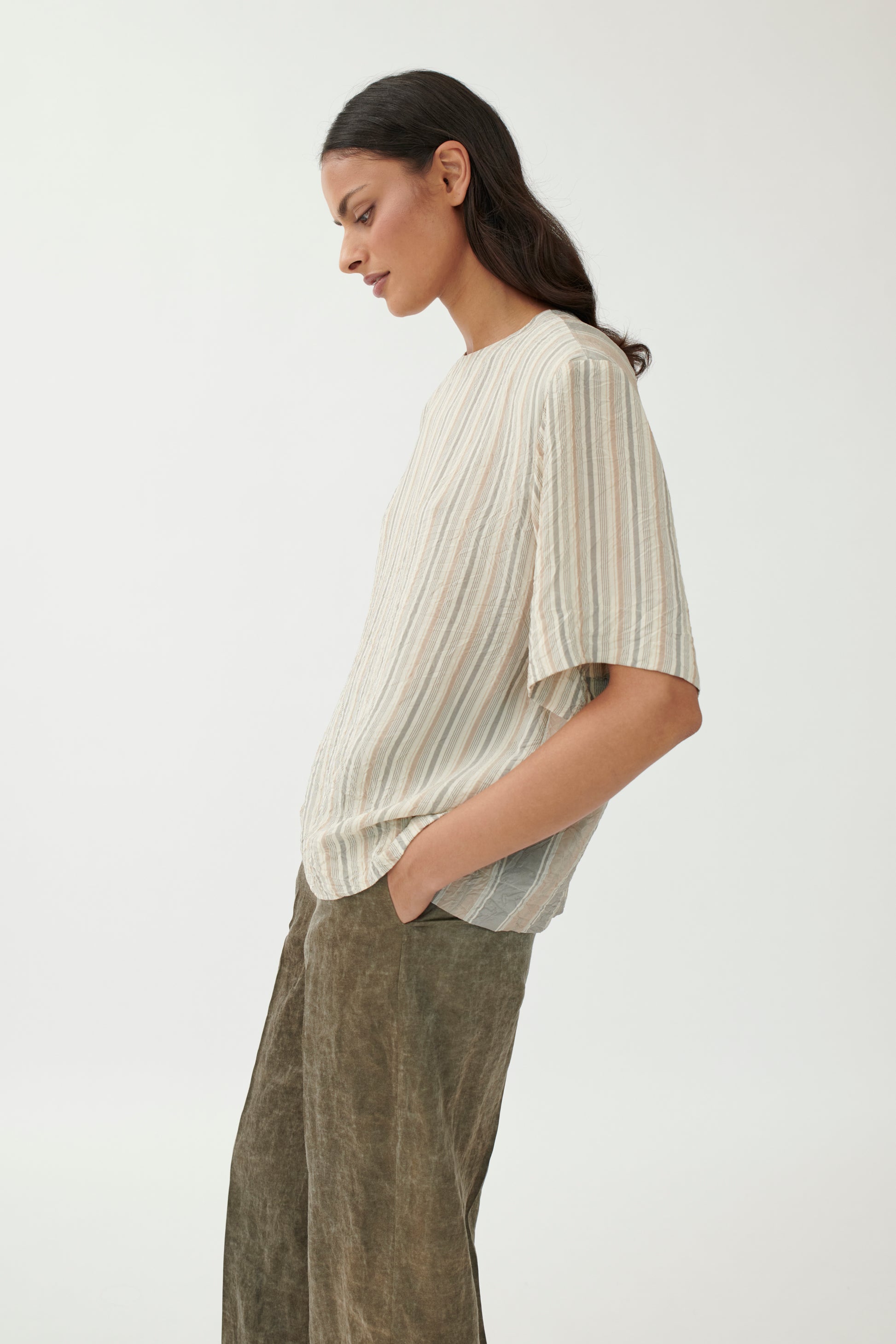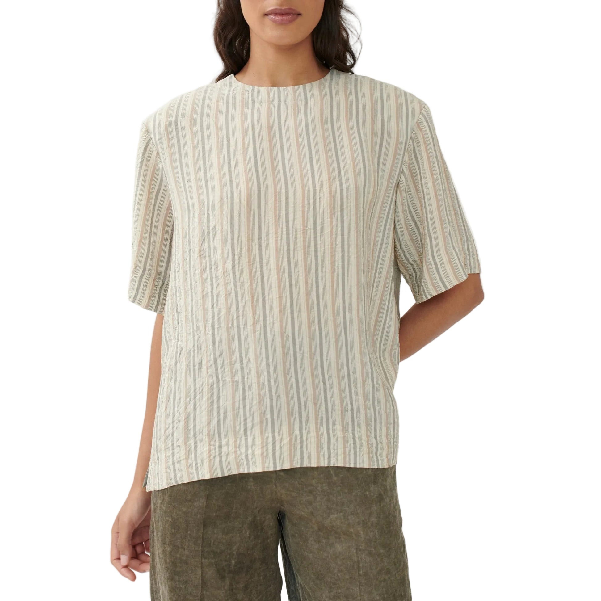 This straight-cut T-shirt blends clean design with subtle structure. Removable shoulder pads create a defined silhouette, while the washed viscose fabric ensures a soft, fluid drape. Contrasting stripe patterns add a graphic edge.