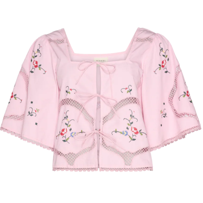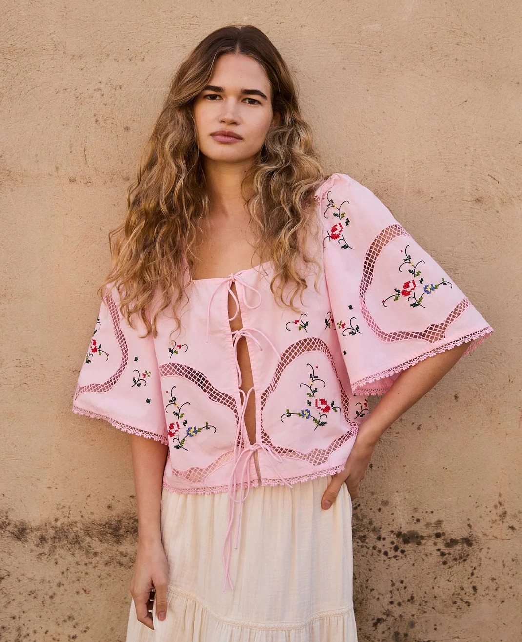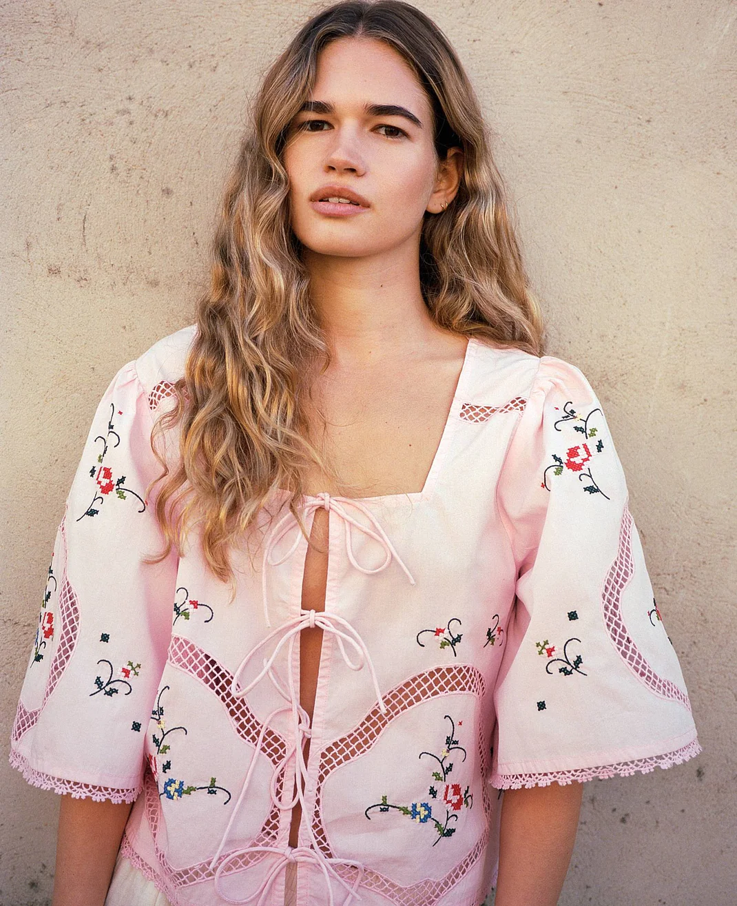 Clematis Top is a feminine piece with elbow-length sleeves made in 100% organic cotton. The sleeves have a wide, flared shape with gathers at the top. The top has a square neckline and tie-front closures. It is adorned with poetic cross-stitched embroidery inspired by a vintage tablecloth and includes transparent lines through its cutwork embroidery. The top is unlined.