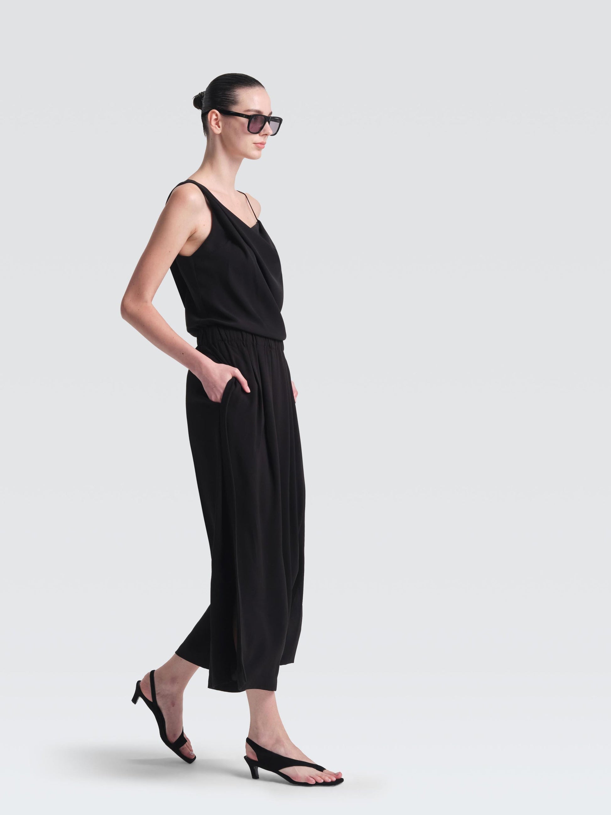 The relaxed cut of these palazzo pants highlights the beautiful flow and drape of the crepe. It is topped with an elasticated waistband and designed with high side splits that make for easy movement; it goes without saying that they're comfy, too.