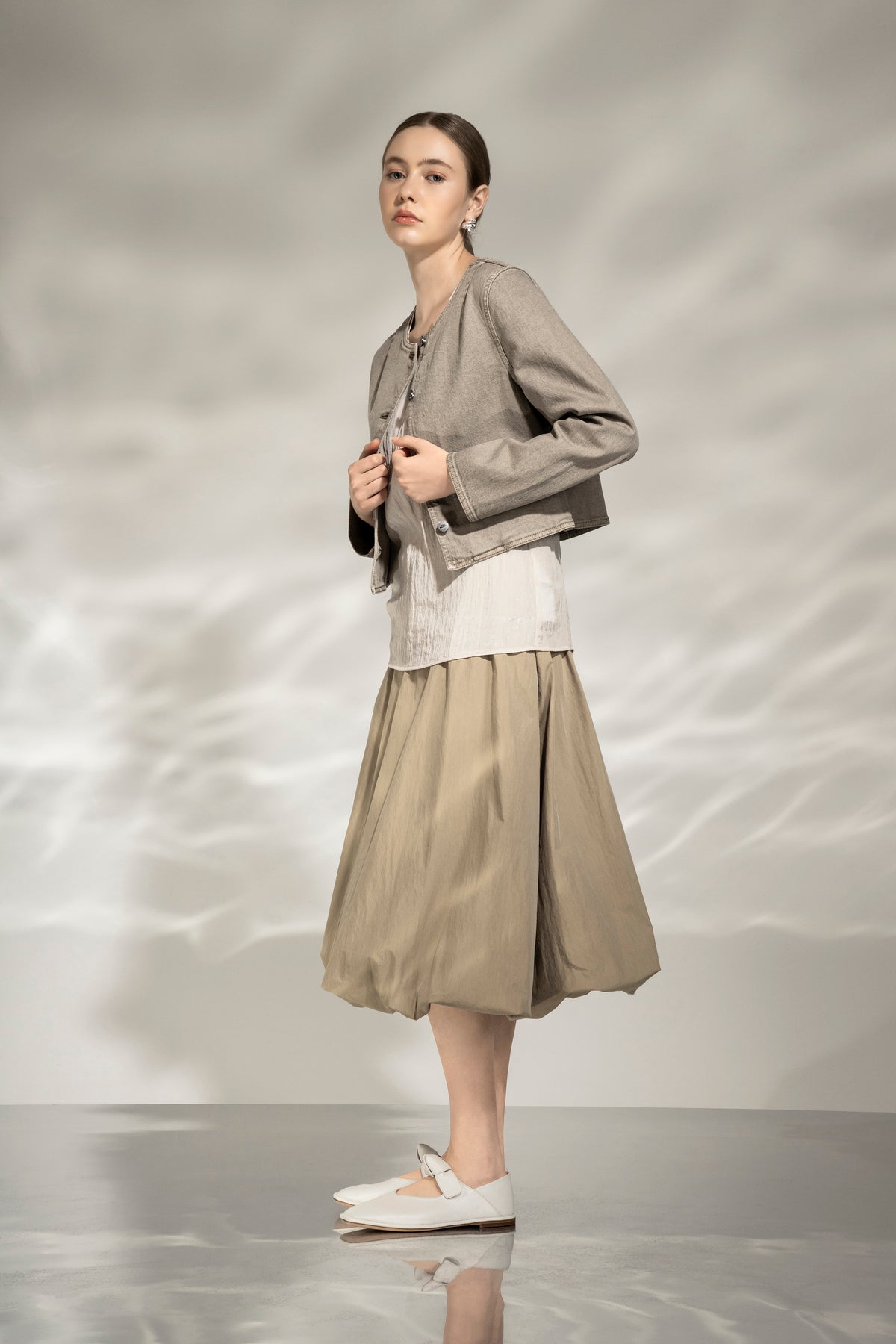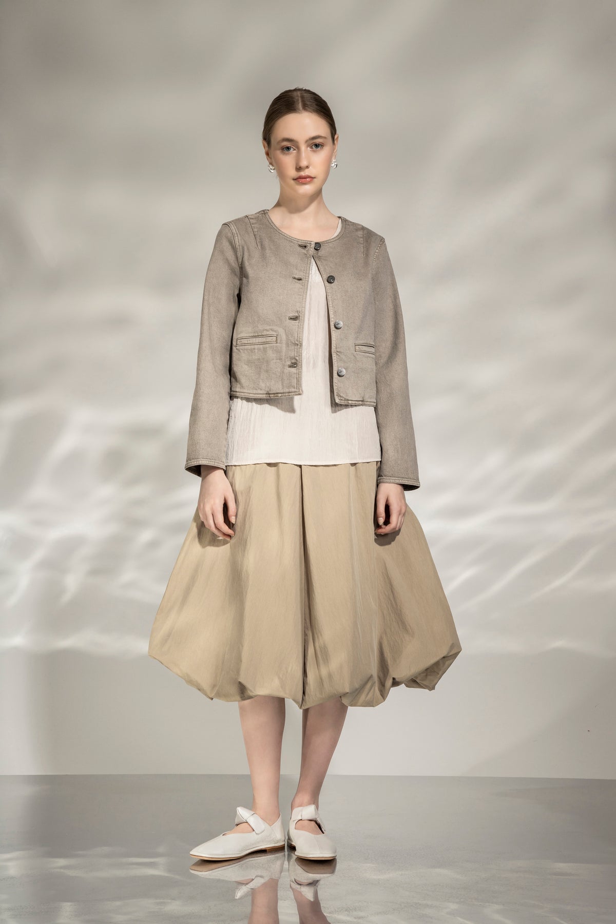Elevate your style with our Cropped Denim Jacket, meticulously crafted for a contemporary appearance. Designed with a distinctive round neckline in a cropped cut, makes it an ideal layering piece over dresses or high-waisted ensembles. Versatile and chic, this jacket is an essential component of any trendsetting wardrobe.