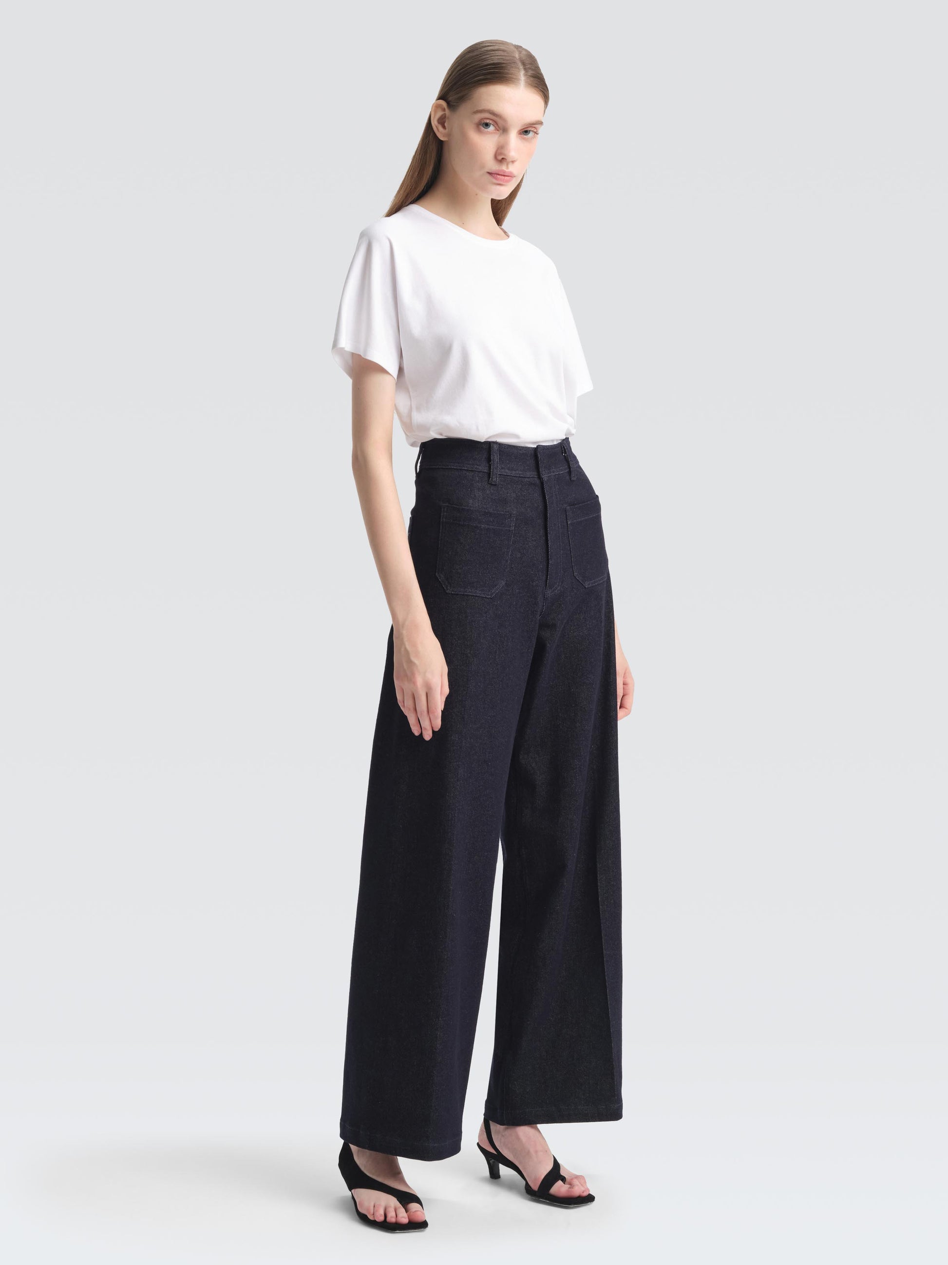 A perennial best-seller, the MUMBAI pants are cut from supple denim in a high-rise, wide-leg silhouette. ’70s-inspired patch pockets and contrast topstitching add character, while the high-rise waist is best showcased with a half-tucked tee for effortless style.