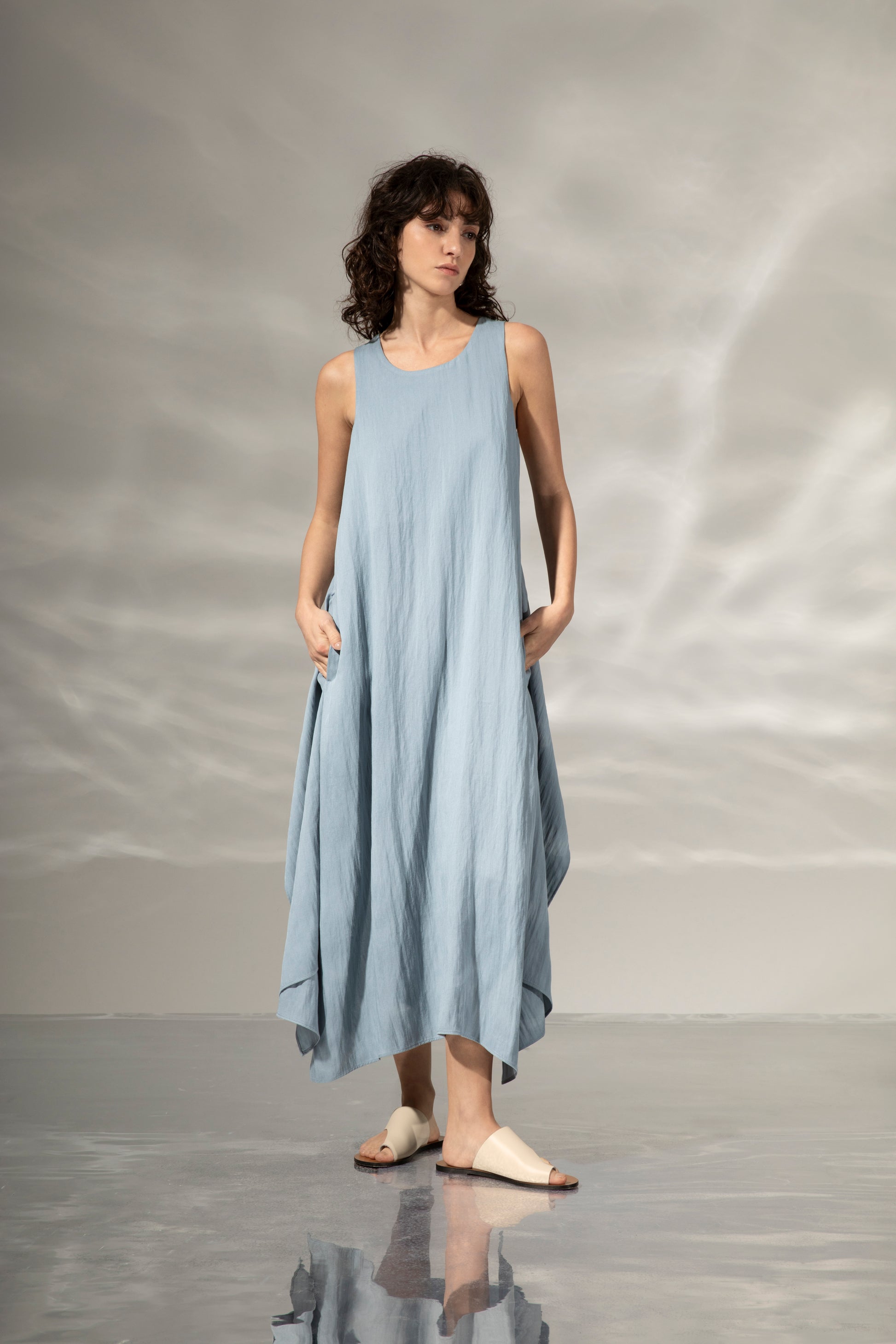 Our Drape Dress is a beautifully sophisticated option that captures the essence of timeless elegance. This sleeveless design showcases a flared asymmetrical hemline, allowing for graceful movement. Crafted with a soft, delicate texture, this dress ensures comforts throughout the day.