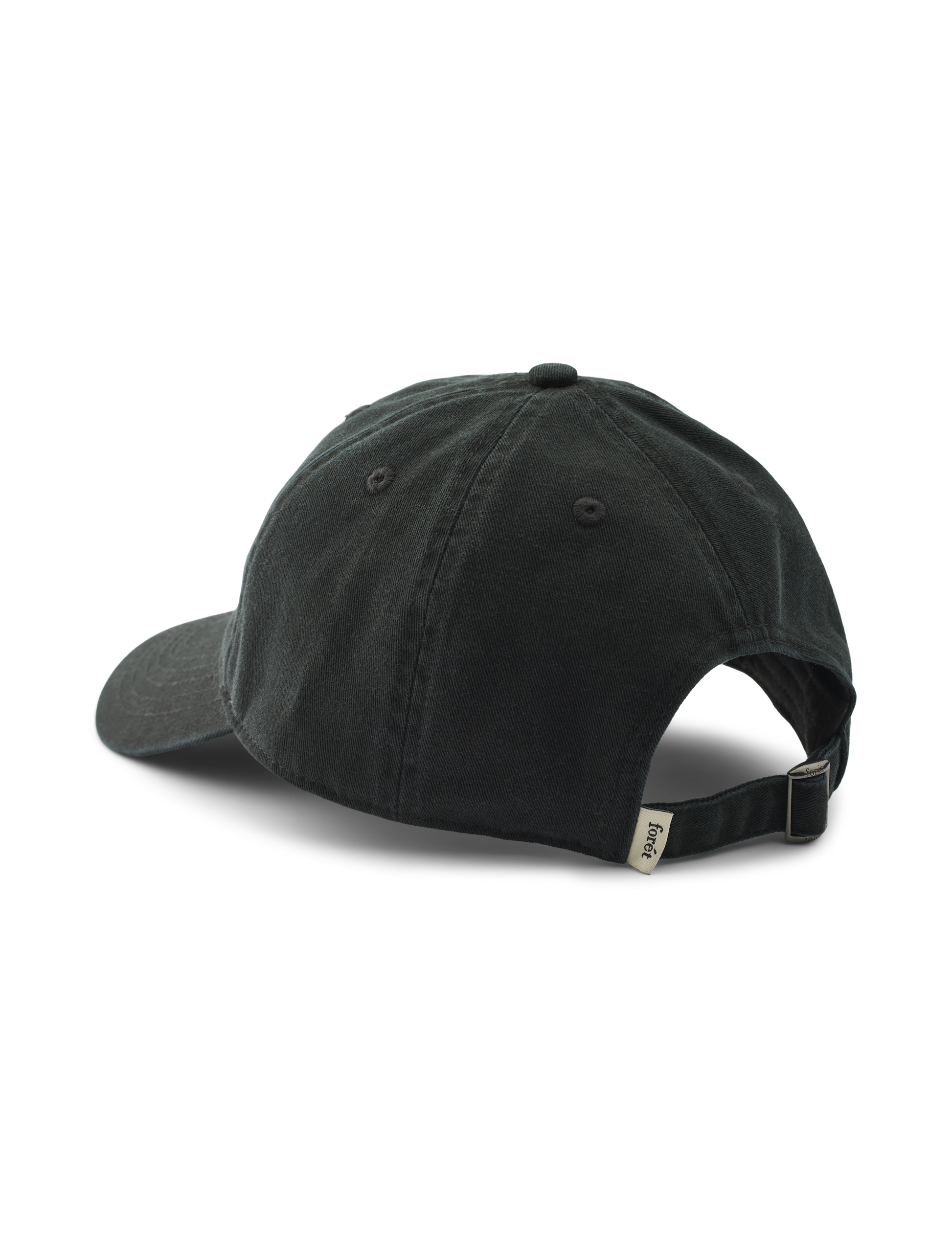 A washed black baseball cap with an embroidered sunflower on the front. Made from cotton with an adjustable strap for a customizable fit. Casual and simple, with a worn-in look