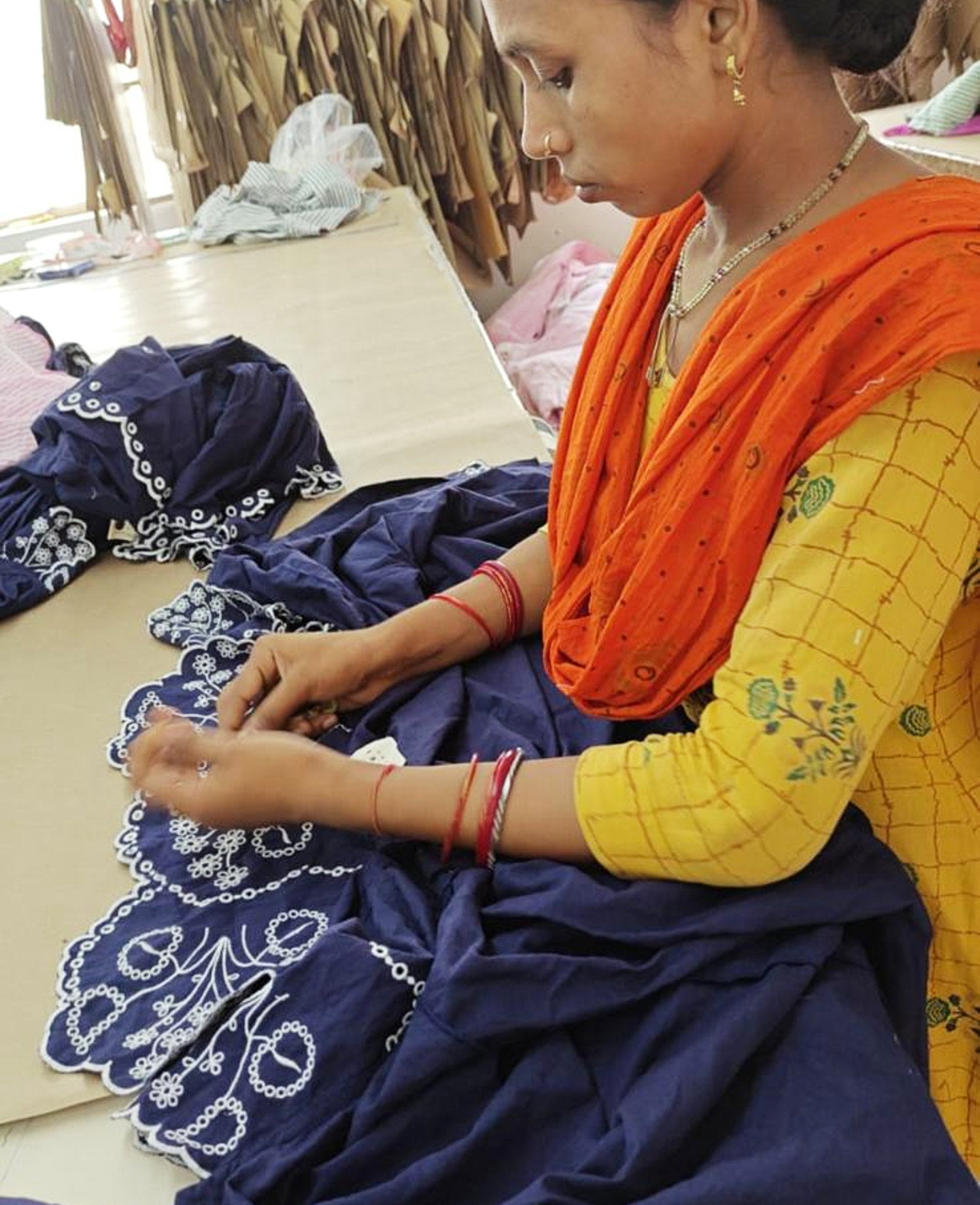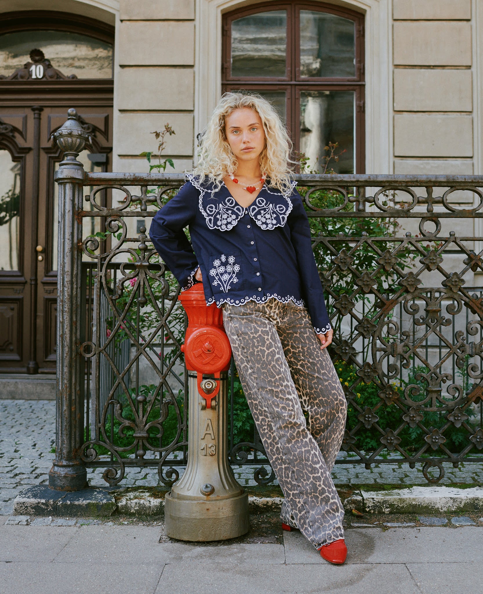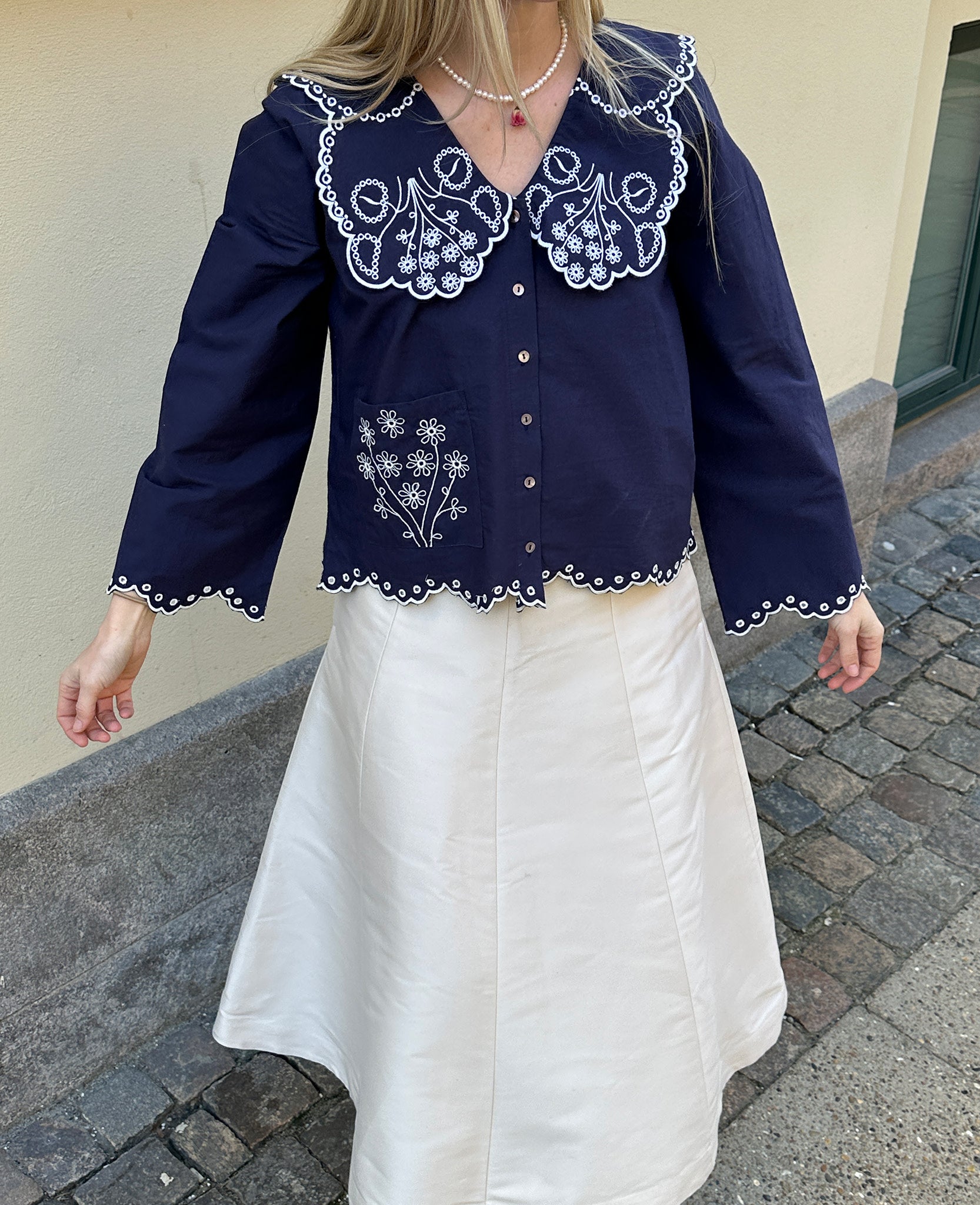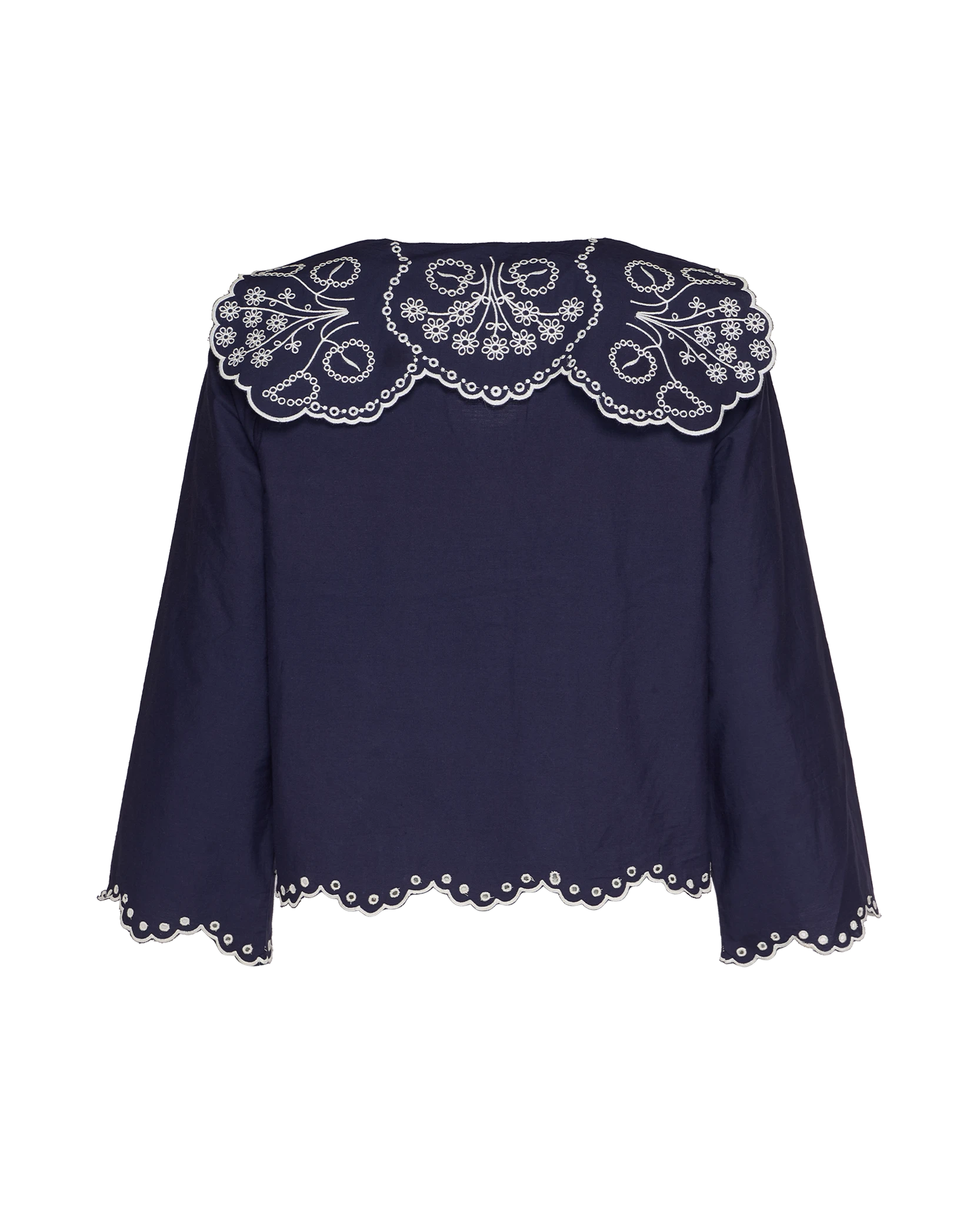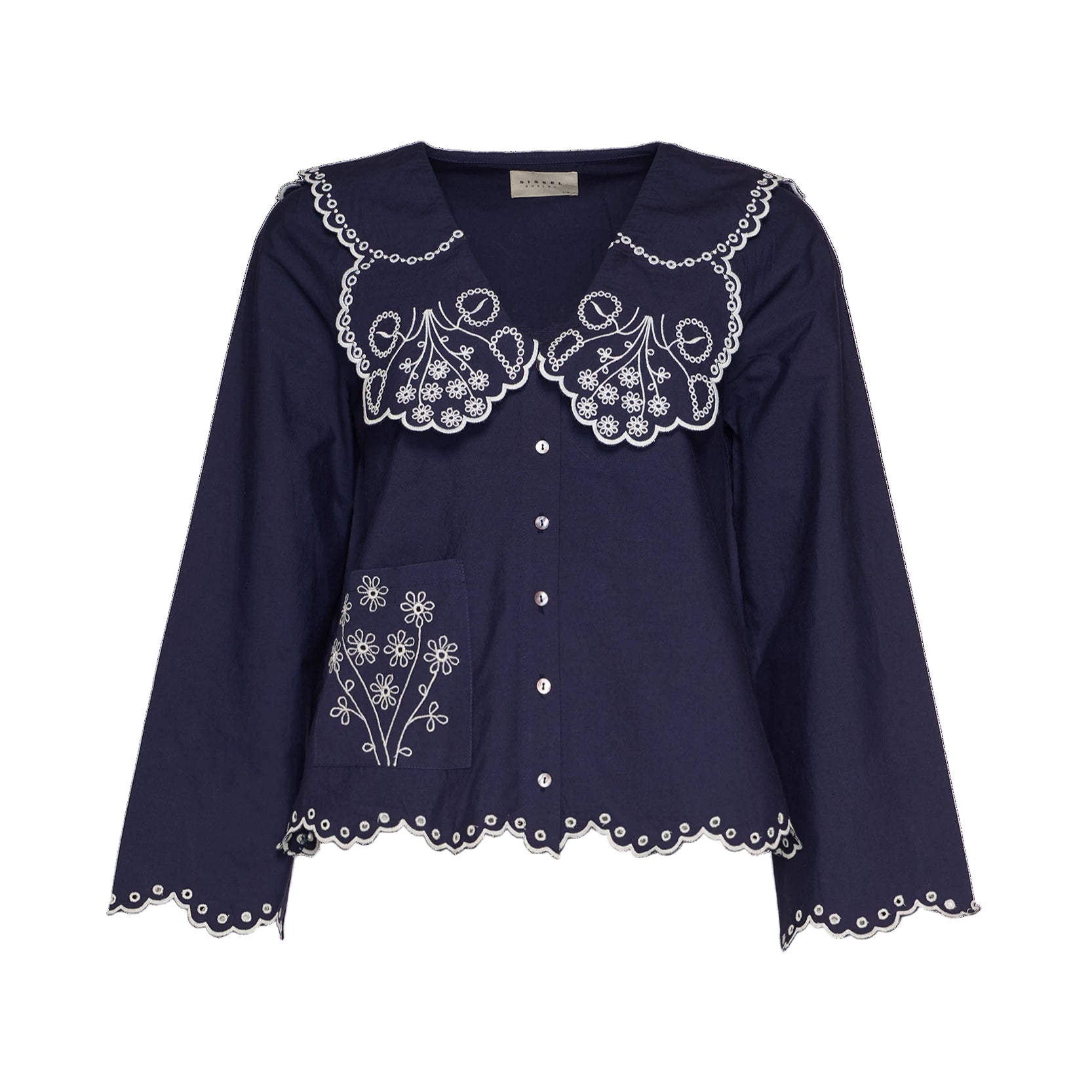 Elysia Shirt is a feminine shirt made in 100% organic cotton. It features long, straight sleeves and a V-neckline with an oversized collar. The front placket is adorned with dark mother-of-pearl buttons. The shirt is decorated with beautiful cutwork embroidery, inspired by a vintage tablecloth, on the collar and front pocket, along with embroidered scalloped edges at the bottom and sleeve hems.