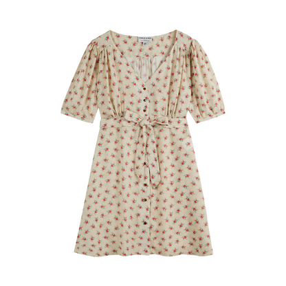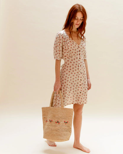 Off-white viscose blouse dress featuring bouquets of red and yellow flowers. We love the supple, fluid fabric, the V-neckline and the gathers that stretch from the front to the back between the lined yoke and the waistband, giving structure to the bodice. The short sleeves are finished with a thin cuff that closes with a button. As the bodice clings to a gently flared skirt, it transforms into a dress. The button placket begins on the bodice and continues to the bottom of the skirt. To finish, close the natural mother-of-pearl buttons, tie the belt at the waist, and the day can begin, inflated by the power of flowers.