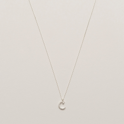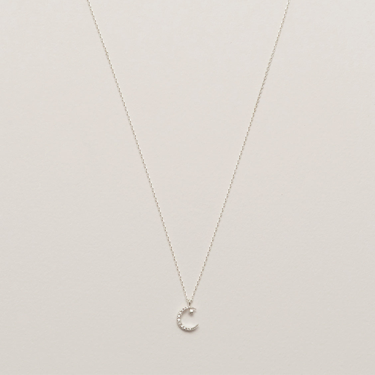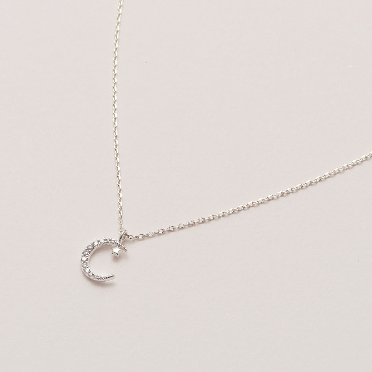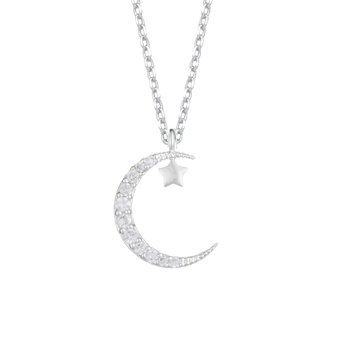 This Moon and Star Necklace features a silver plated crescent moon with a star.