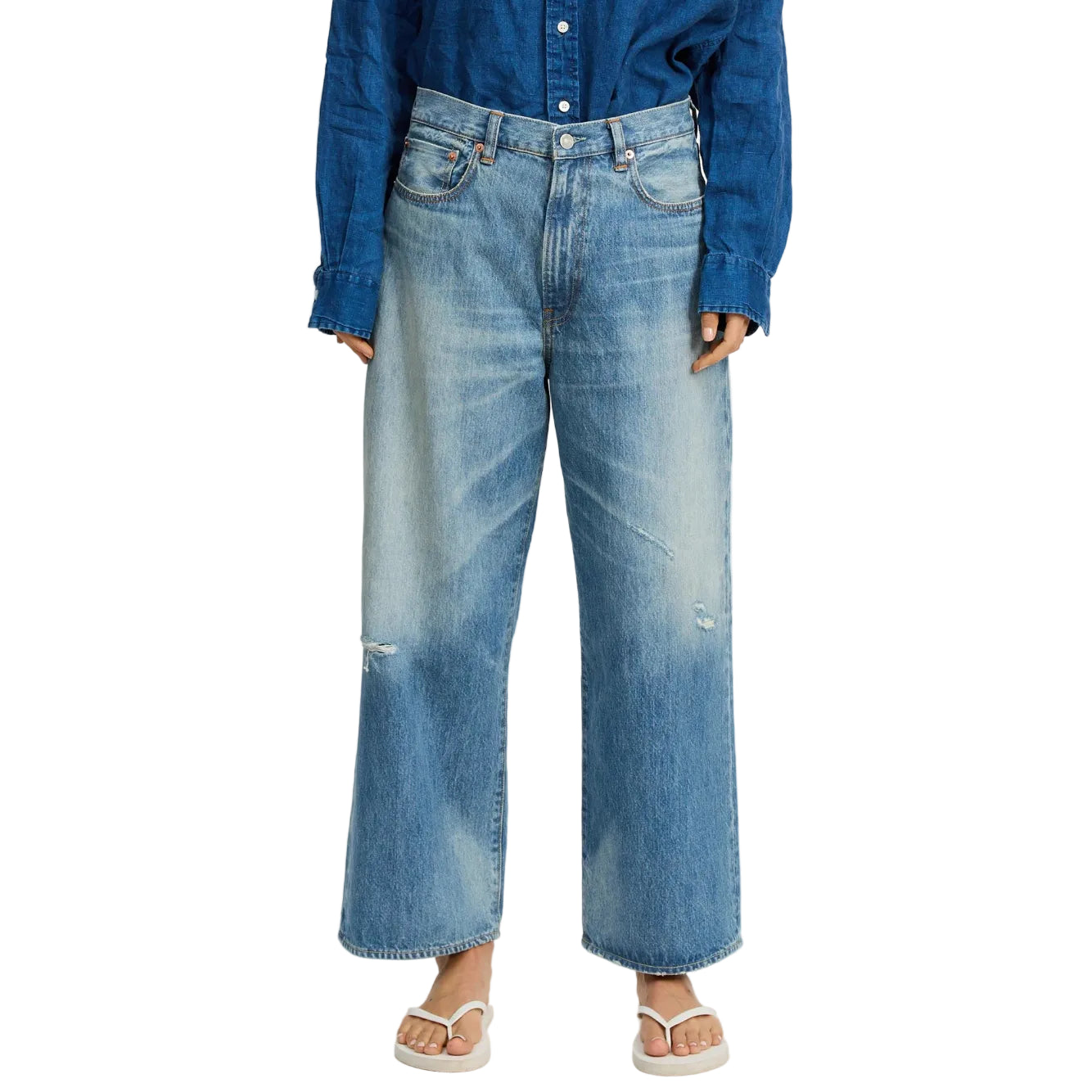 Mid-rise jean with a relaxed fit through the hip and thigh and a wide leg that hits at the ankle. Finished in a faded Glenmore Blue wash with light distressing and classic five-pocket styling.