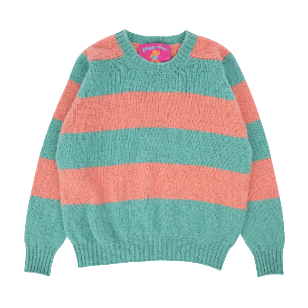 This 'Shaggy Bear' chunky knit sweater for women by Howlin features mint lover stripes.