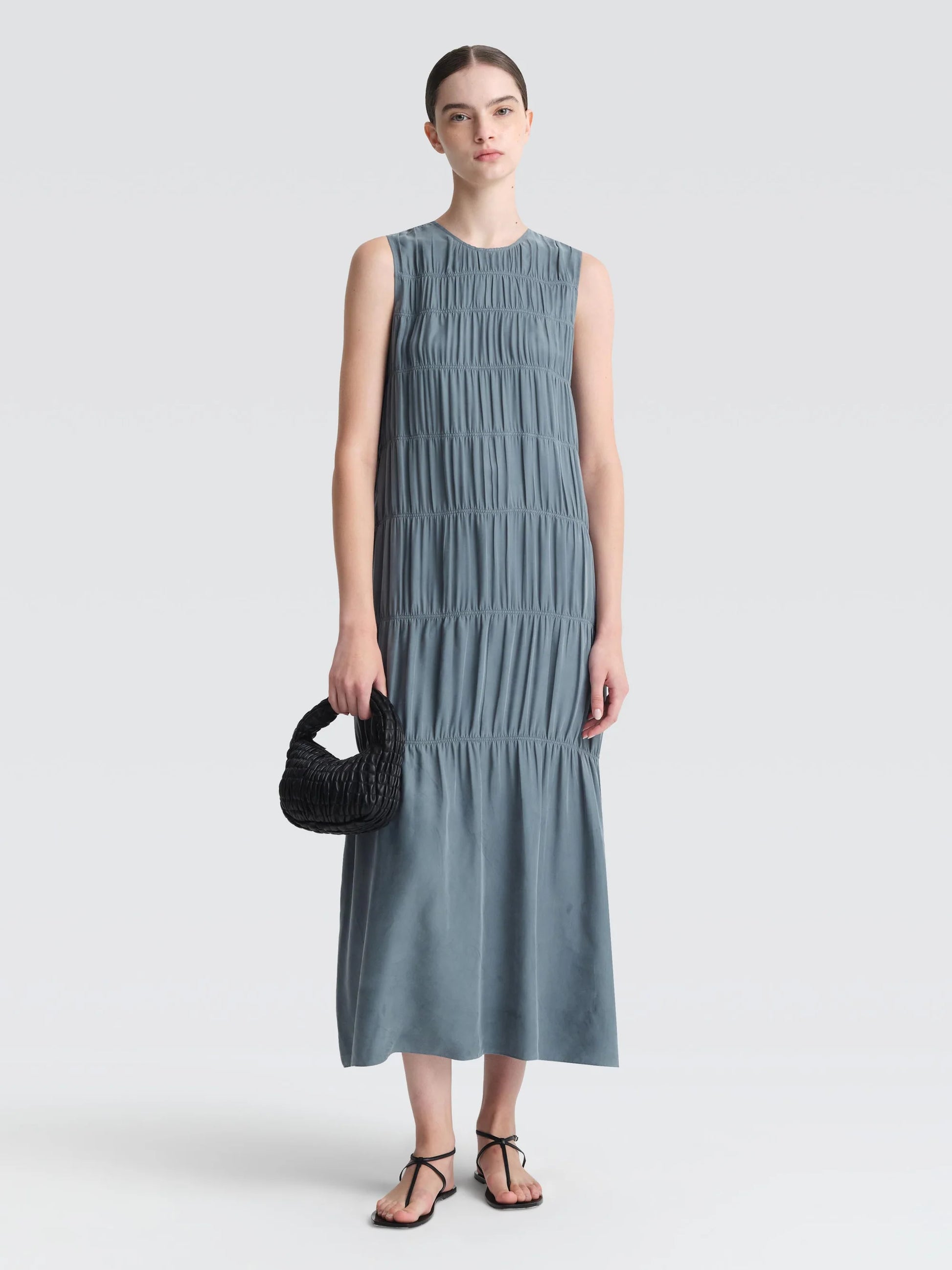 This luxe cupro midi dress radiates timeless elegance with its sleek column silhouette. Featuring exquisite shirring throughout, it pairs perfectly with barely-there sandals and can be layered with a blazer for a polished look.